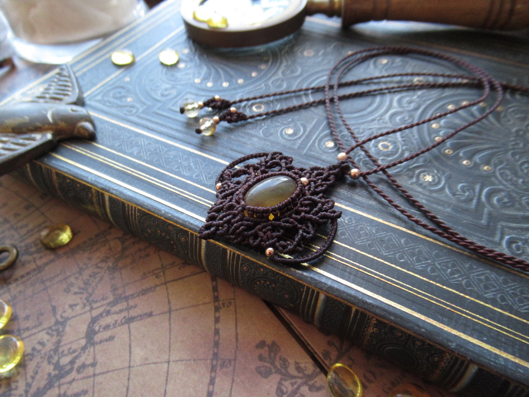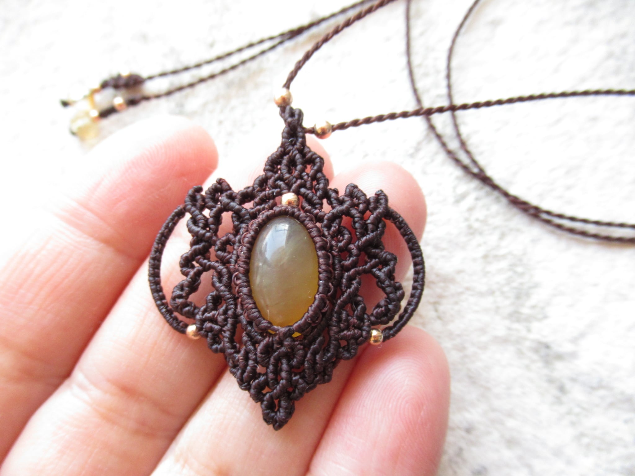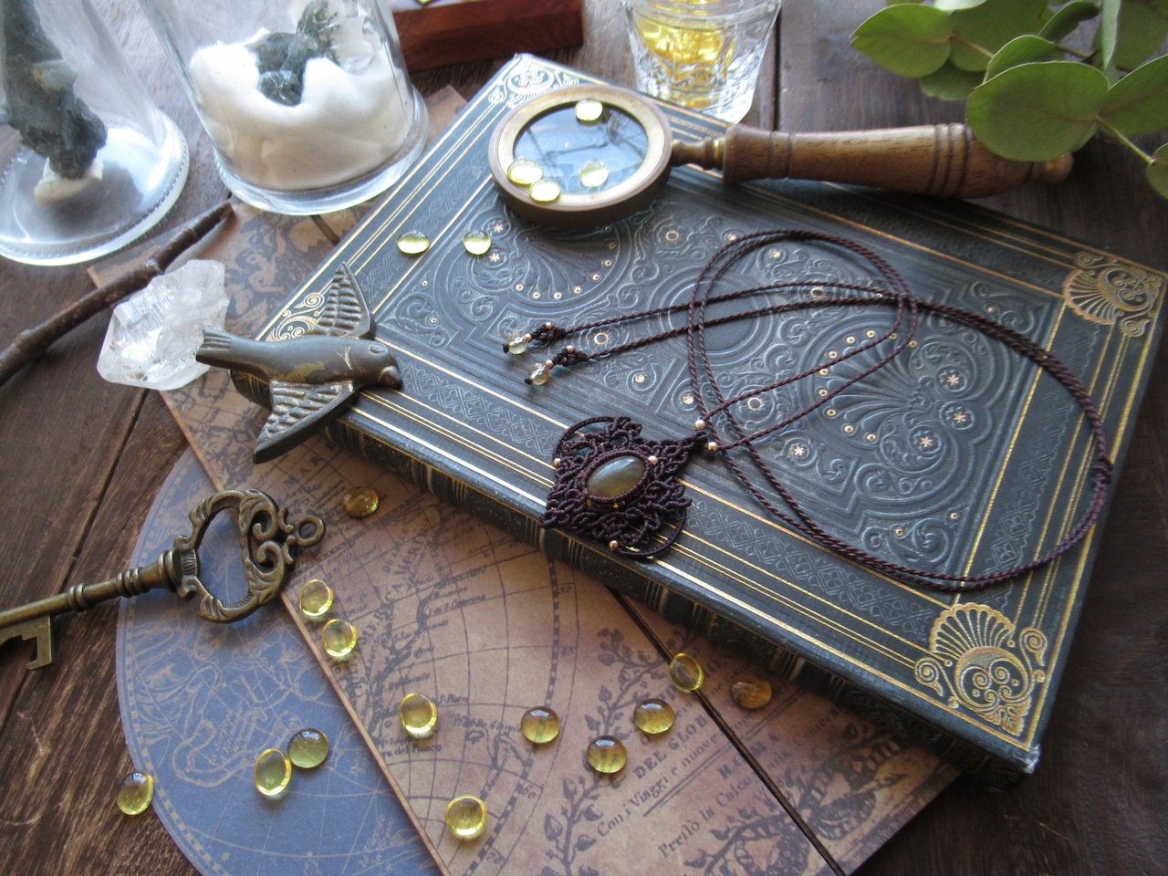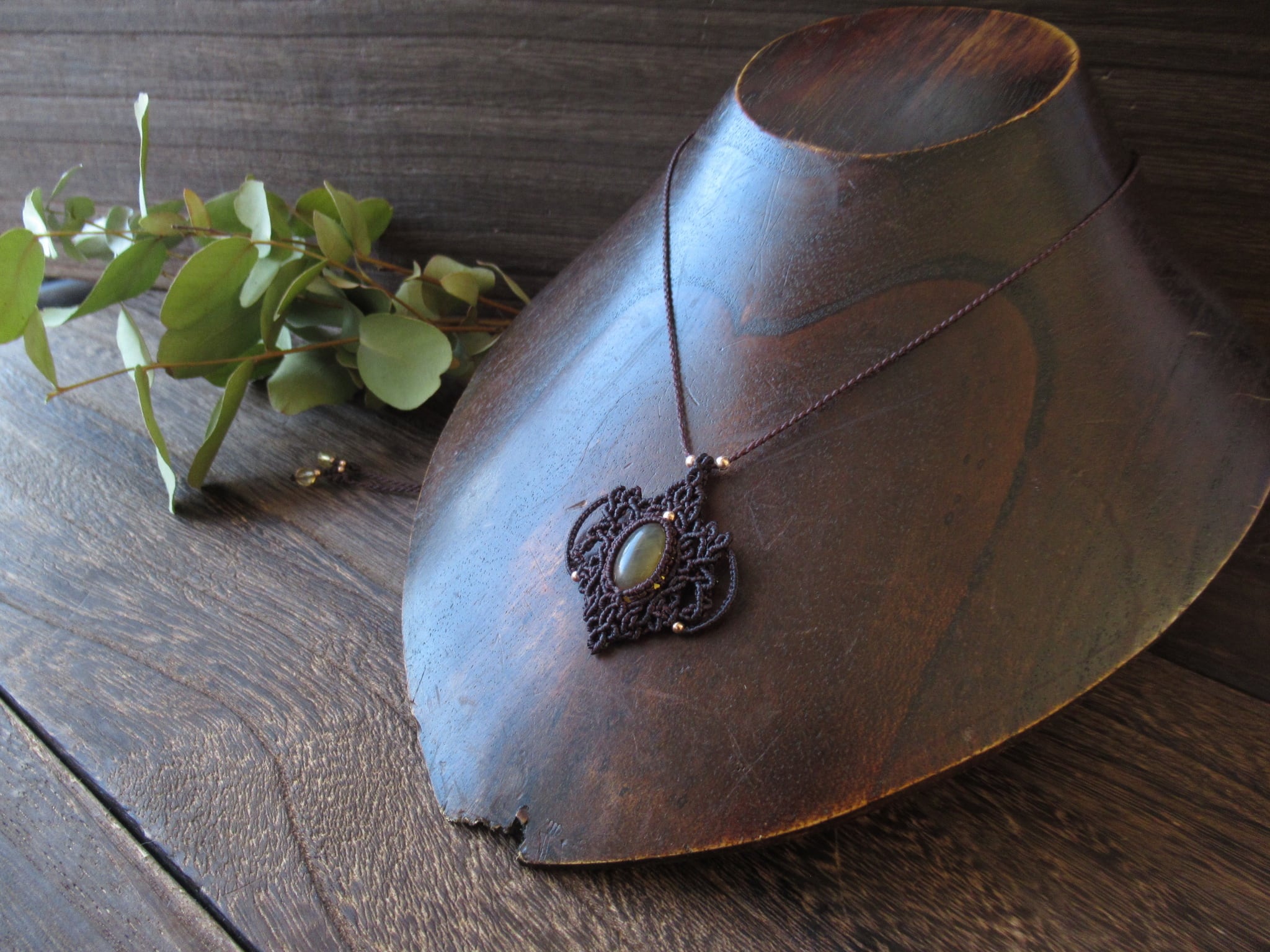 胸元に印象的なマクラメらしいデザインのペンダントです。様々なシーンのお伴に身に着けていただけましたら幸いです。