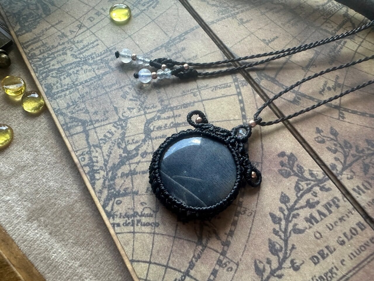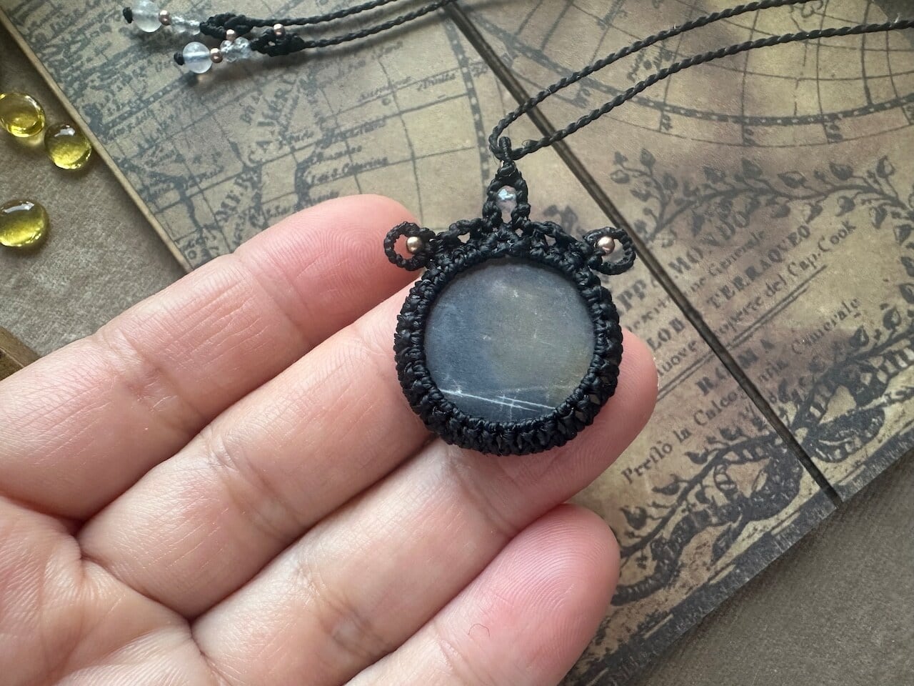 ブラックサンムーンストーンのマクラメ編みペンダント