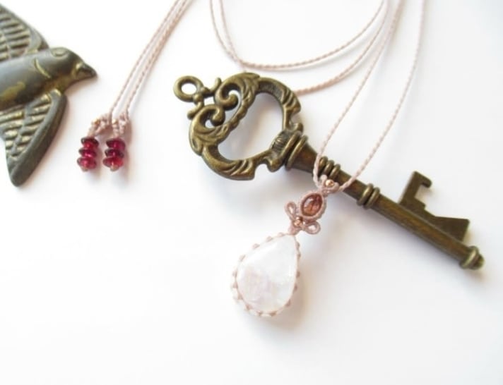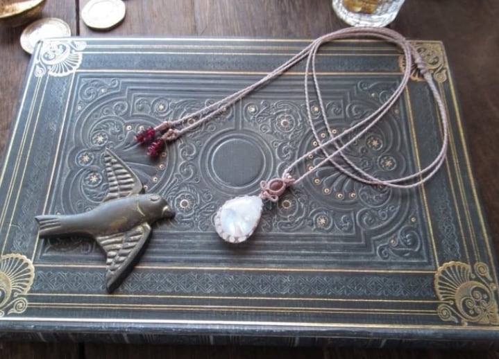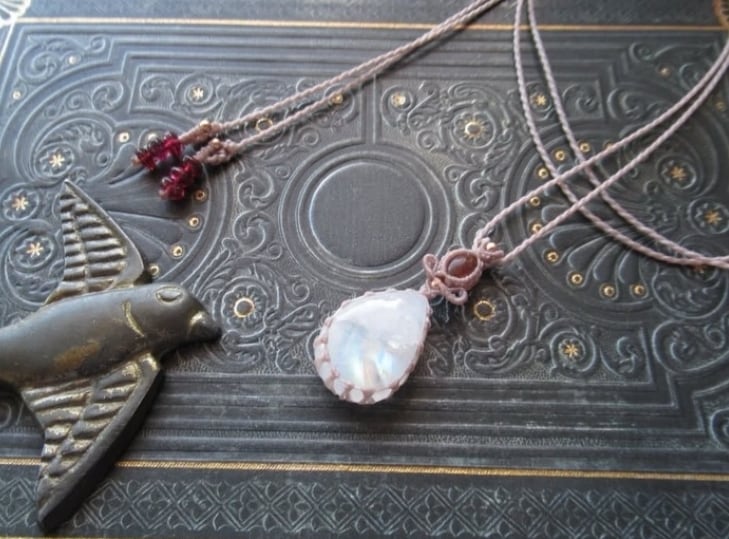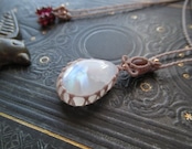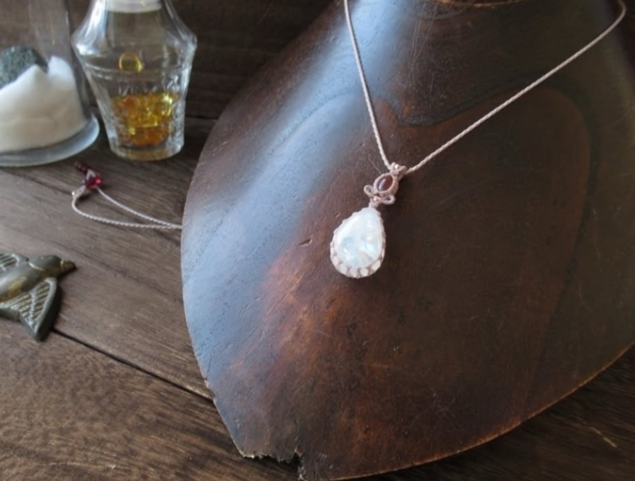 たまごのような柔らかいフォルムにふわりと浮かび上がる虹を持つ、レインボームーンストーンに、落ち着きのあるオレンジピンクカラーのトルマリンを組み合わせ、ペンダントをお仕立ていたしました。