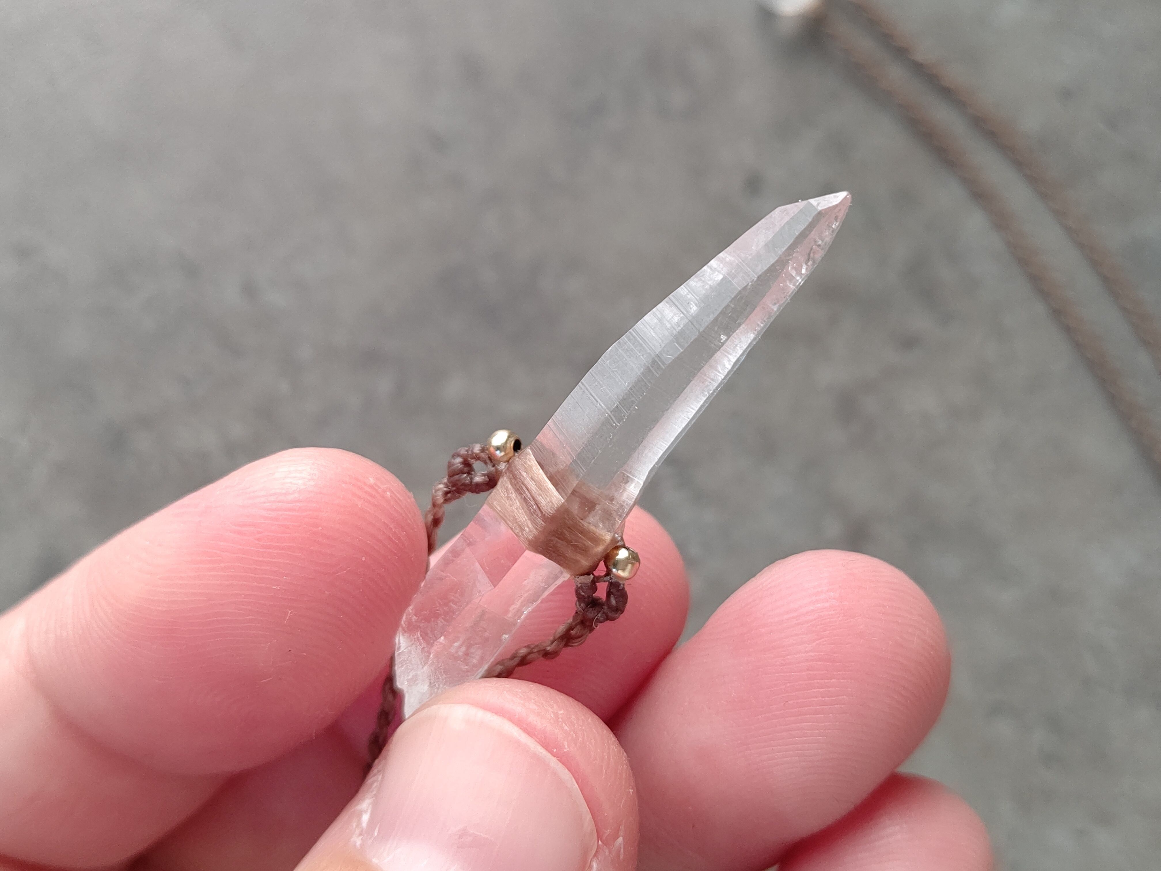 成長線の美しい剣のような佇まいのクリスタルです。凛とした雰囲気に合わせて装飾編みをせず、ごくシンプルに仕上げています。