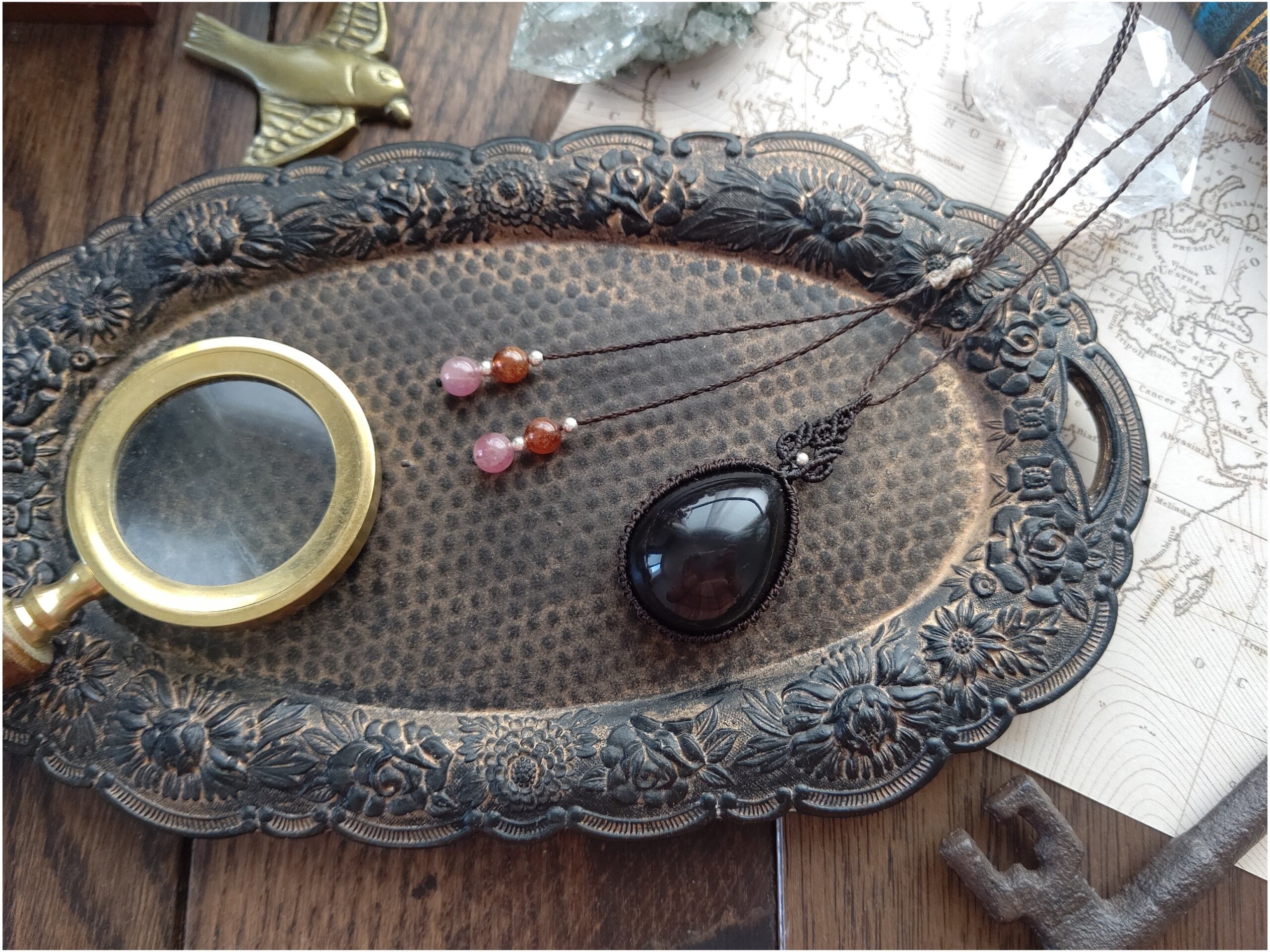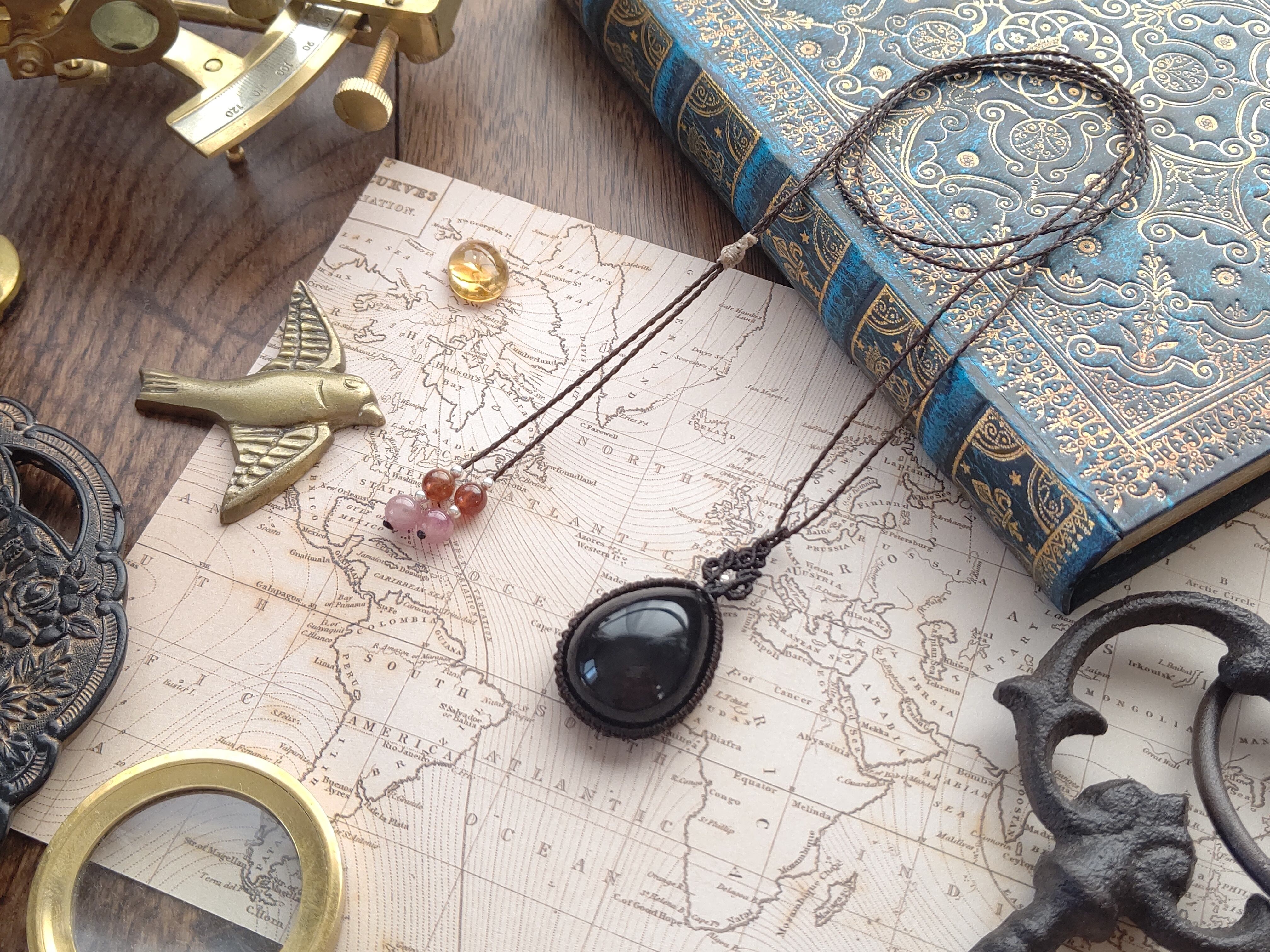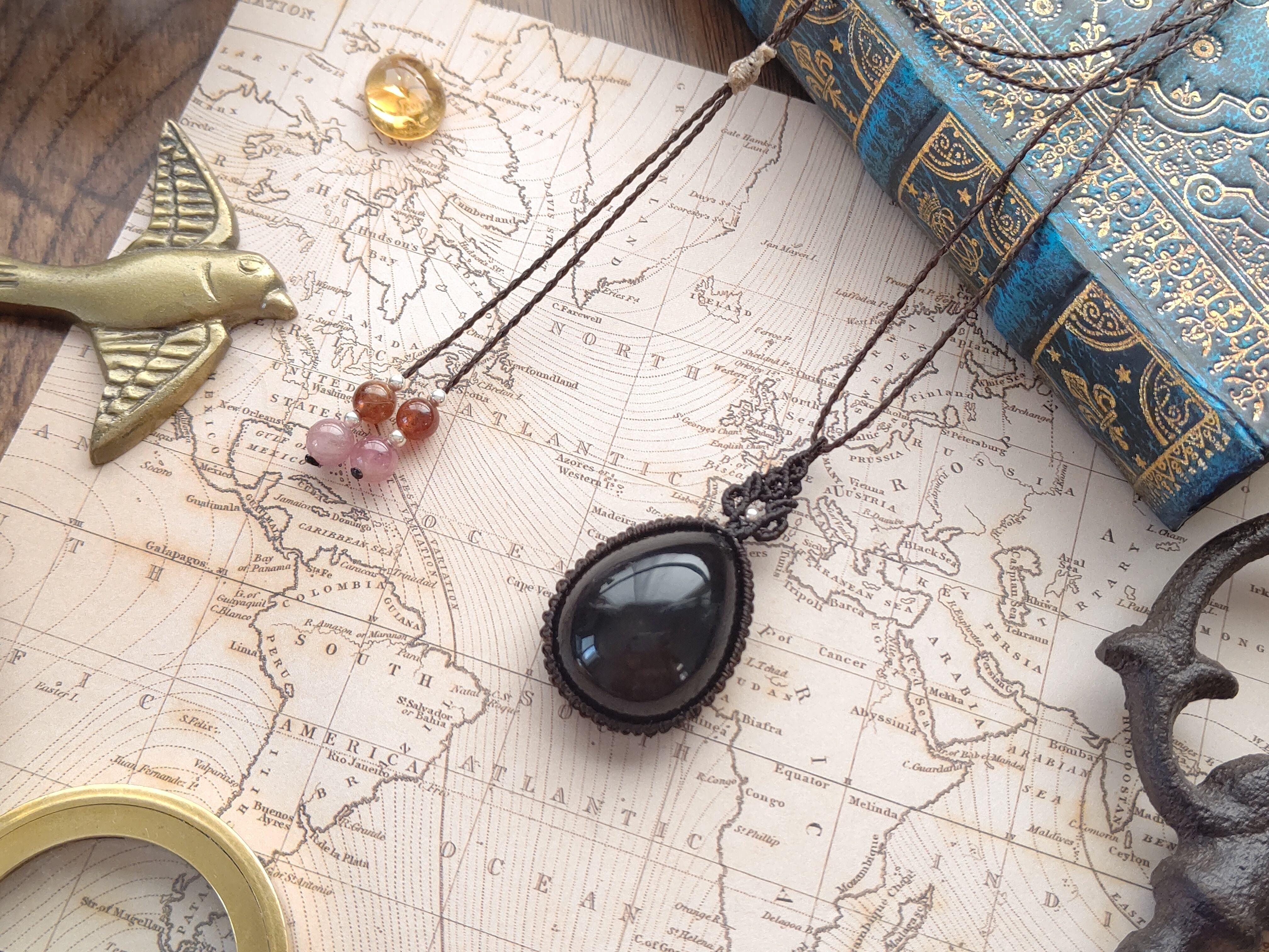大きめのペンダントですので、もったり、ごちゃごちゃしすぎないようにスッキリと編み、ペンダントのバチカンの部分にマクラメらしい編み込みを施しています。