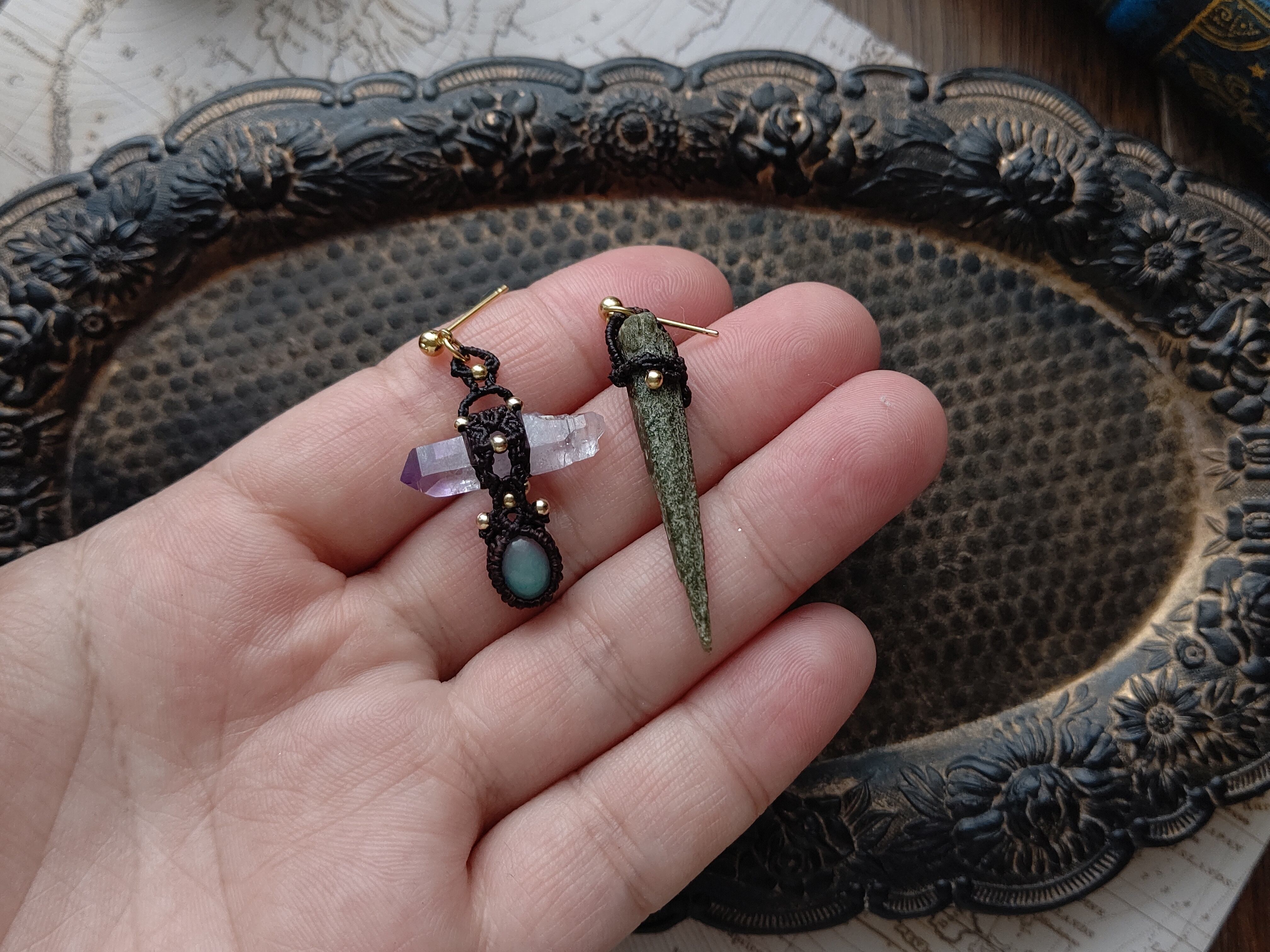 原石鉱物のアシンメトリーマクラメピアス (ガネーシュヒマール、ベラクルスアメジスト、エチオピア産オパール)