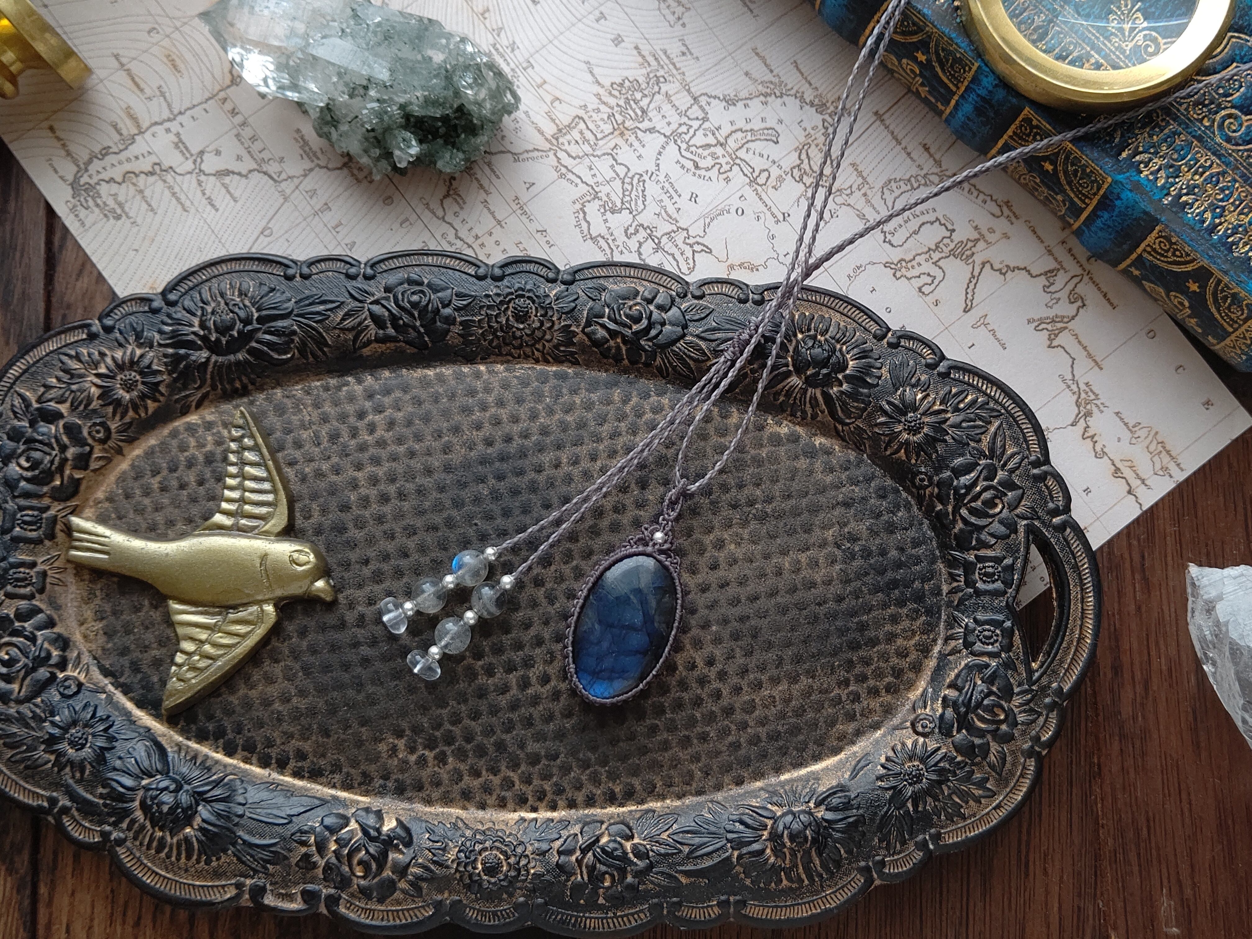 結び石は上質なクオリティのラブラドライトと水晶のビーズをあしらいました。