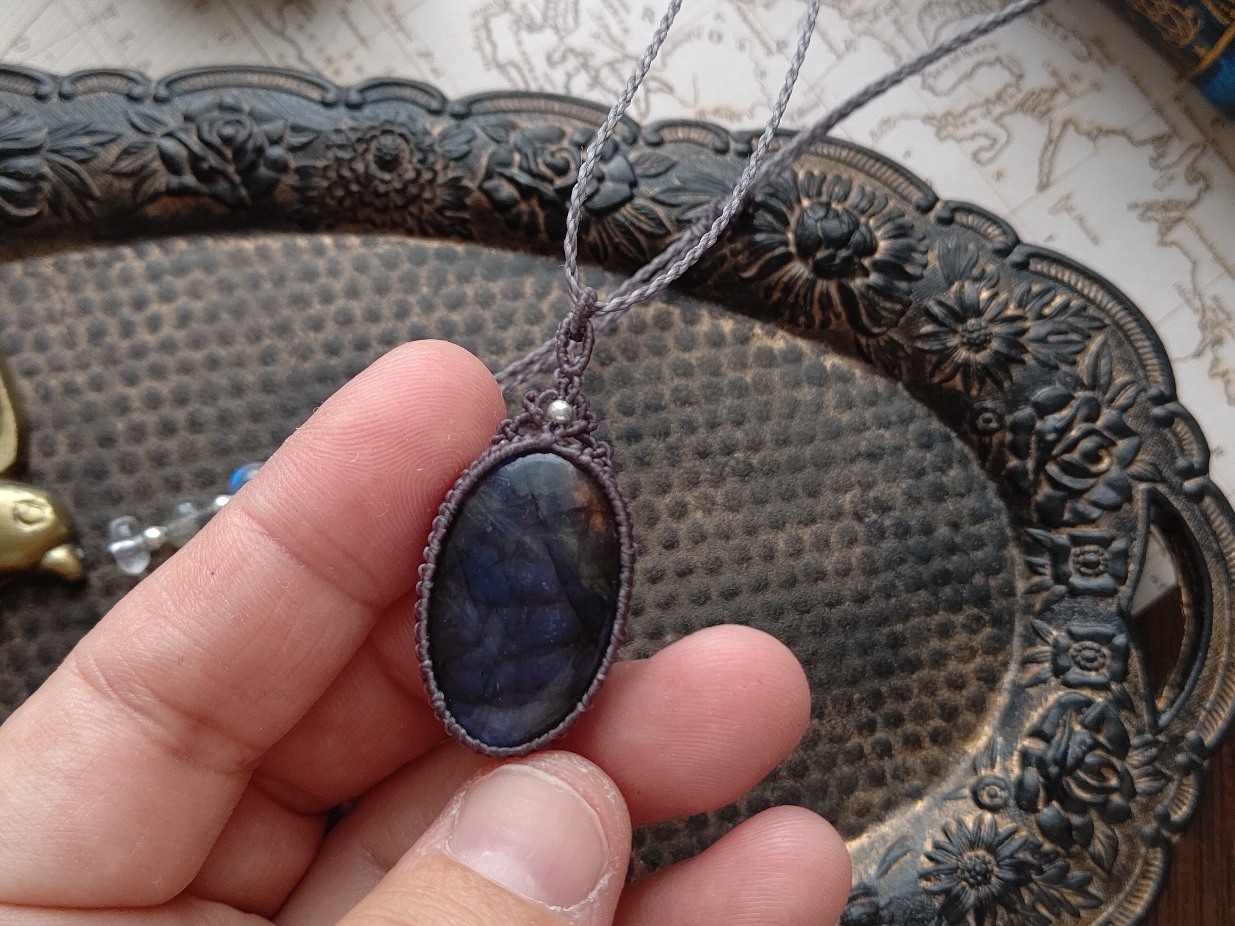 糸色はカジュアルにお使いいただけるように、ダークグレーで編み込み、ペンダントと首飾り紐の連結部分のパーツを工夫し、長時間のご使用でも首飾り紐がくるくると回転し、ペンダントの飾り石がいつのまにか前身ごろに移動するのを軽減します。