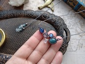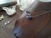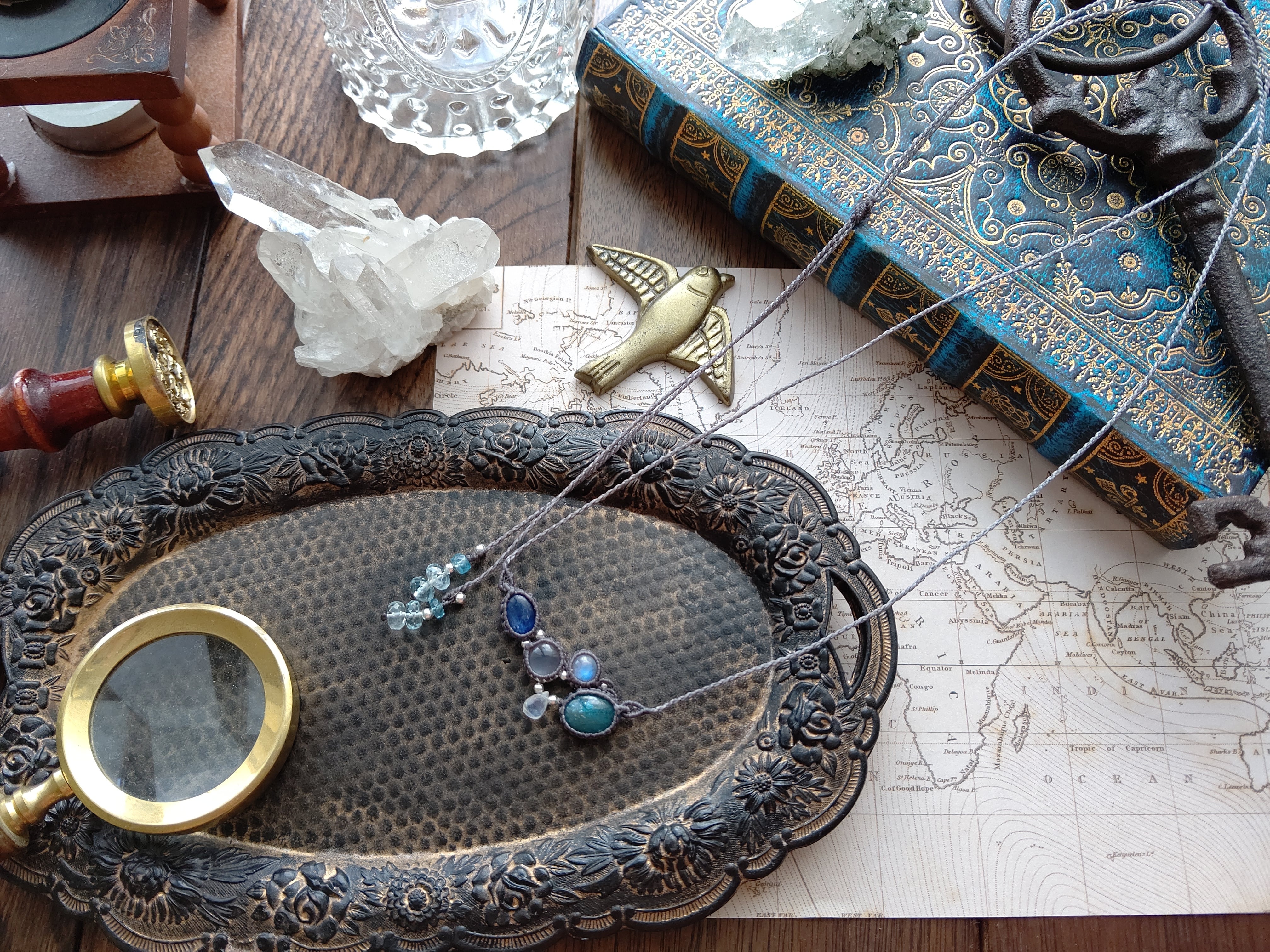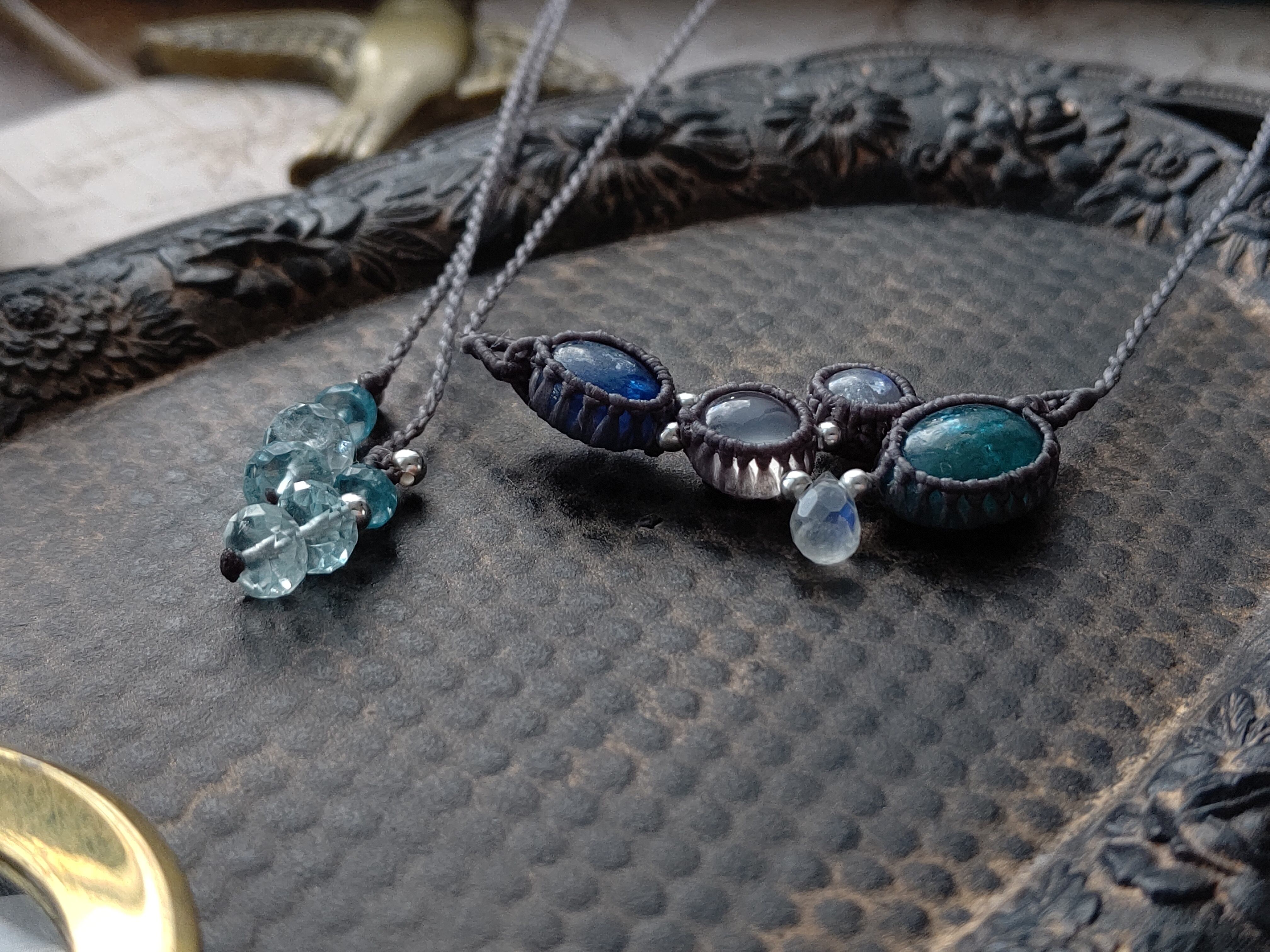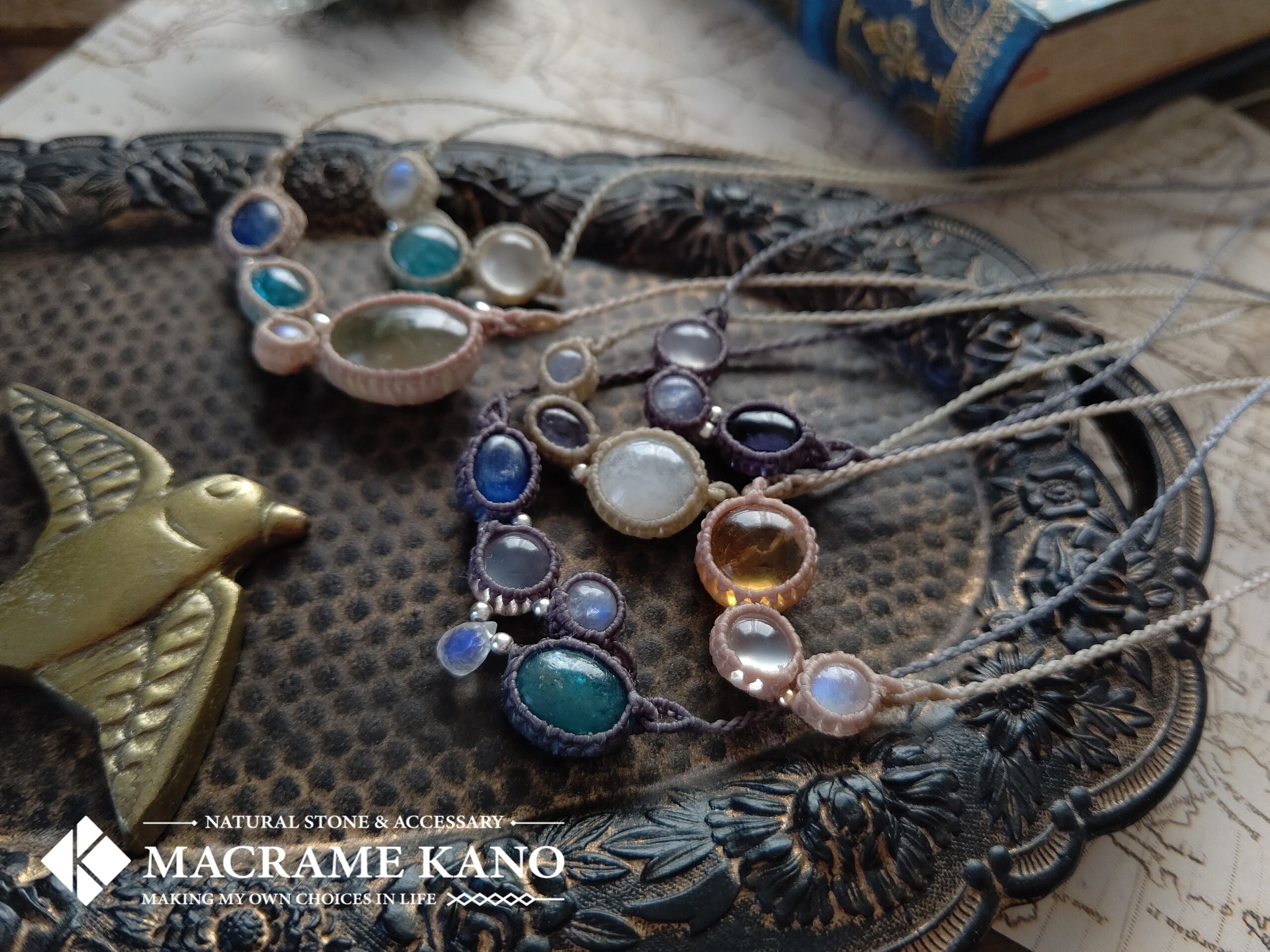 2粒の種類の異なるムーンストーンに、夜の海のようなブラジル産カイヤナイト、月の欠片を落としたようなレインボームーンストーンの雫型のビーズをsilver925ビーズと一緒にあしらっています。