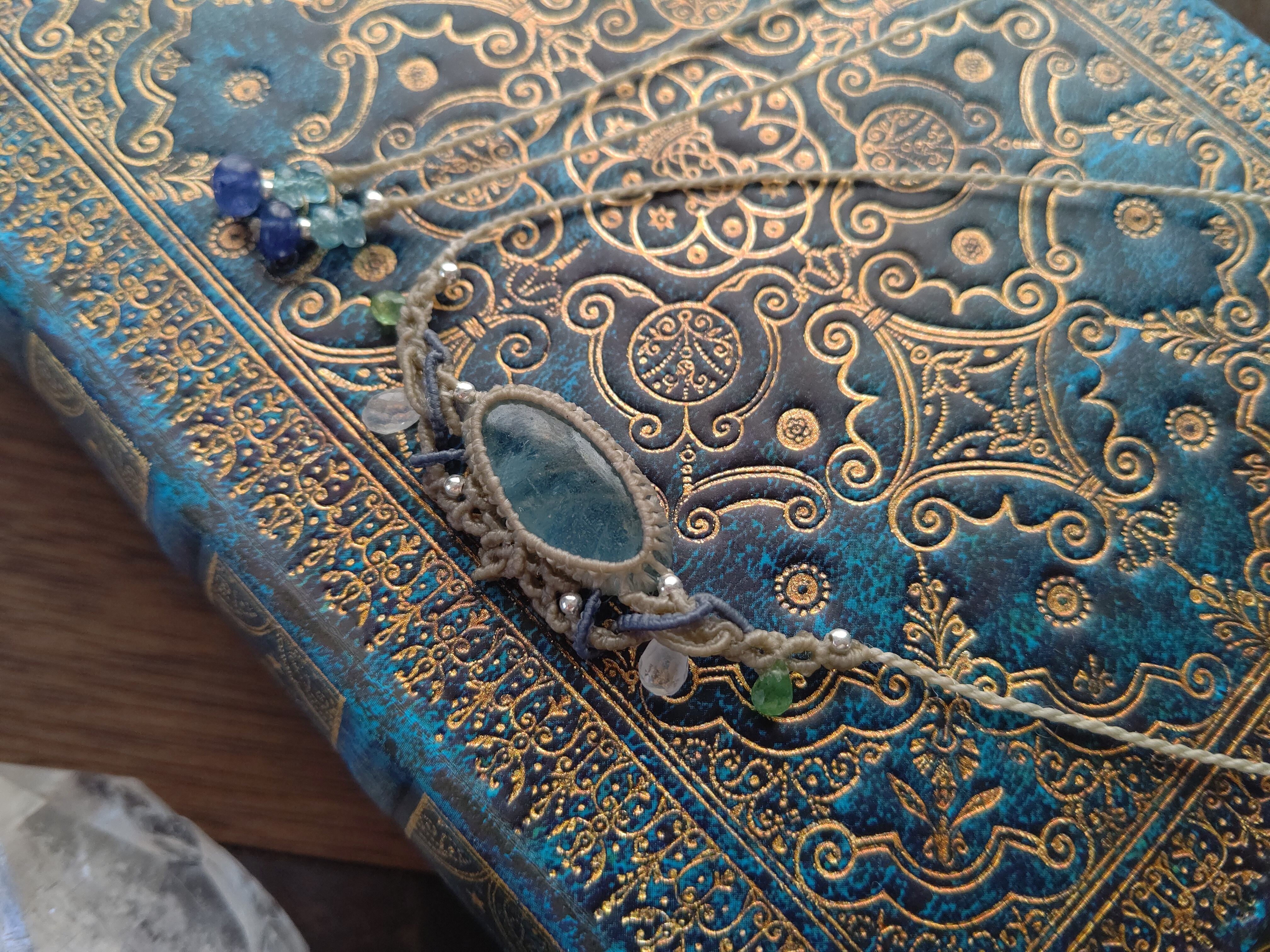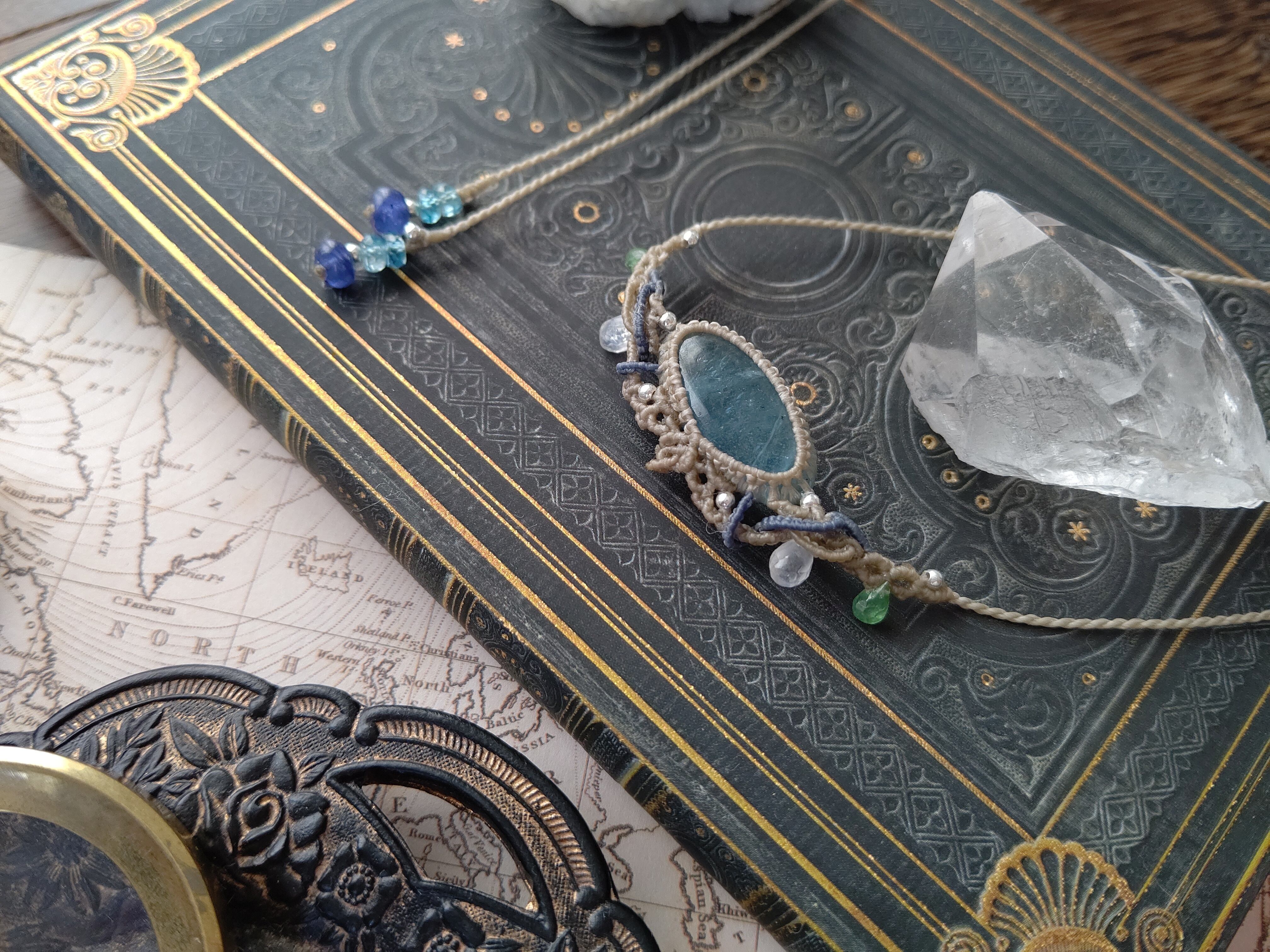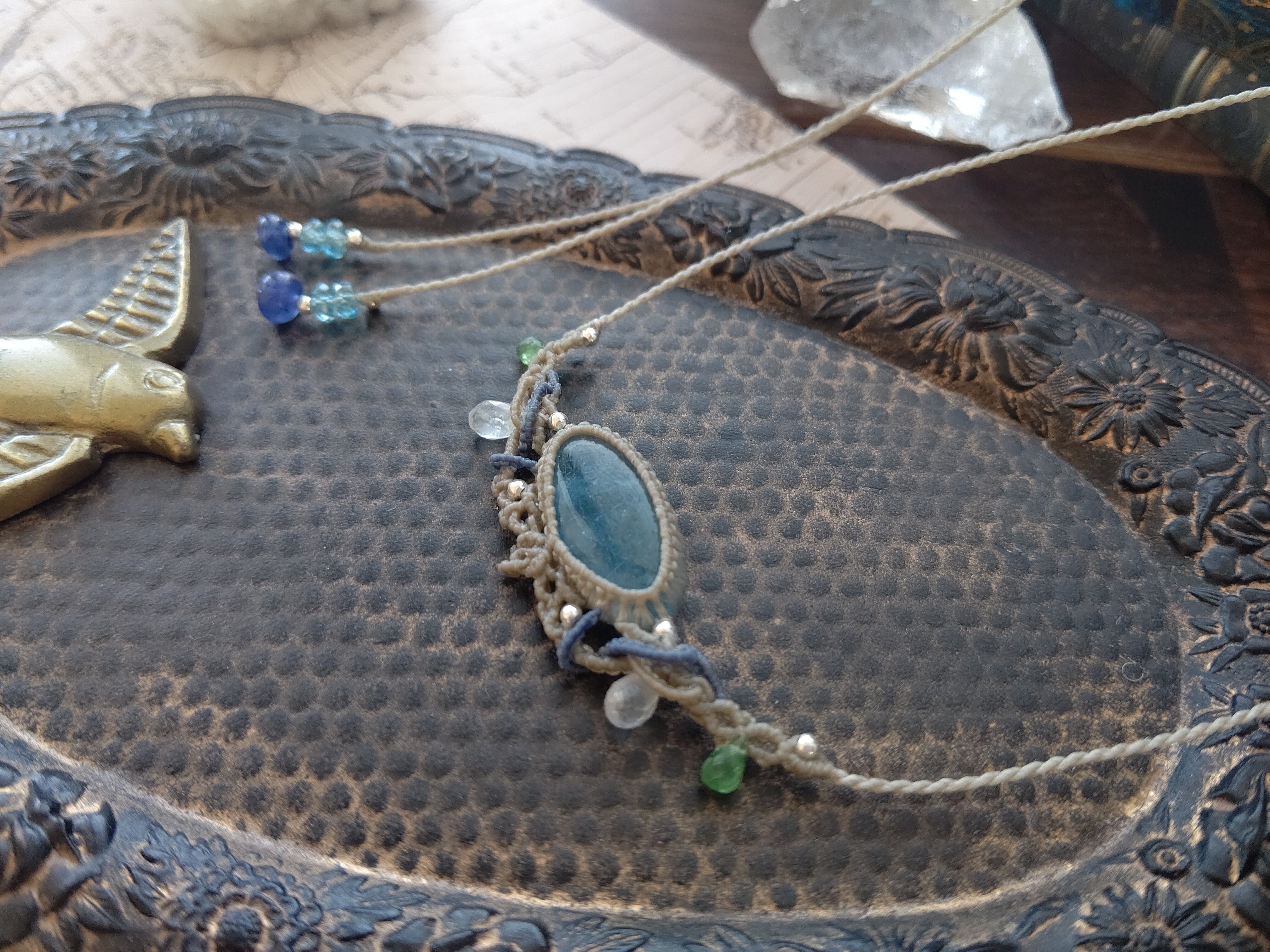 非加熱アクアマリン×ツァボライト×ホワイトラブラドライトのフロントマクラメネックレス