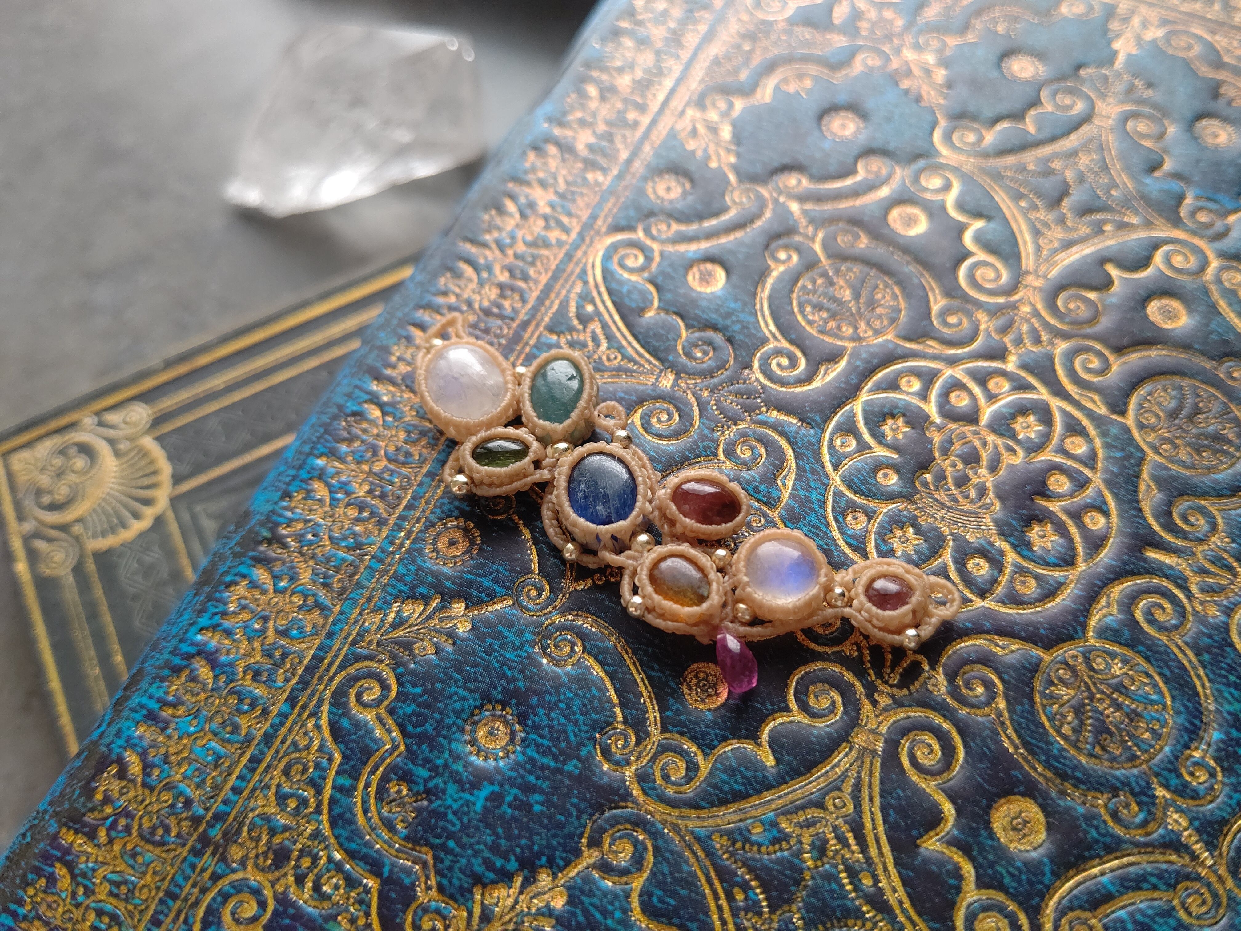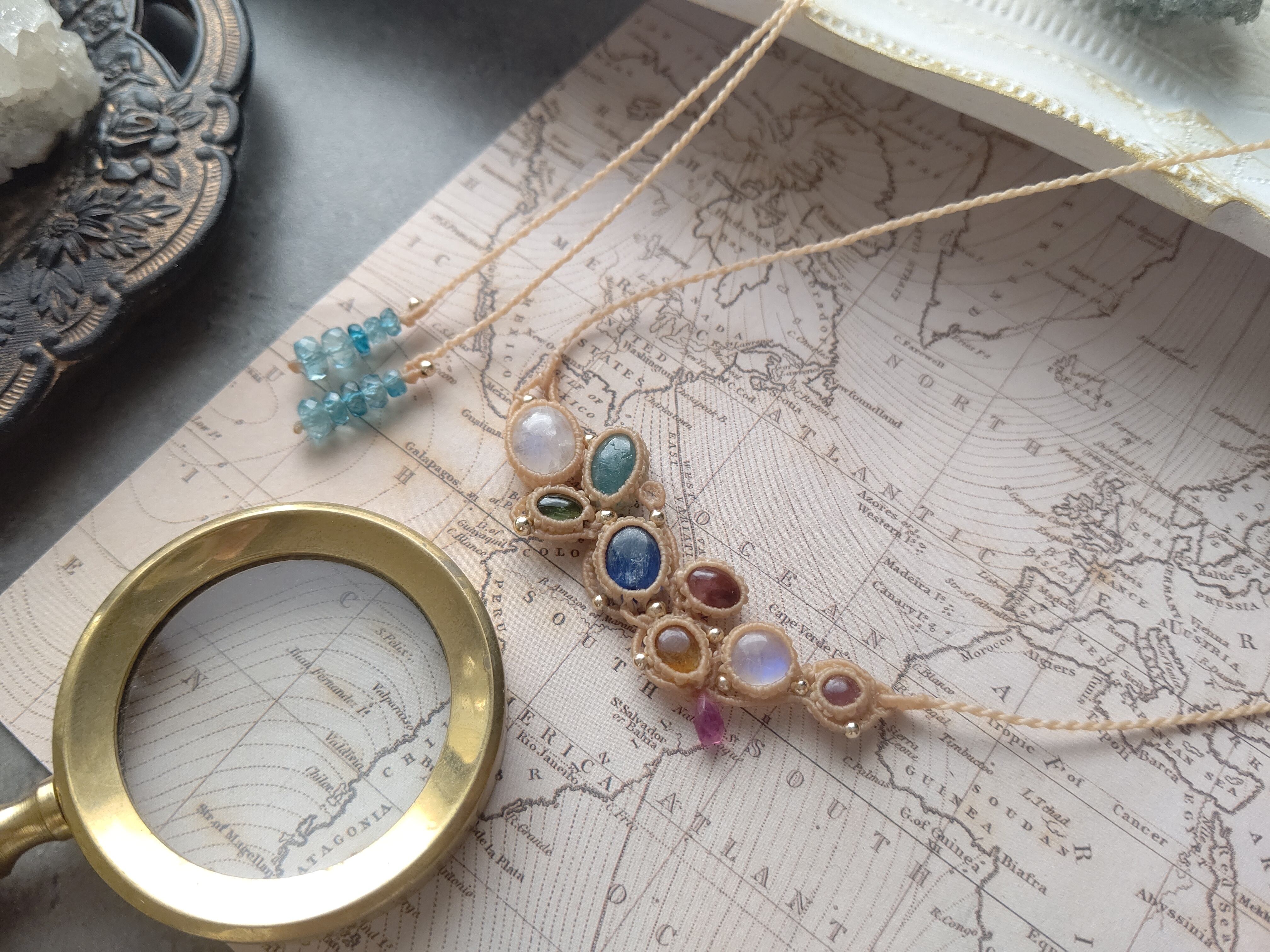 製作にデザインや石選びを含めると10時間以上かかるため、たくさん作ることができないのですが、0.25mmの糸で丁寧に丁寧に編み上げています。