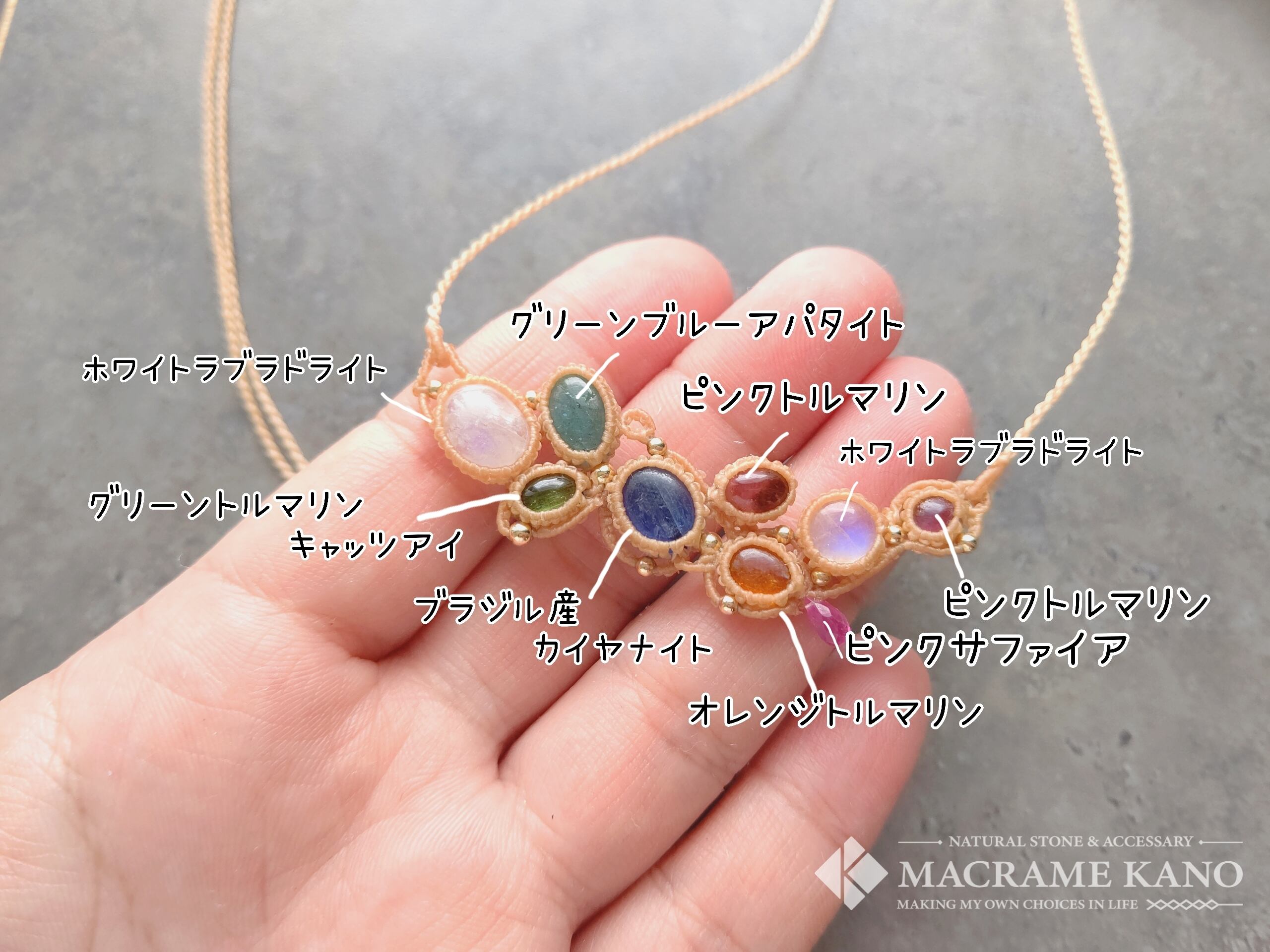 ホワイトラブラドライト、ブルーグリーンアパタイト、グリーントルマリンキャッツアイ(強くはありませんが光沢のある美しいシラーが見られます)、ブラジル産カイヤナイト、ピンクトルマリン、オレンジトルマリン。