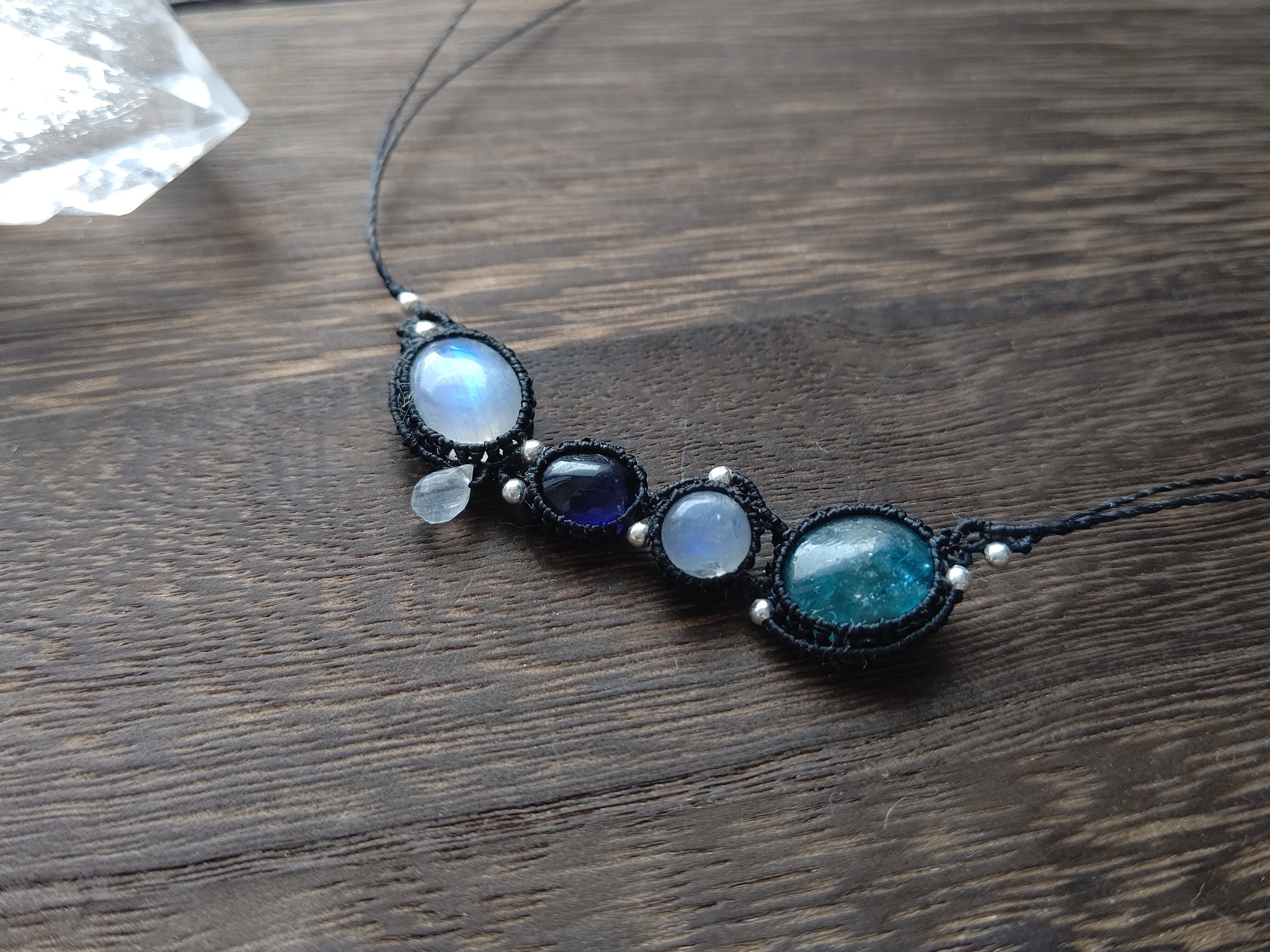 ≪送料無料≫ブルーアパタイト×アイオライト×ホワイトラブラドライトのマクラメネックレス:夜の海と月の雫