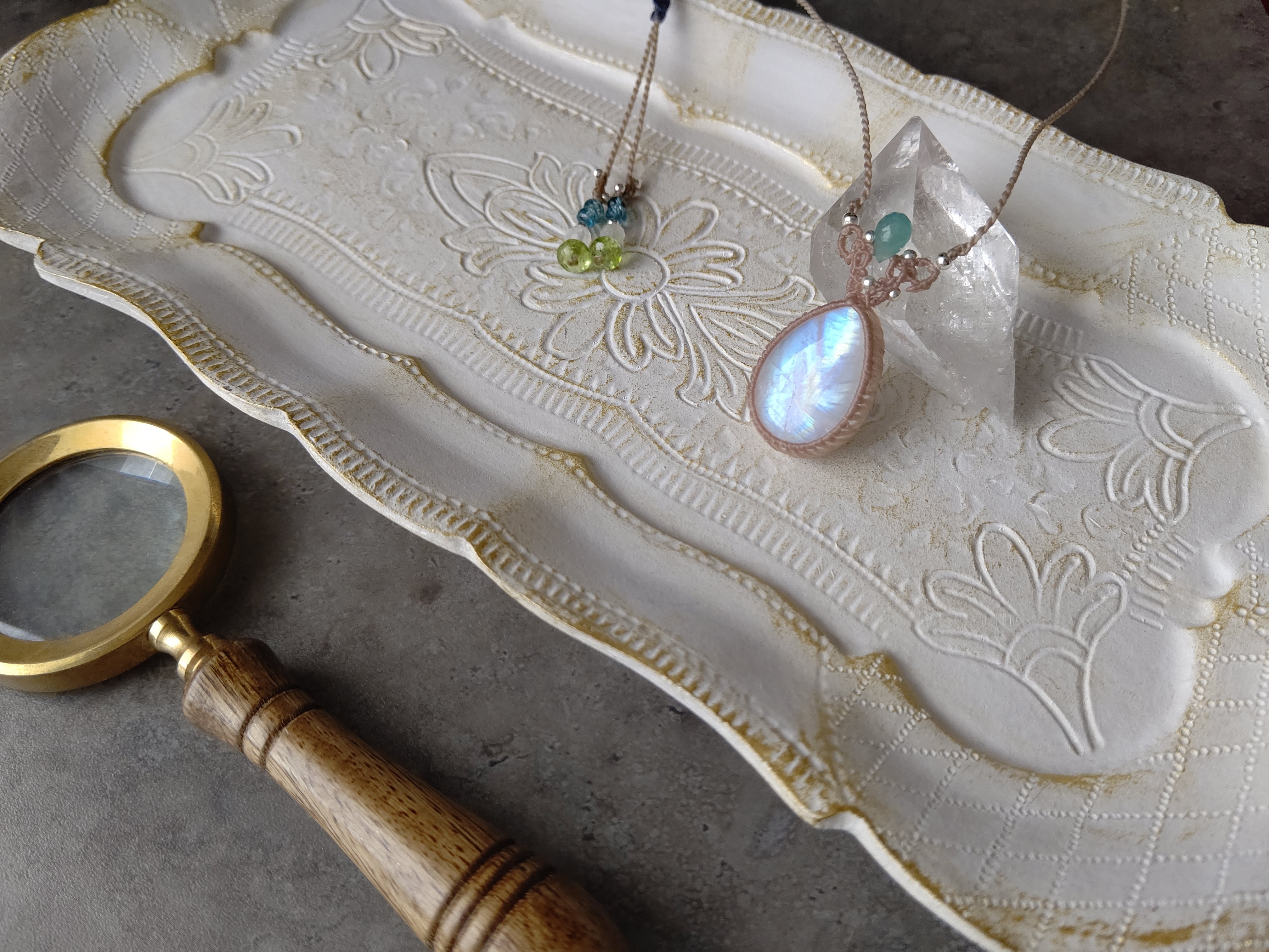 大粒でしっかり見映えのする大きさのレインボームーンストーンに、アクセントでグランディディエライトを編み込み、シンプルで上品な雰囲気のペンダントに仕立てました。