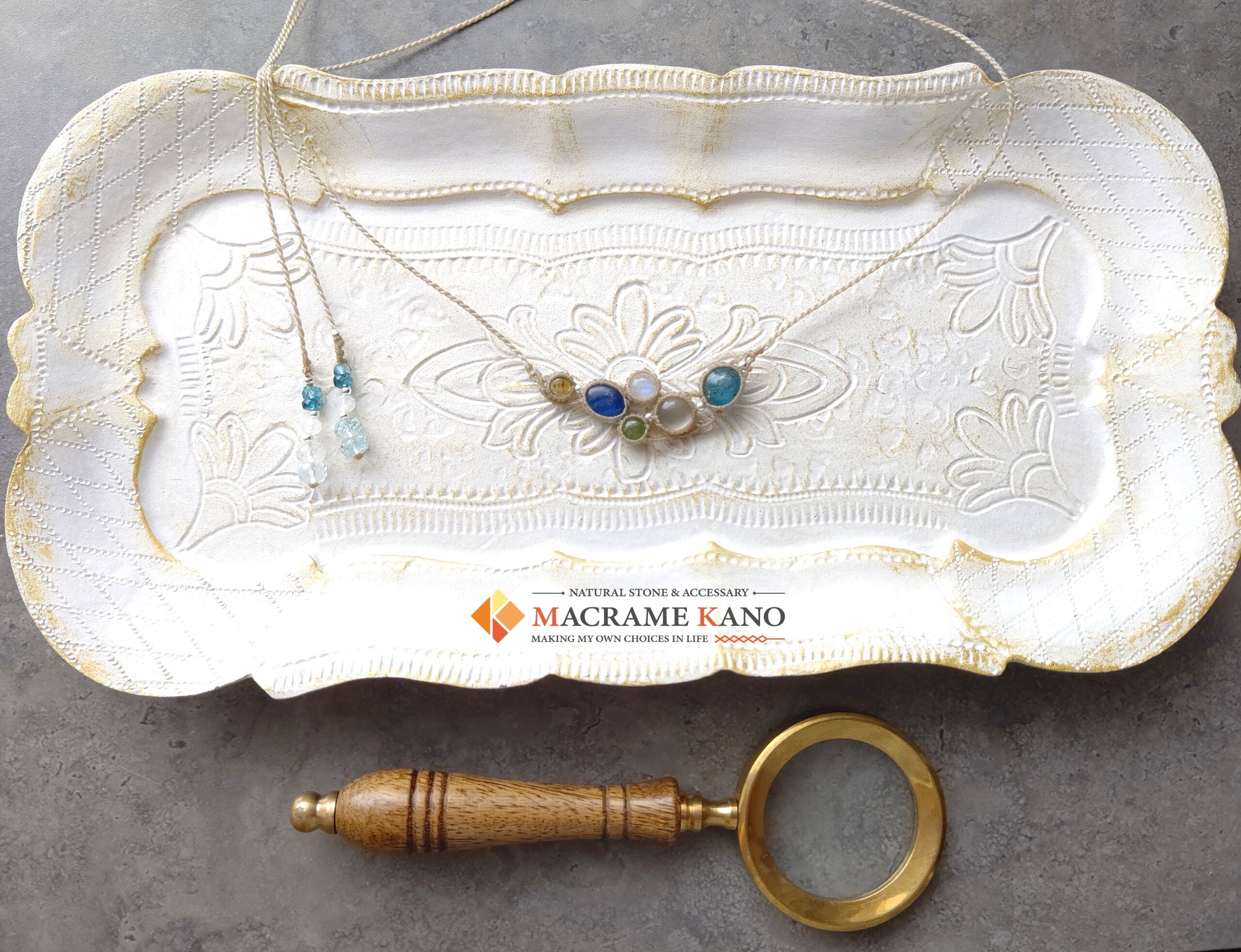雨上がりの早朝。東の山際から顔を覗かせた太陽の光が、水を切る葉っぱの表面を彩る様子を6粒の天然石を使いネックレスにしました。