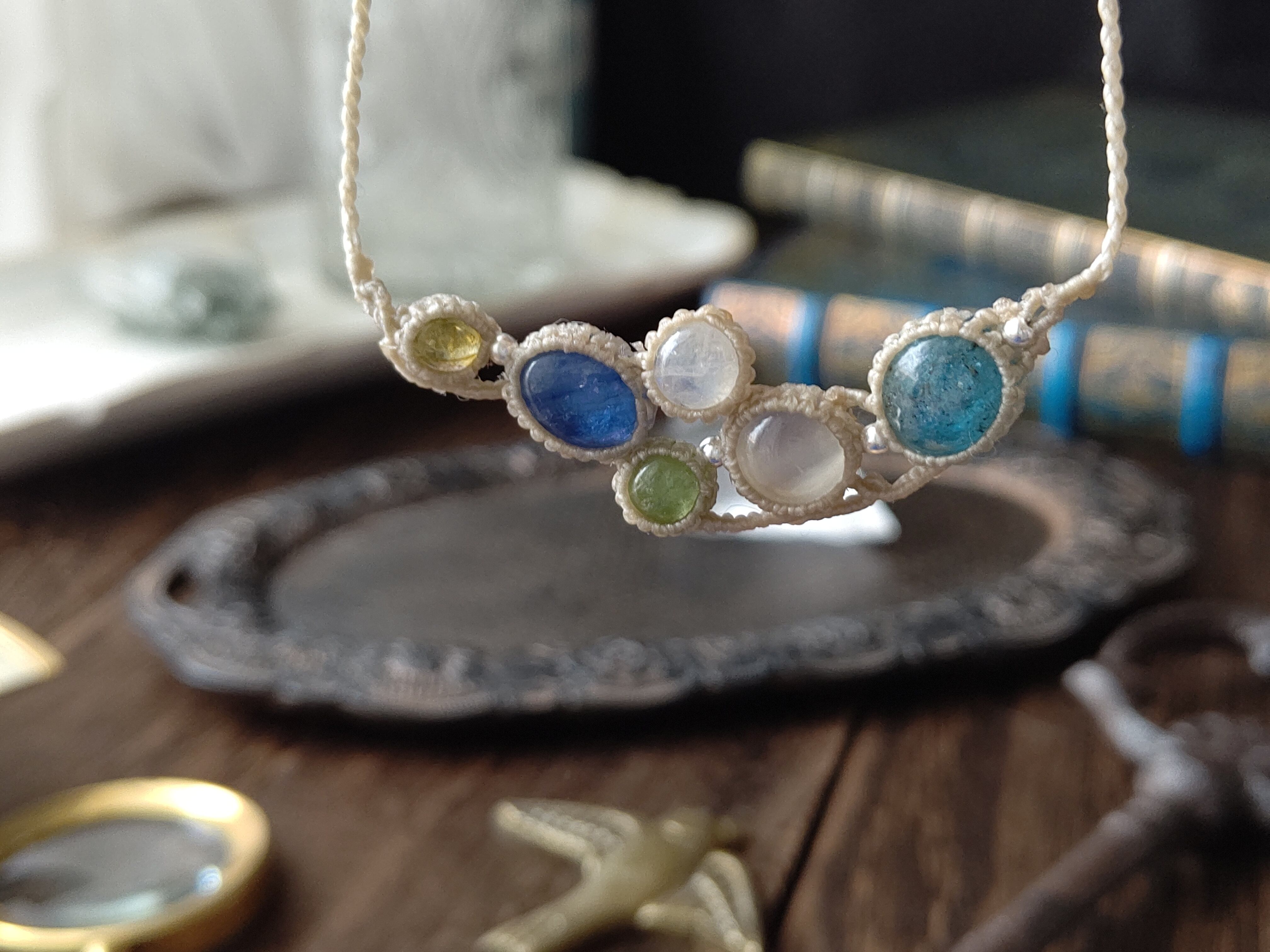 アシンメトリーデザインで、左上からグリーンイエローのトルマリン、ブラジル産カイヤナイト、ホワイトラブラドライト、グリーントルマリン、ホワイトムーンストーン、ブルーグリーンアパタイトを配置しています。