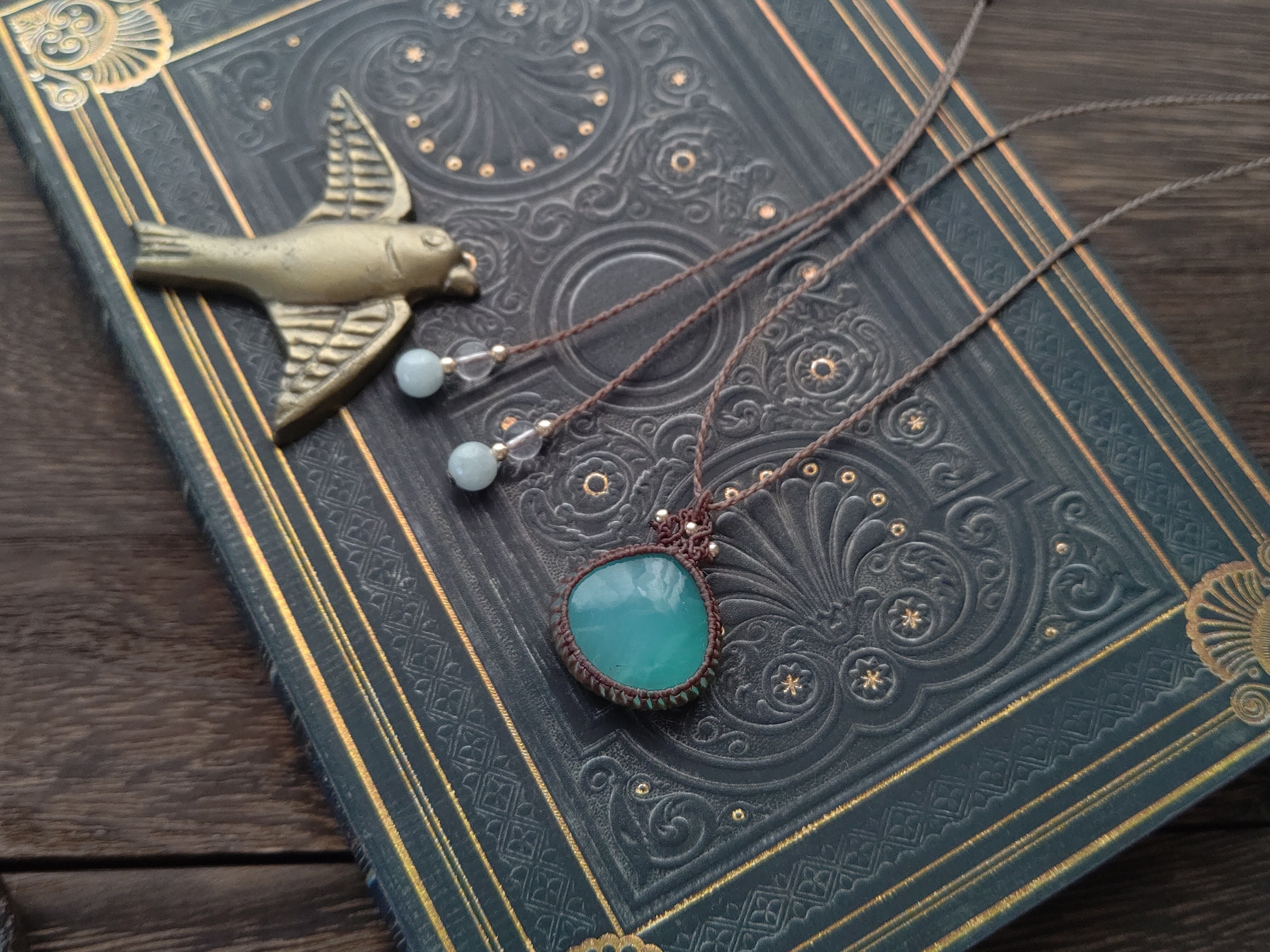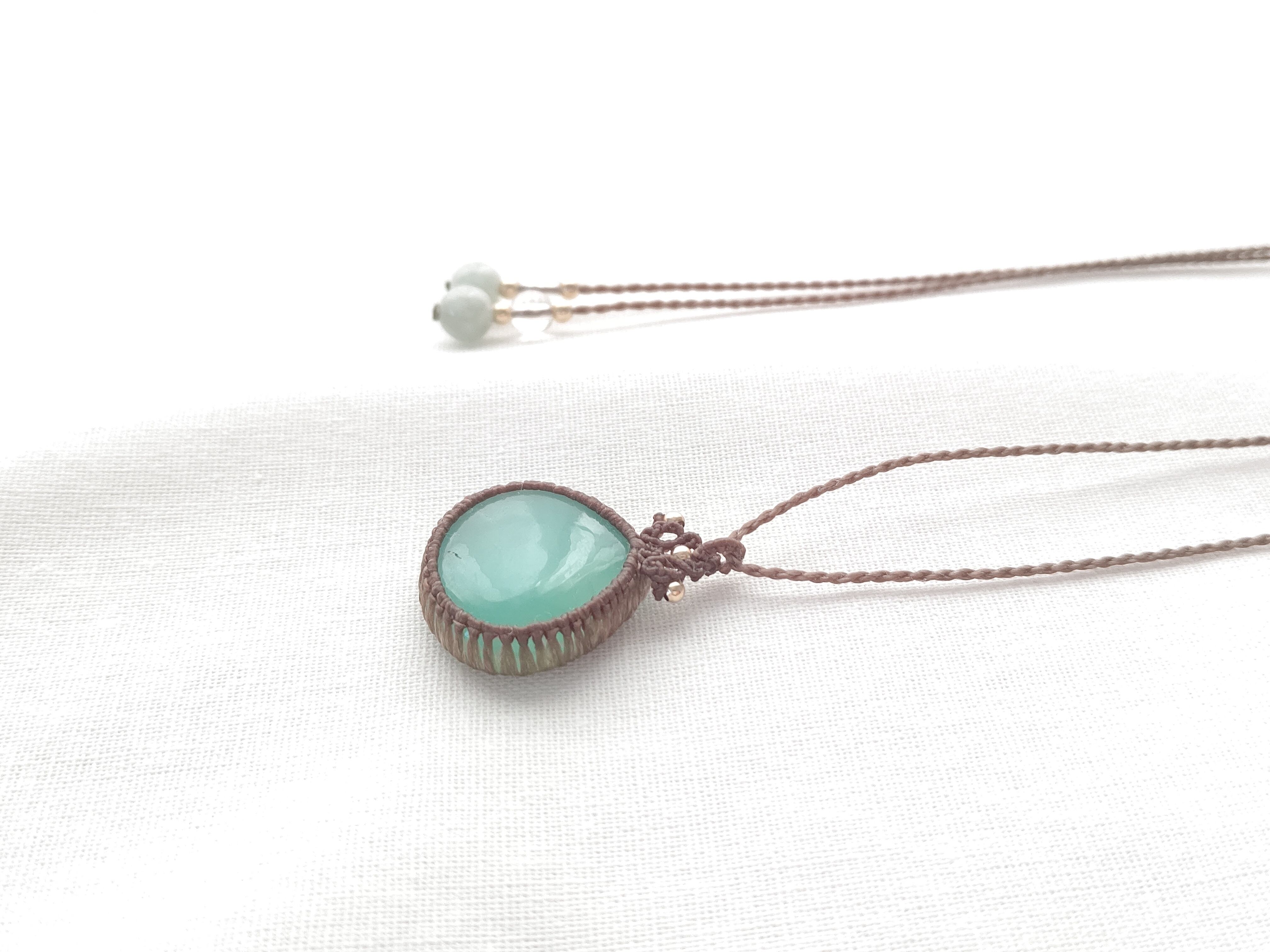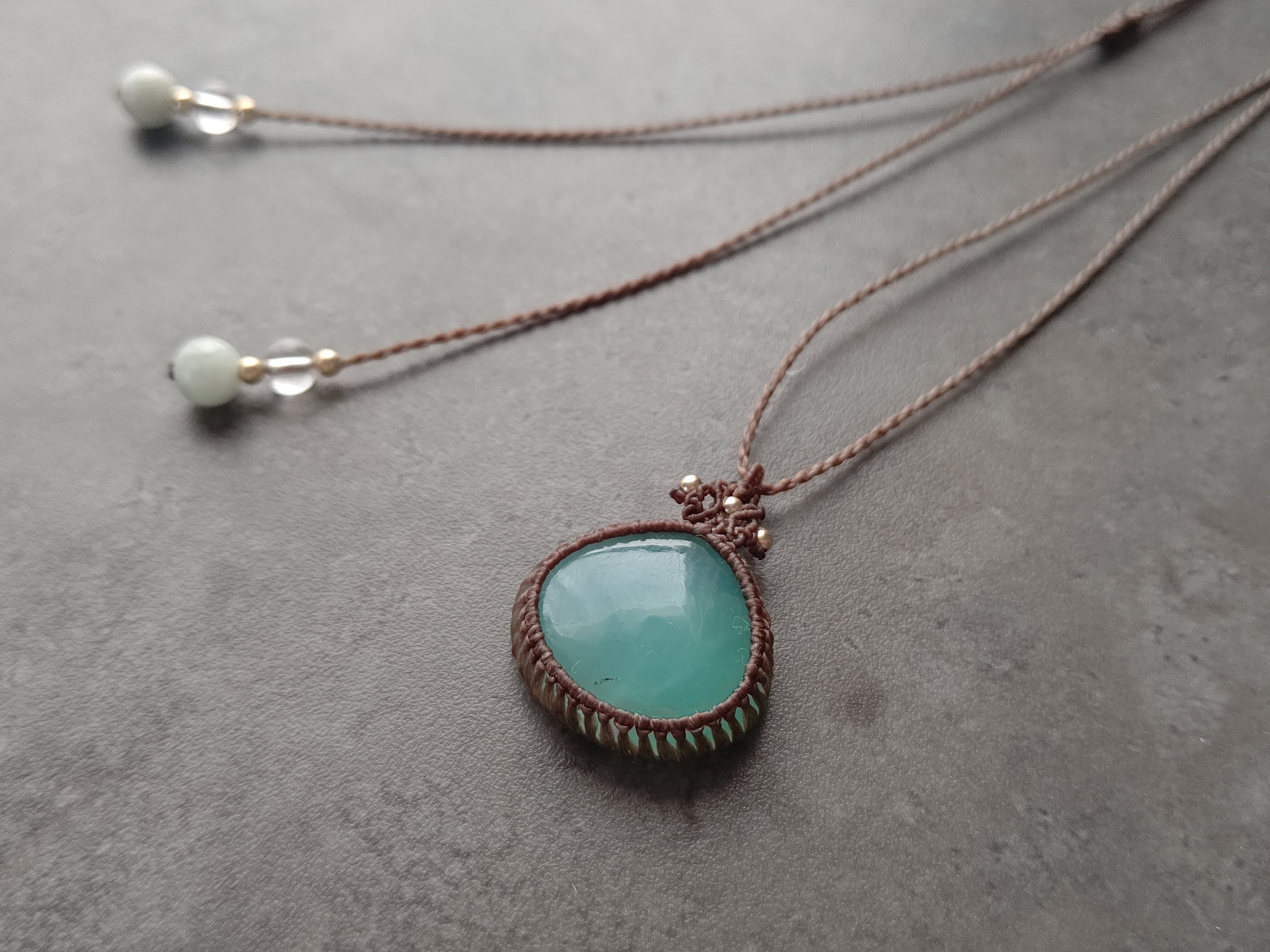 大粒で少し透明感のあるエメラルドグリーンのクリソプレーズでペンダントを製作しました。