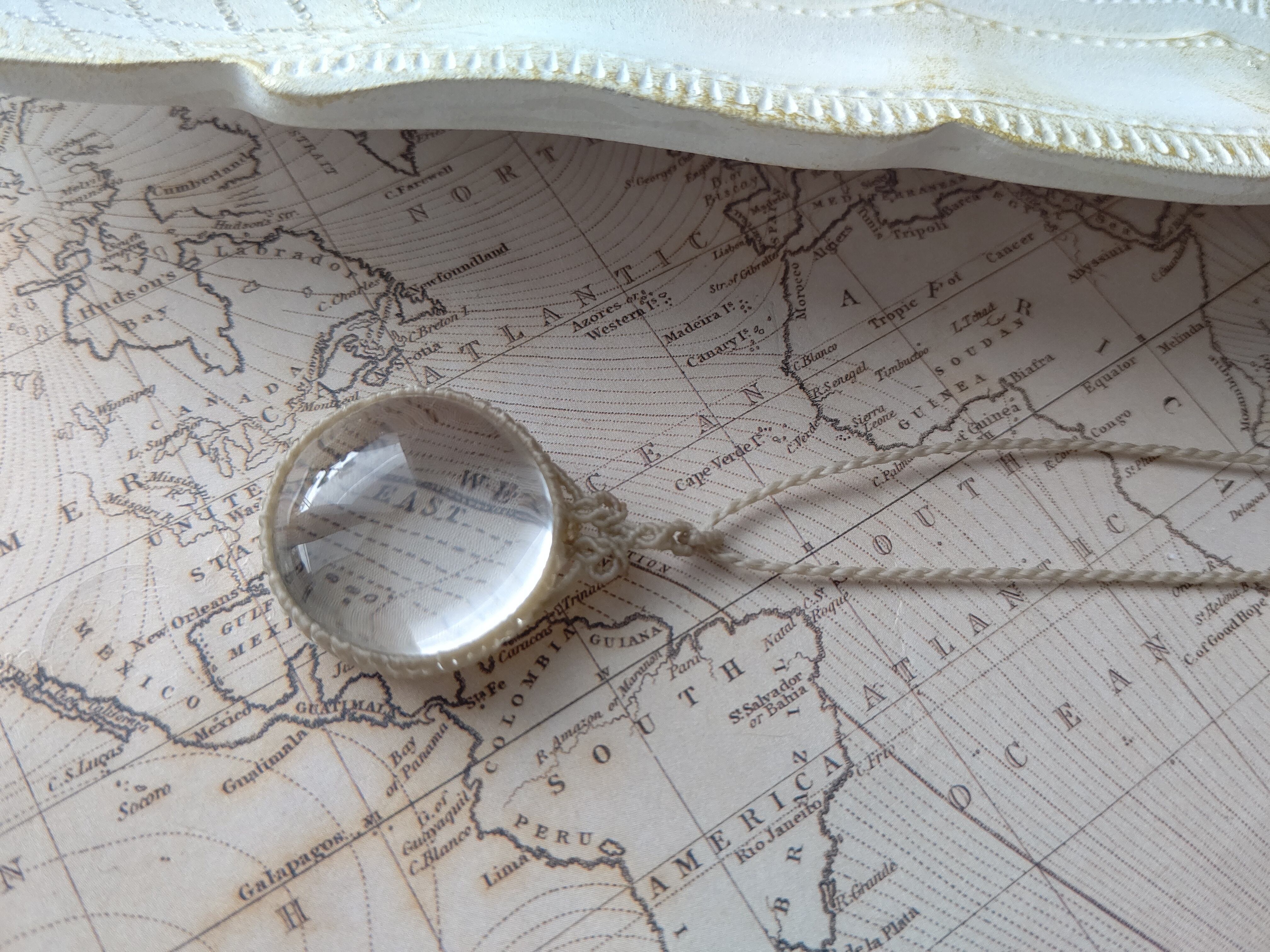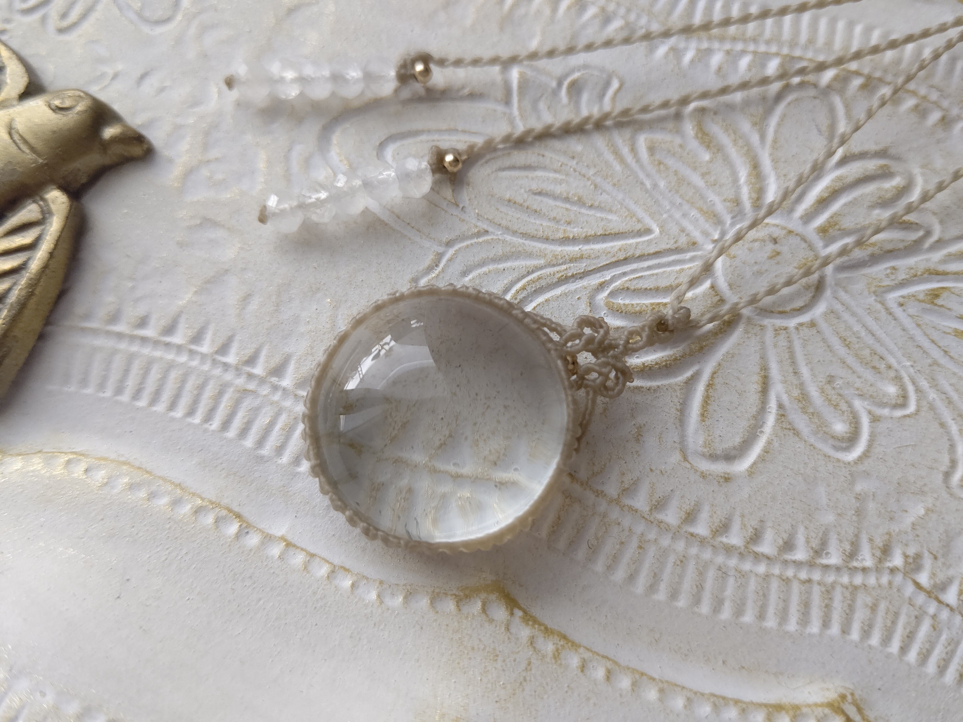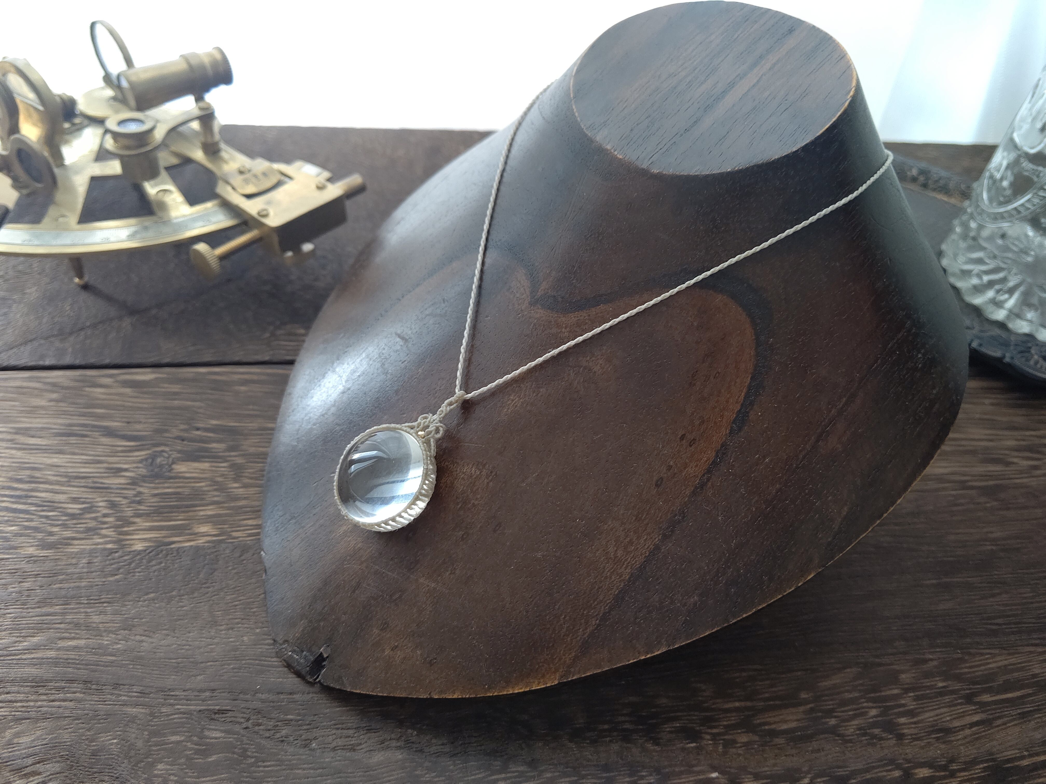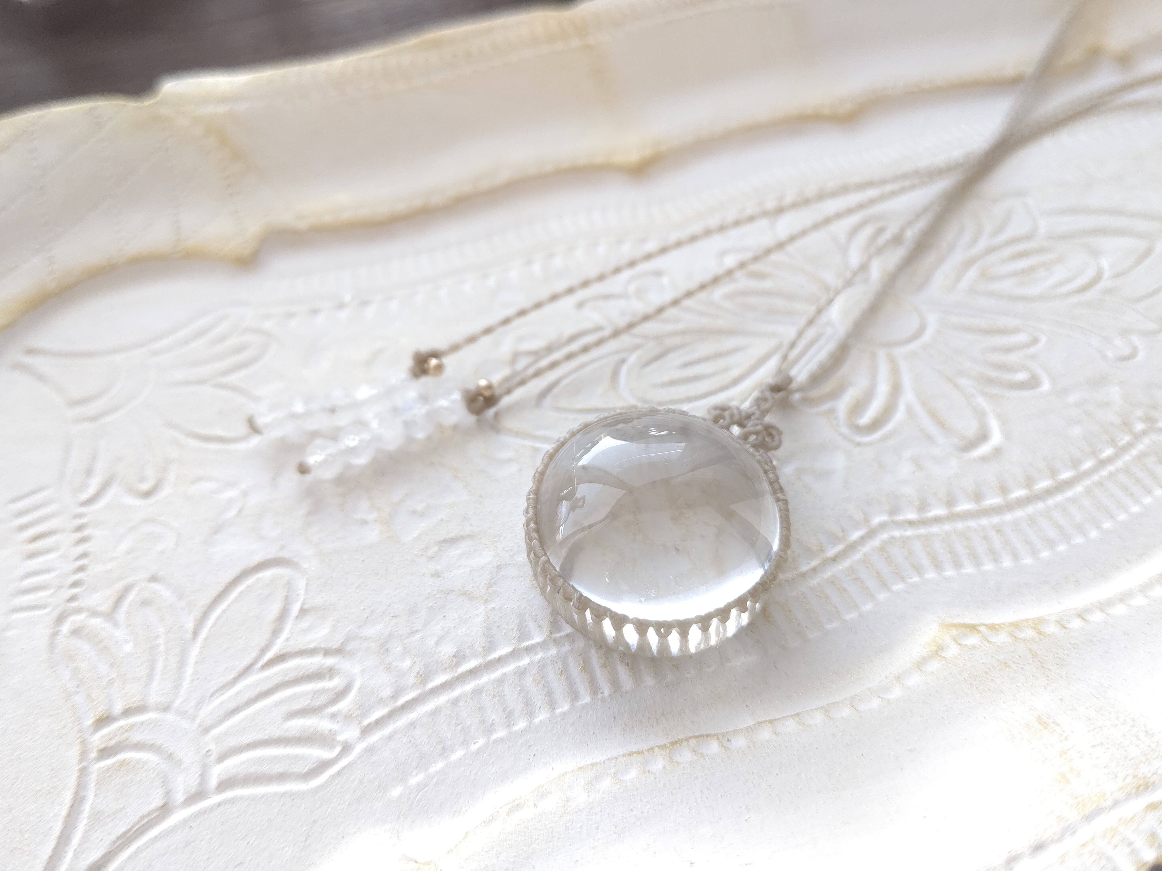 ぷっくりとしたレンズのような形状で内包物や濁りのほとんどない、とても美しい水晶です。文字の上や布の上に置くと文字や繊維が拡大されるのでちょっとしたルーペのような水晶のペンダントです。