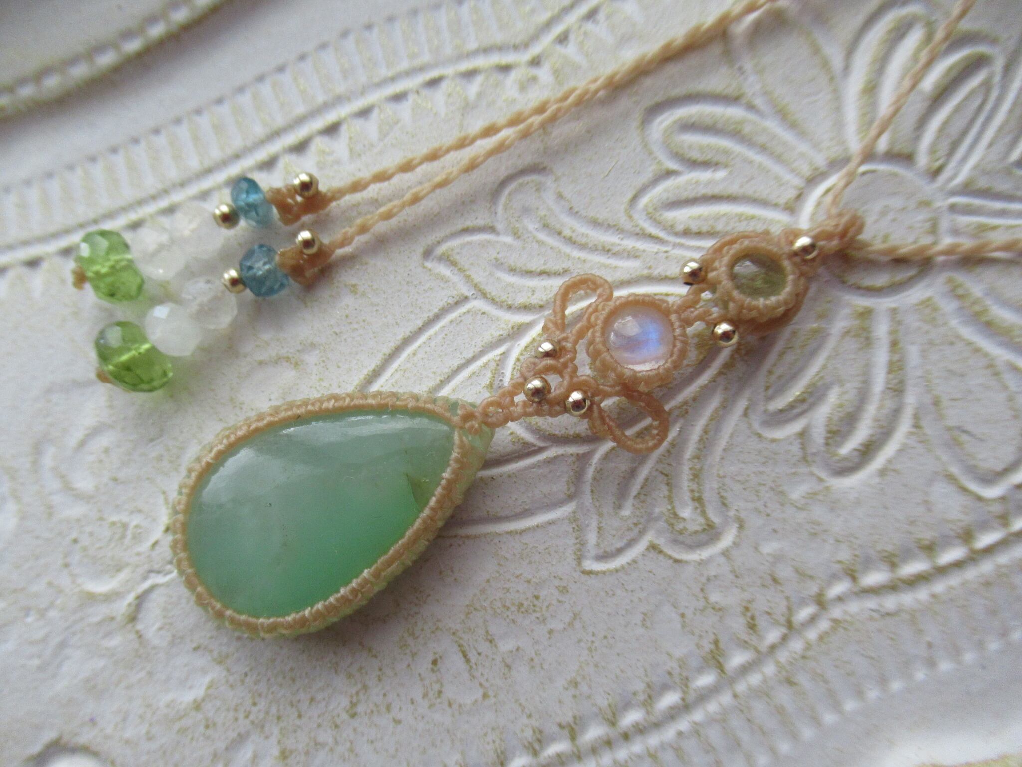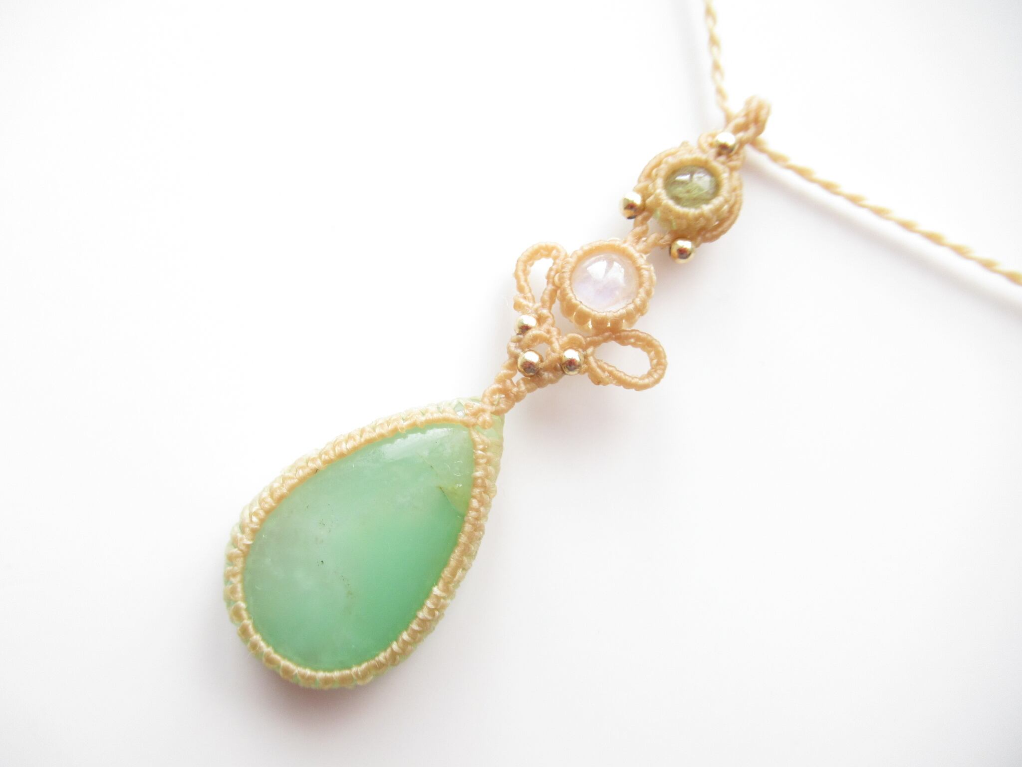 クリソプレーズ×ホワイトラブラドライト×グリーントルマリンのマクラメペンダント