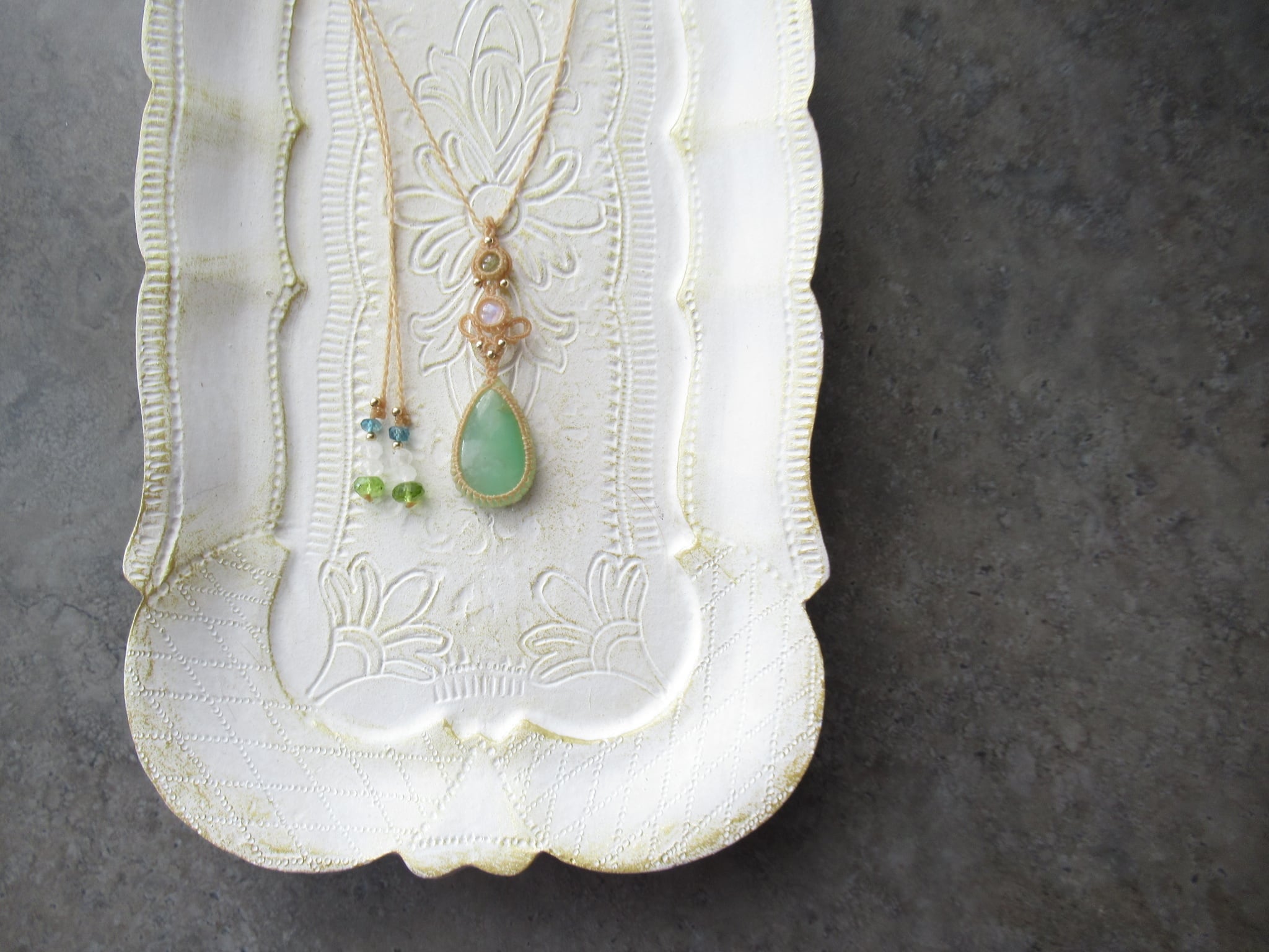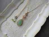 大粒でハイクオリティのクリソプレーズとホワイトラブラドライト、グリーントルマリンを組み合わせ縦3連の大ぶりのペンダントを製作しました。