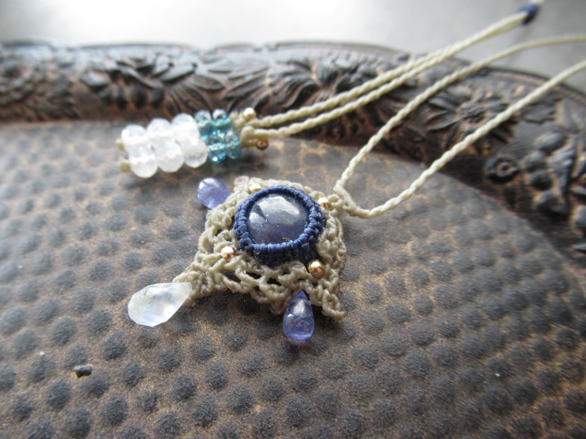ころんとまあるいサイズ感のタンザナイトをマクラメらしい編み込みをほどこしたささやかなサイズ感のペンダントに仕立てました。
