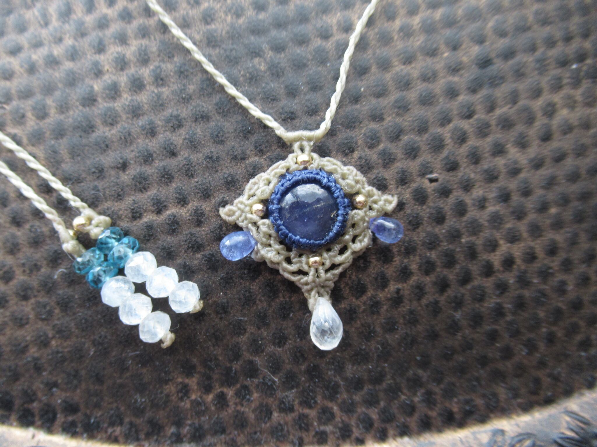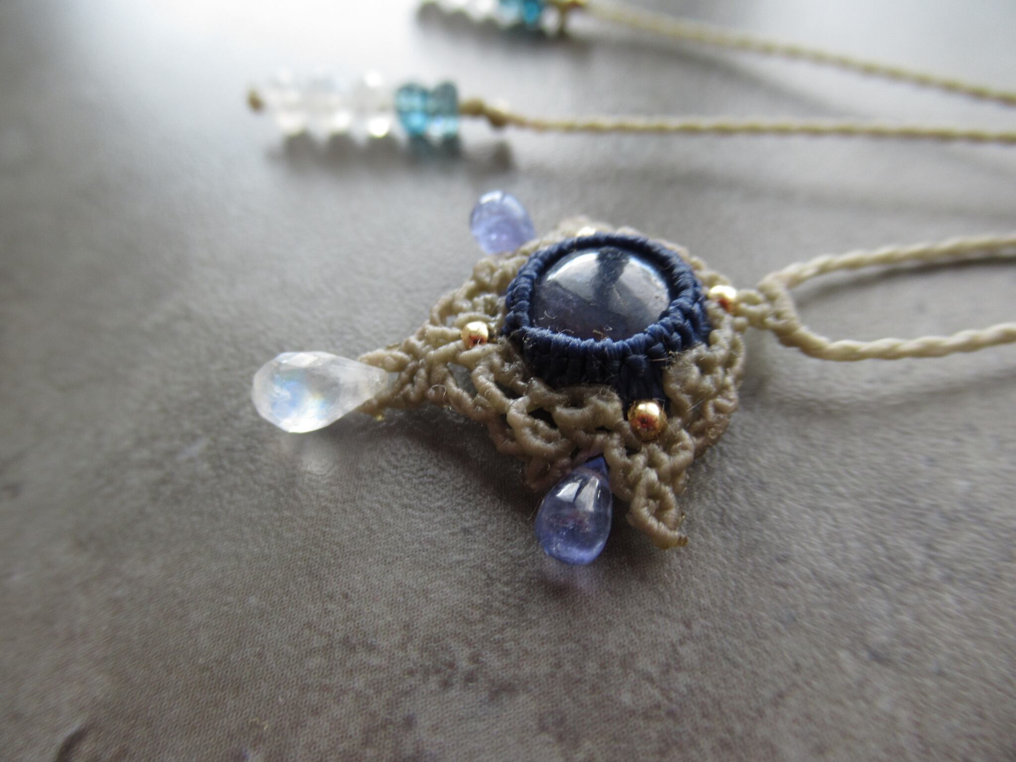 0.25mmの糸で繊細に編み上げたペンダントで、14kgfや宝石質のタンザナイト、レインボームーンストーンを編み込んでいます。