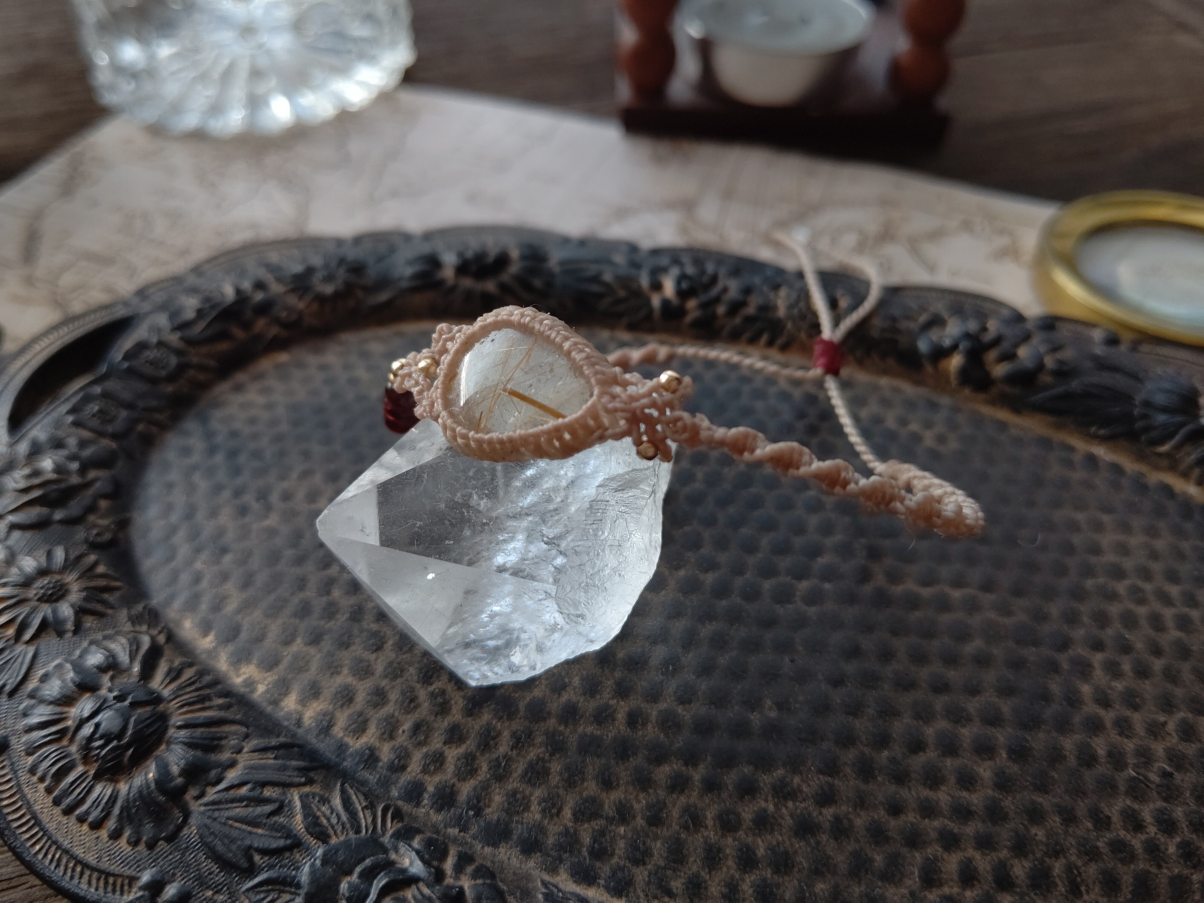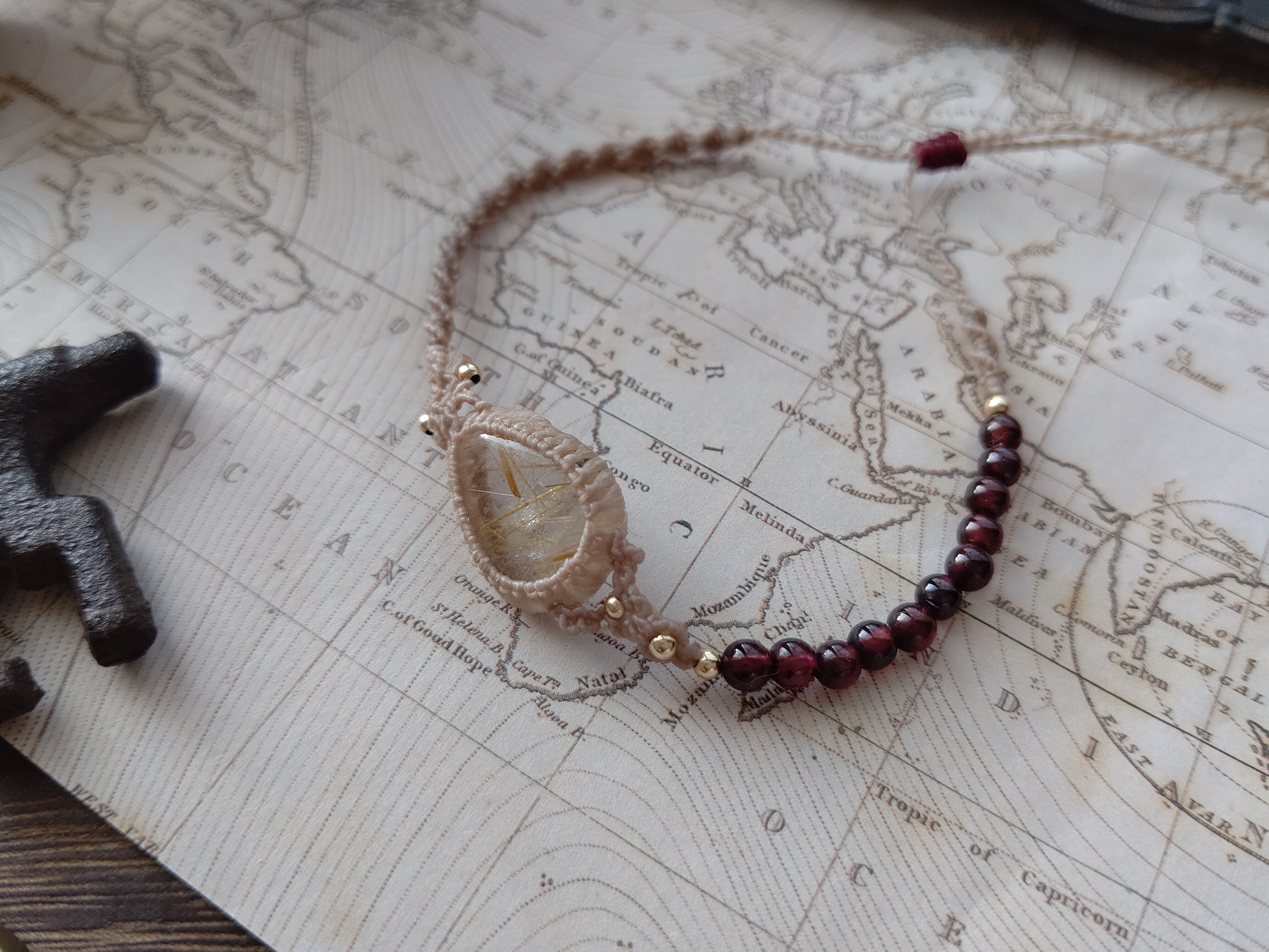 ルチルクォーツとヘソナイトガーネットのマクラメブレスレット