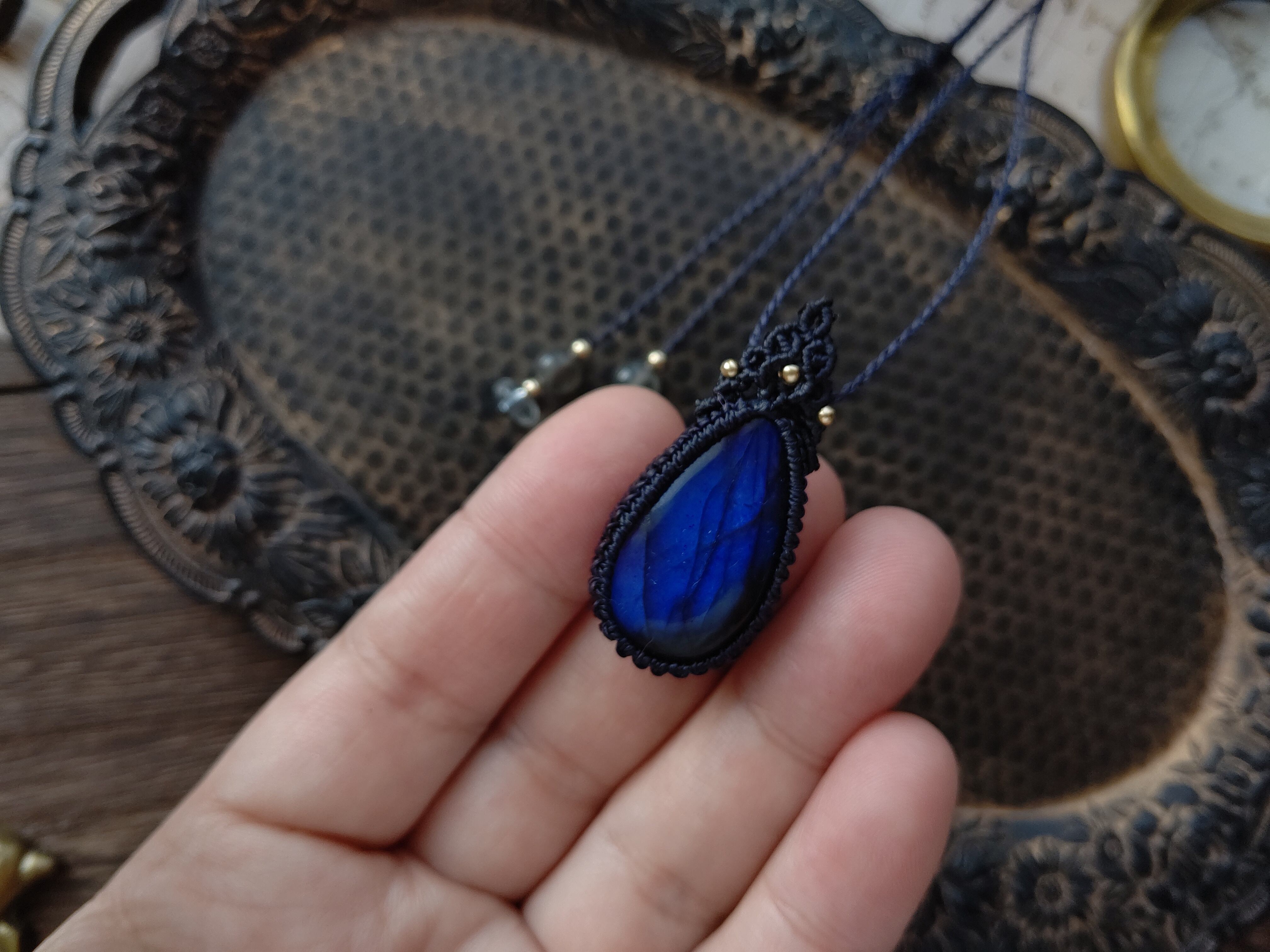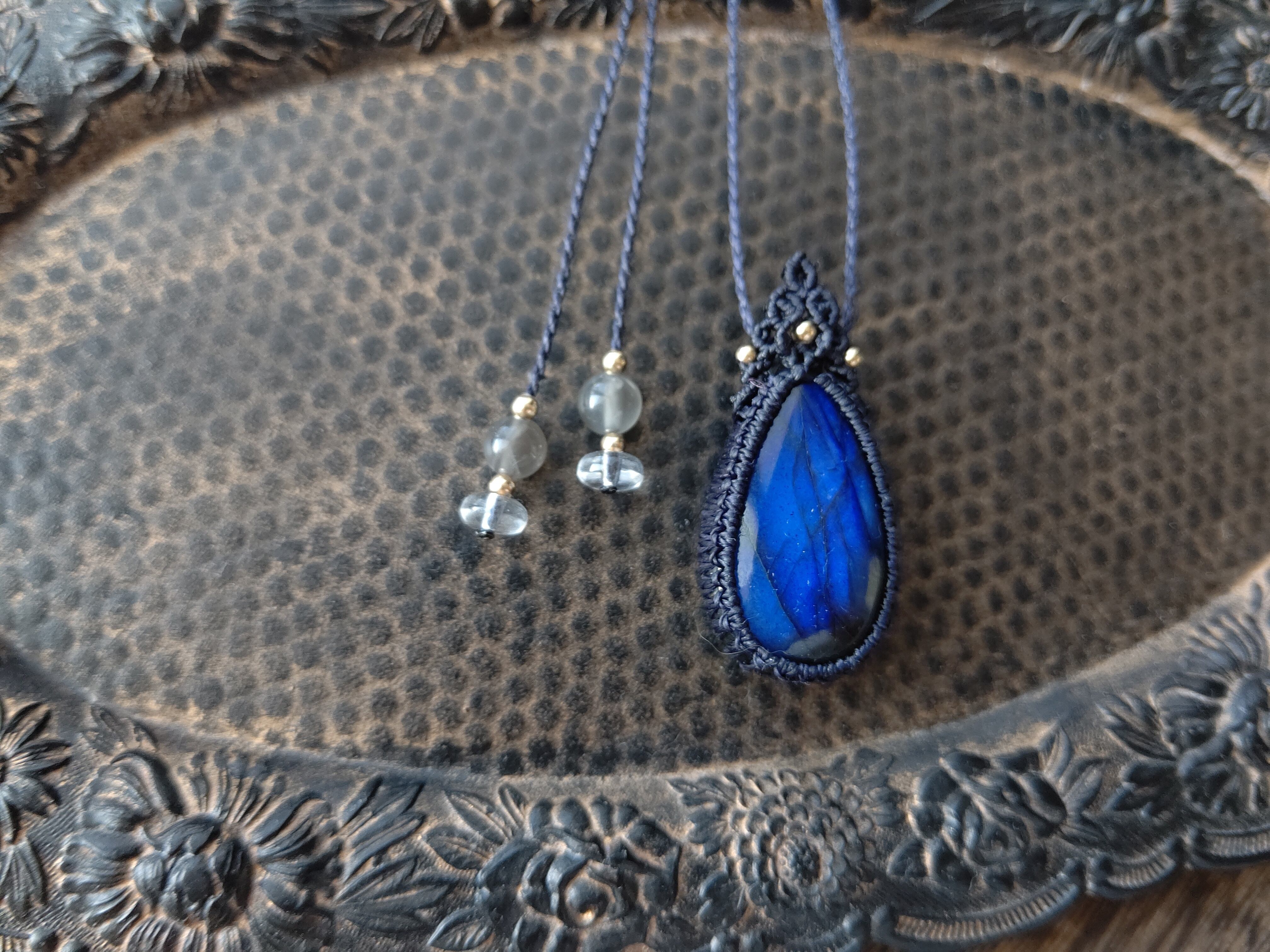 大粒のブルーラブラドライトでマクラメペンダントを製作しました。