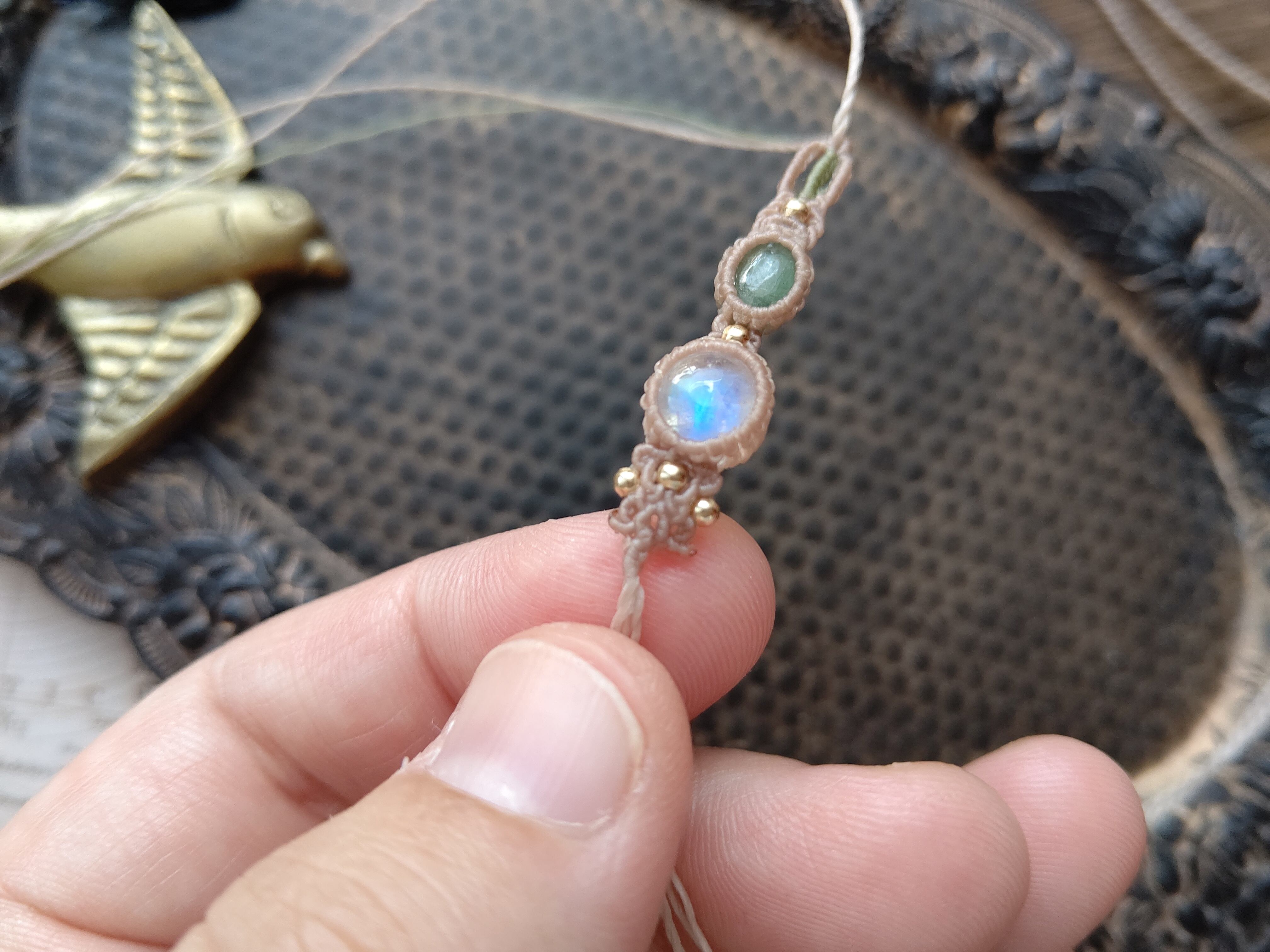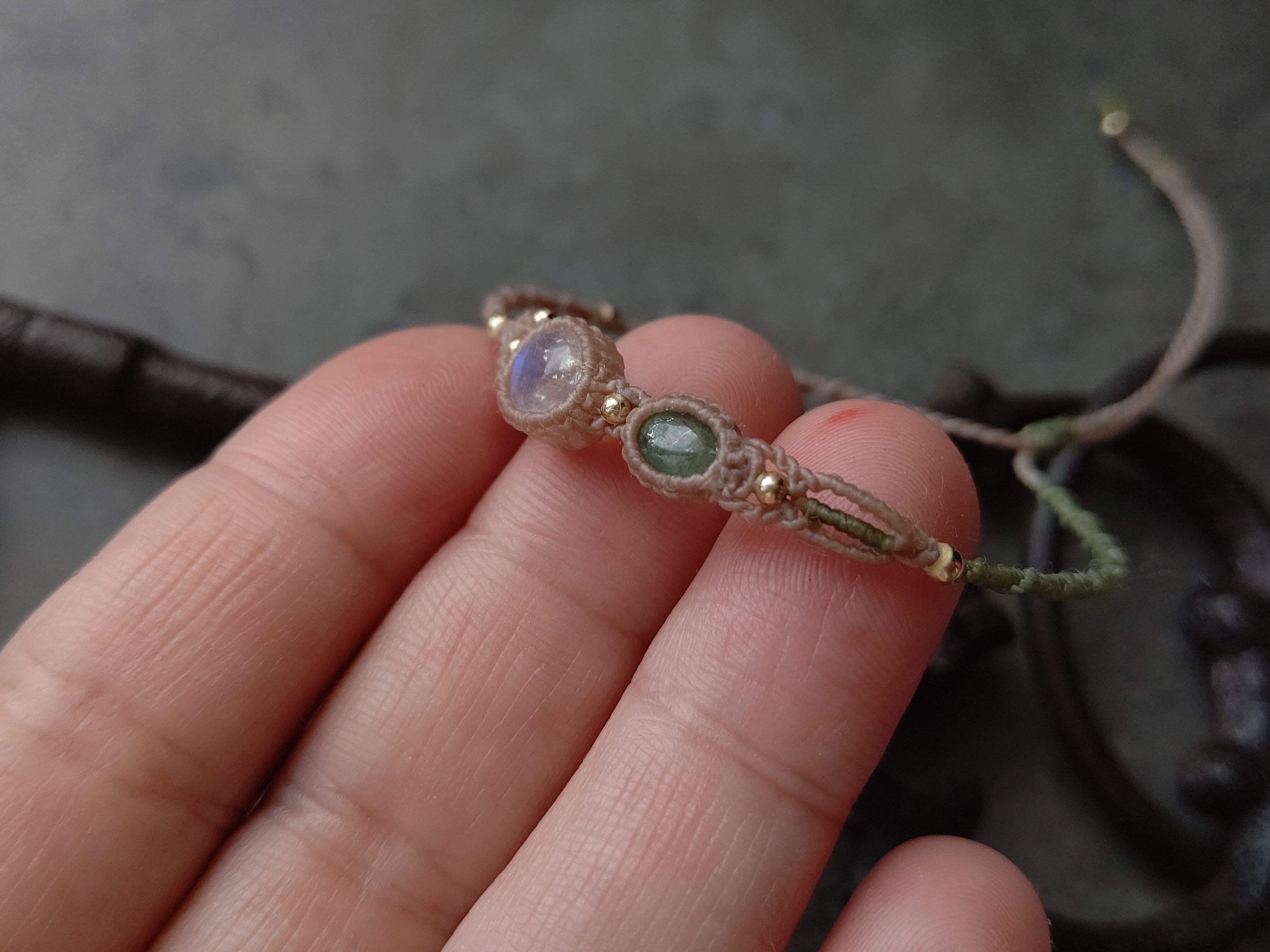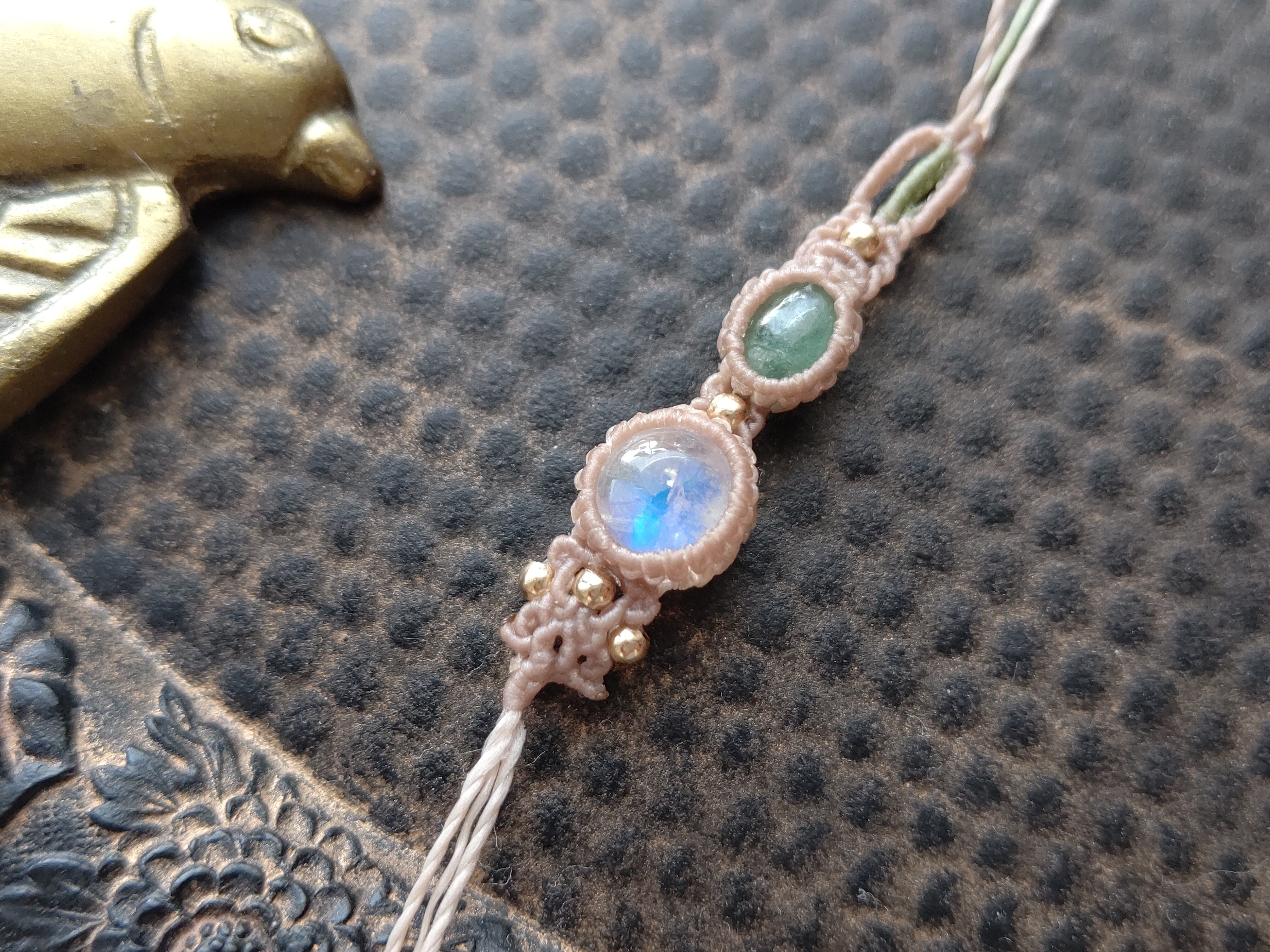 ふんわりと淡いエメラルドグリーンのエメラルドとシラーの美しいレインボームーンストーン(ホワイトラブラドライト)の組み合わせは上品で優しい印象です。アシンメトリーデザインで編み込み、差し色には落ち着いたモスグリーンの糸を合わせました。