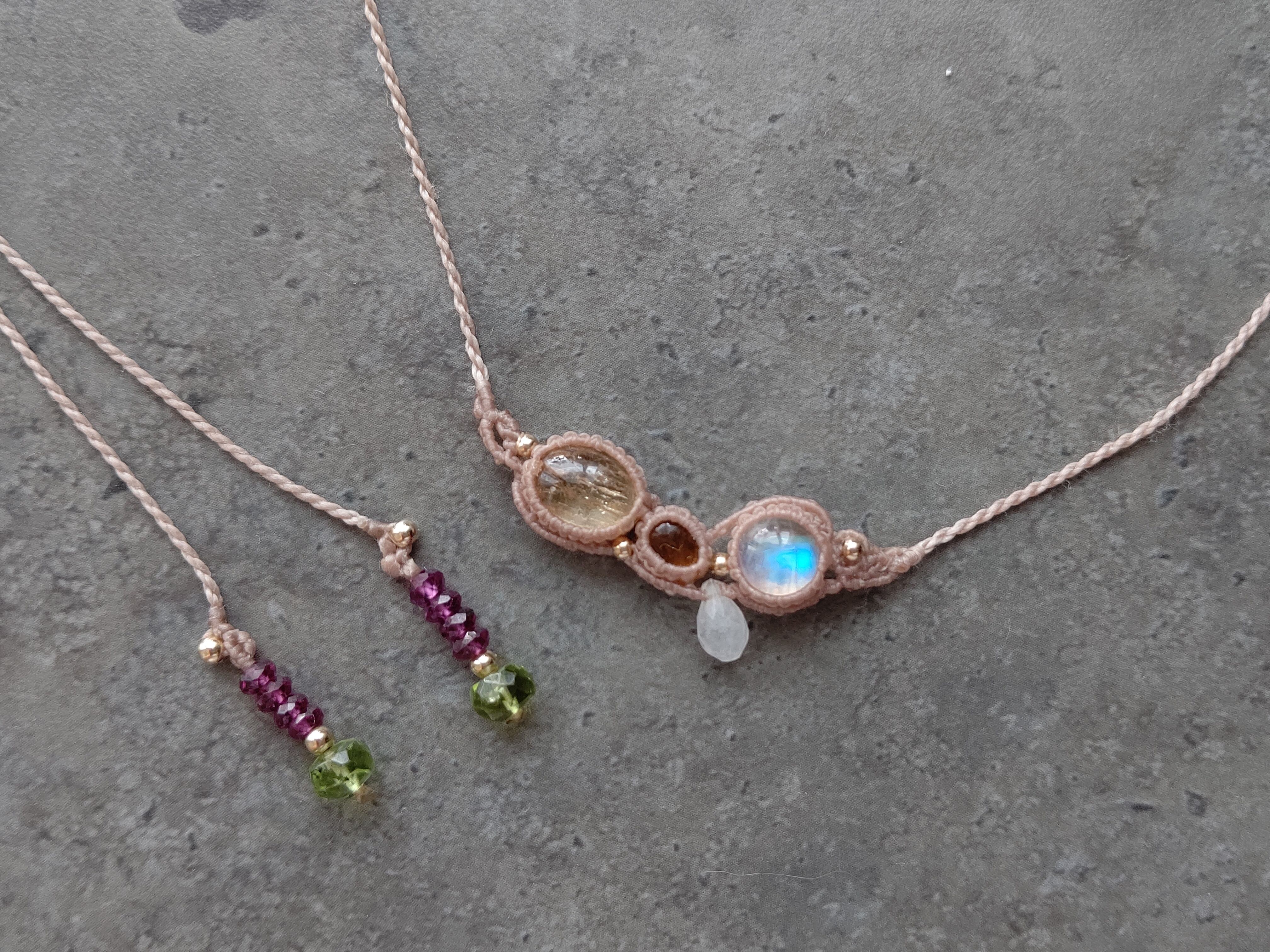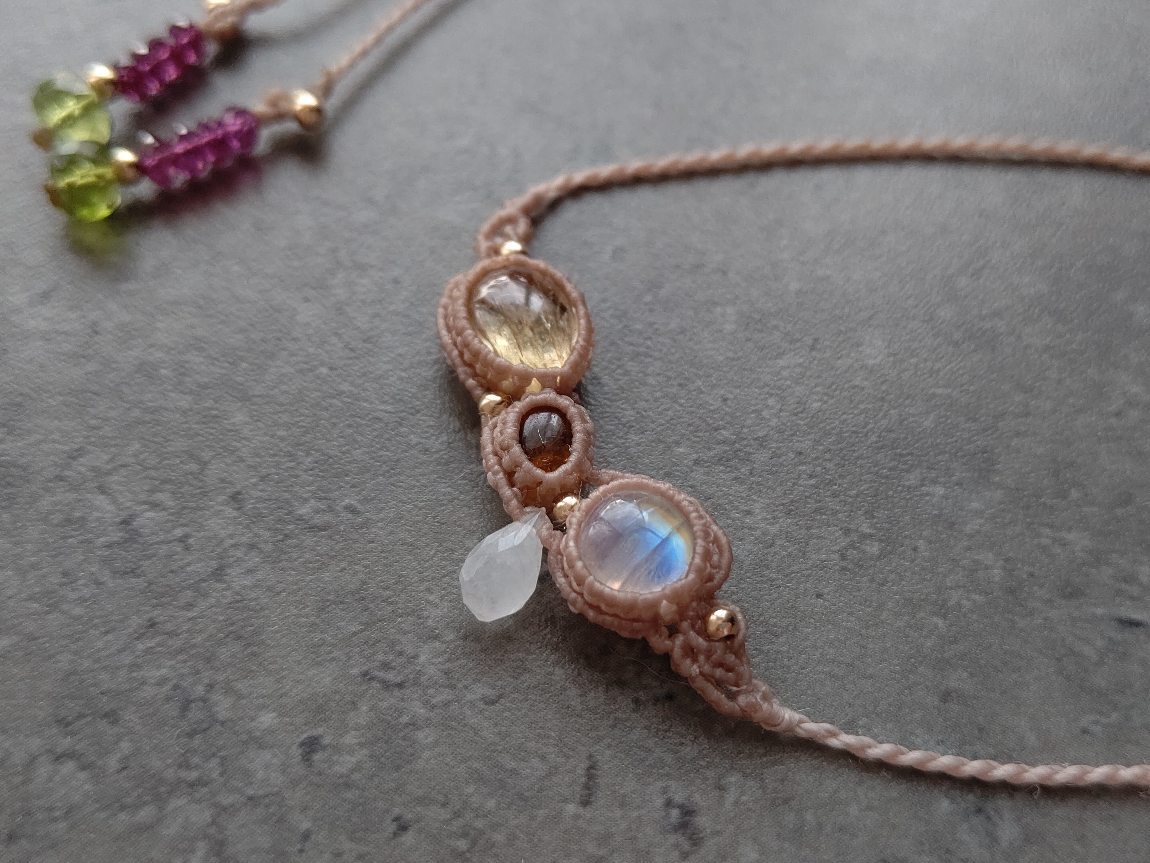インペリアルトパーズ×オレンジトルマリン×レインボームーンストーンの3連マクラメネックレス