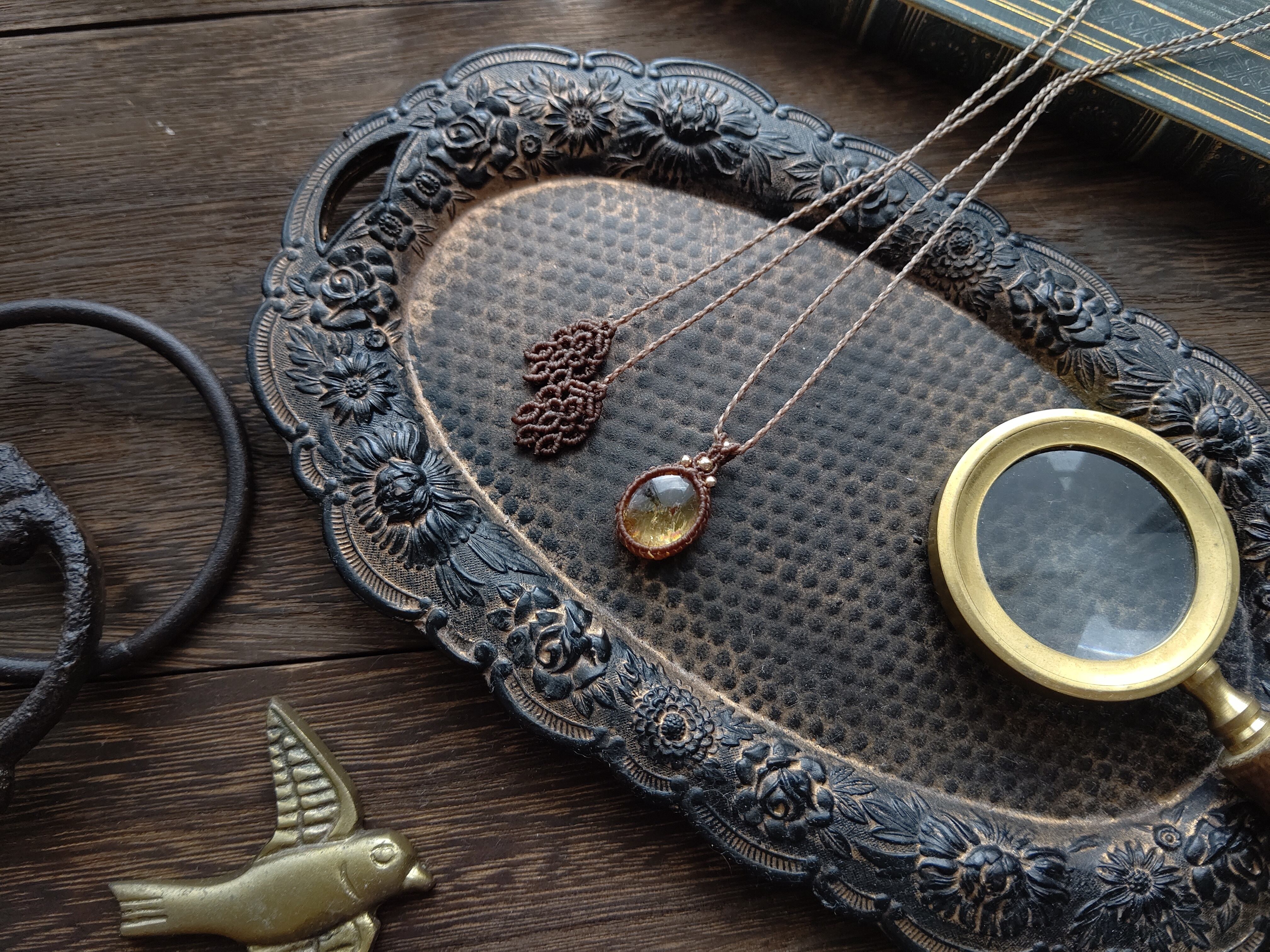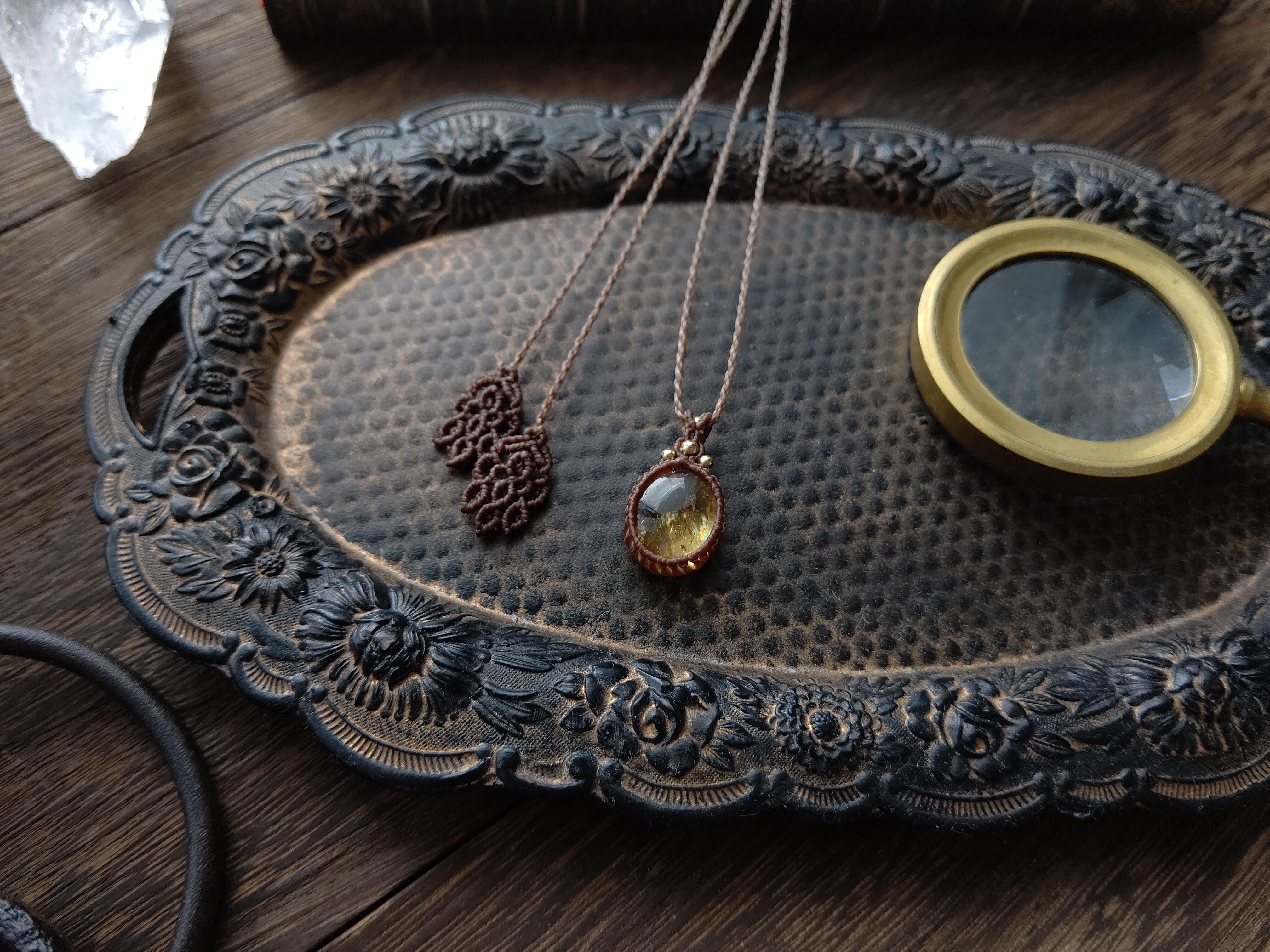 虹入りのブラジル産非加熱シトリンをペンダントに仕立てました。シンプルですっきりとしたデザインですが、ワンポイントに14kgfを編み込み、少し上品で華やかなペンダントにしました。