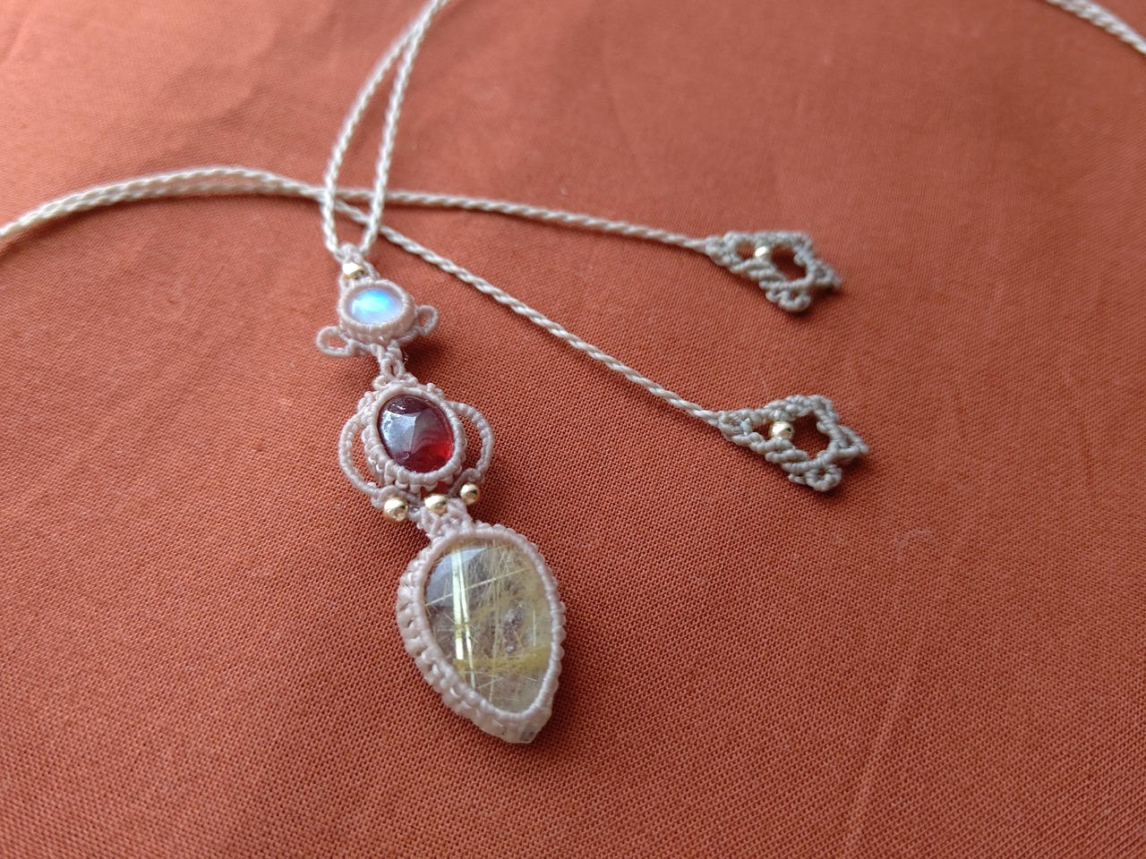 ルチルクォーツ×ヘソナイトガーネット×レインボームーンストーンの3連マクラメネックレス