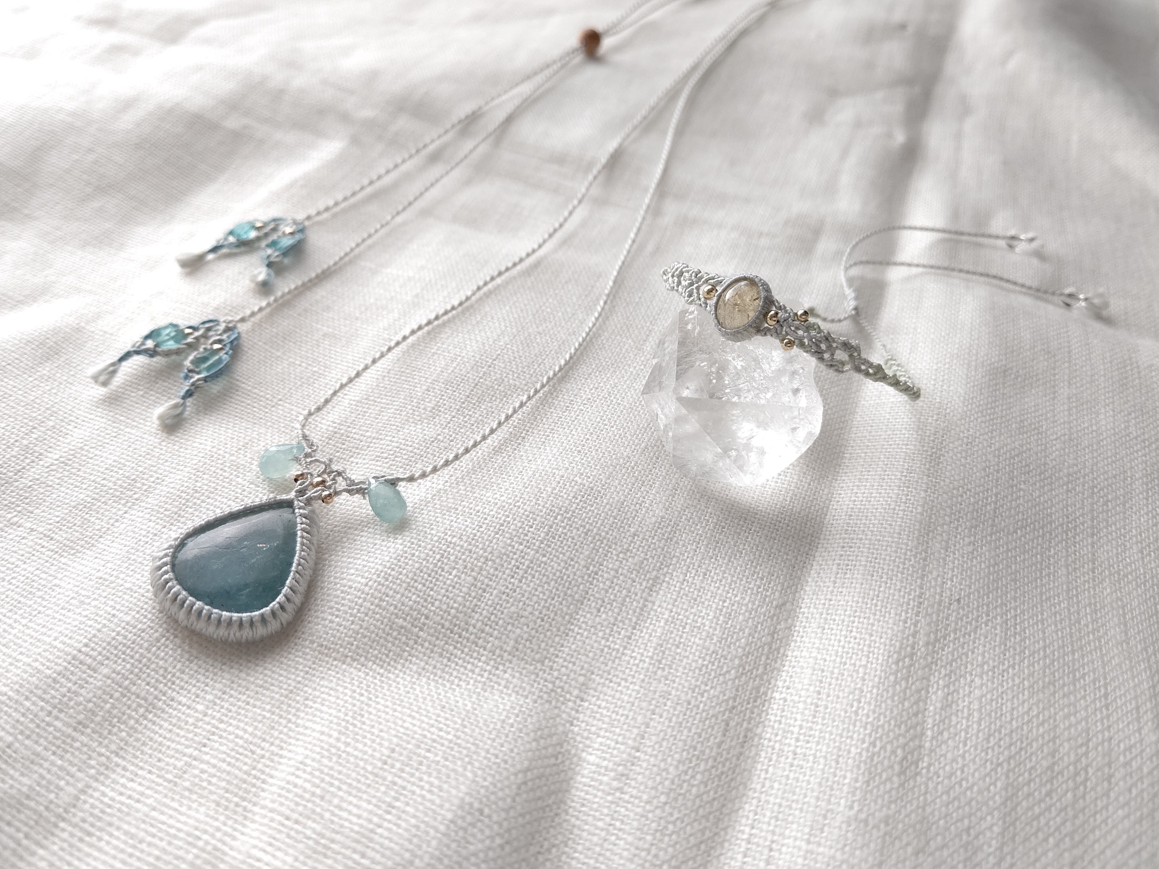 涼やかな滝壺の水面のような淡く幻想的な青さを持つ、非加熱アクアマリンを絹糸で丁寧に編み上げたペンダントを製作いたしました。