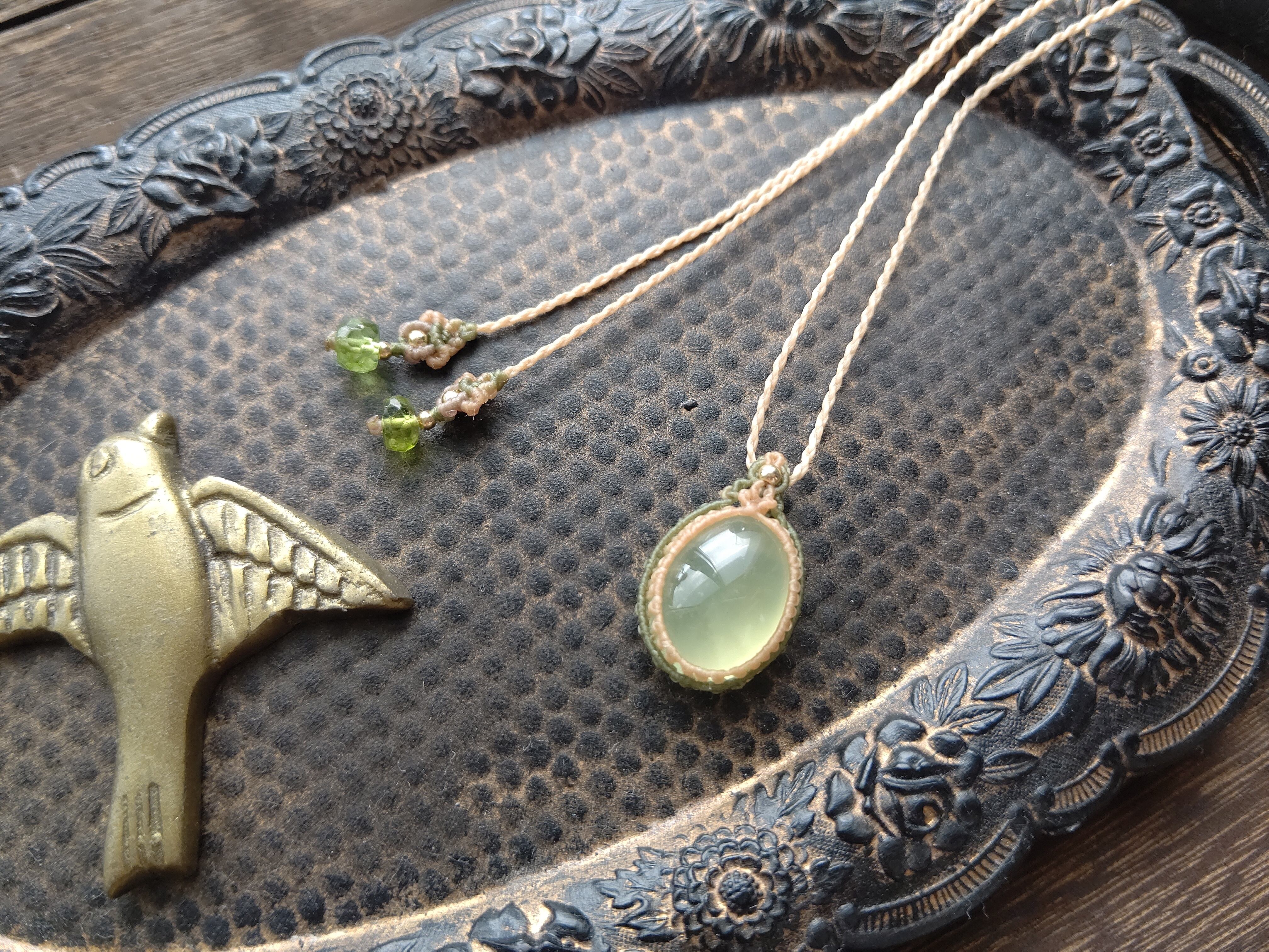 もぎたてのシャインマスカットのようなプレナイトをマクラメならではのダブルフレームで編み込んだシンプルですっきりとしたデザインのペンダントです。