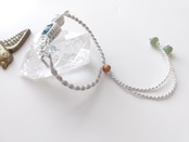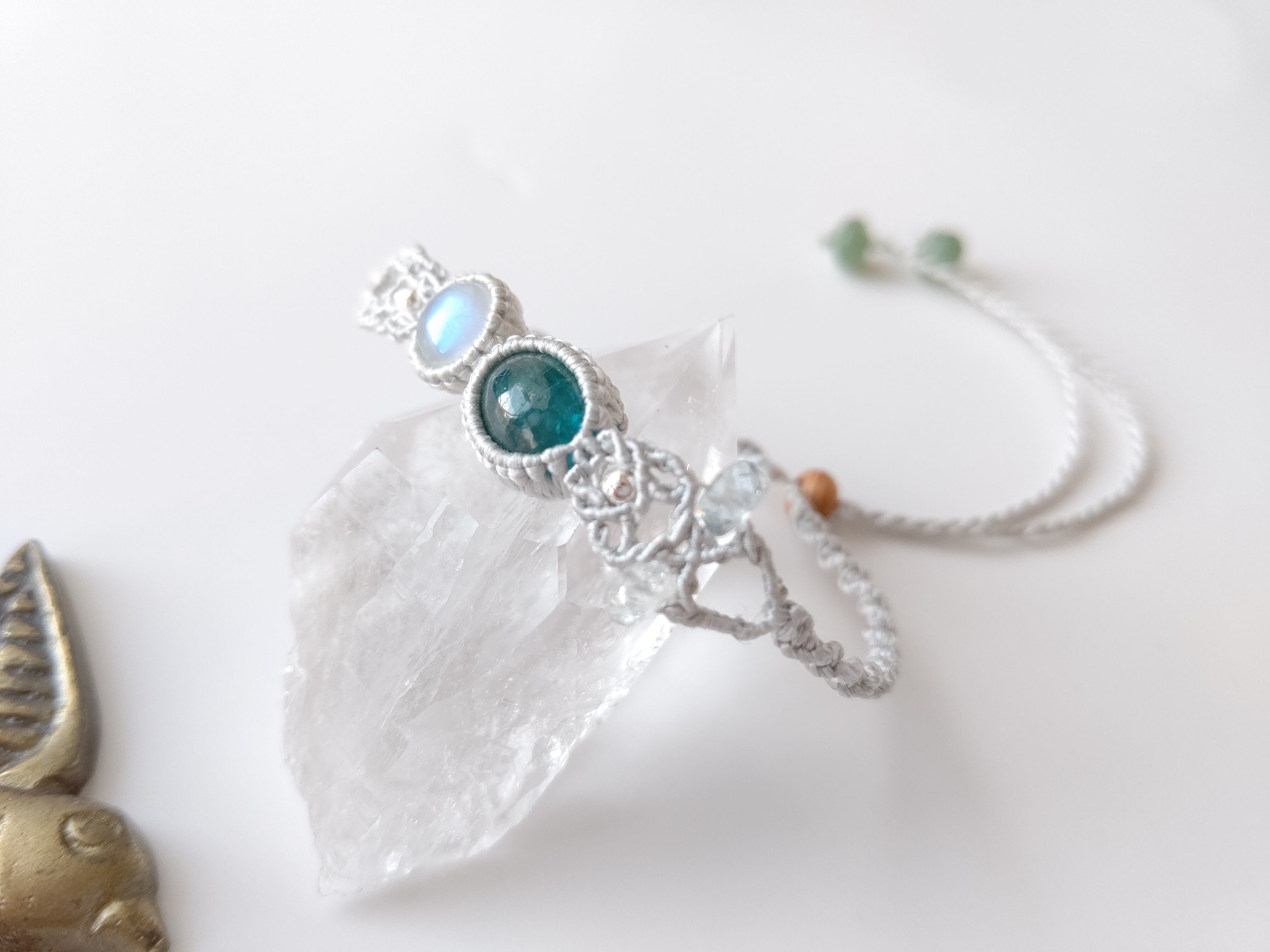 こちらのアパタイトは少し濃い目のグリーンブルーです。深いお色のグリーンを帯びたブルーがとても印象的です。ブレスレットはアシンメトリーデザインで丁寧に編み込んでいます。左右にはsilver925をアクセントにあしらい、アパタイトの方にゴシェナイトを編み込みました。