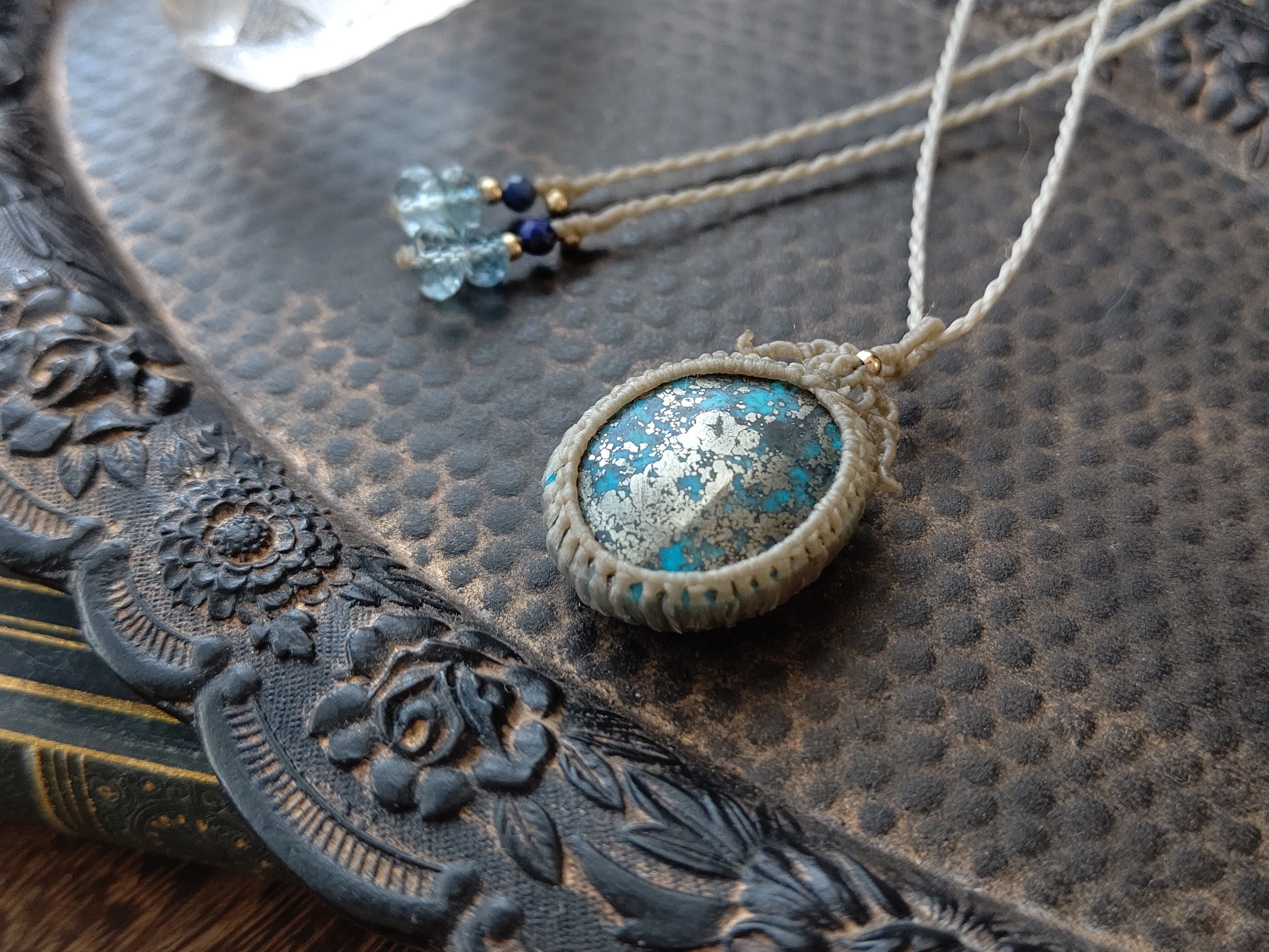 今回はホワイトグレーの0.25mmの糸で丁寧に編み込み仕立てました。楕円形のルースでパイライトがしっかりと入り込んでいる、少し重厚感のある大人っぽい色合いです。パイライトのカラーが角度によって金にも銀にも見え、遠目からでも目を引きます。