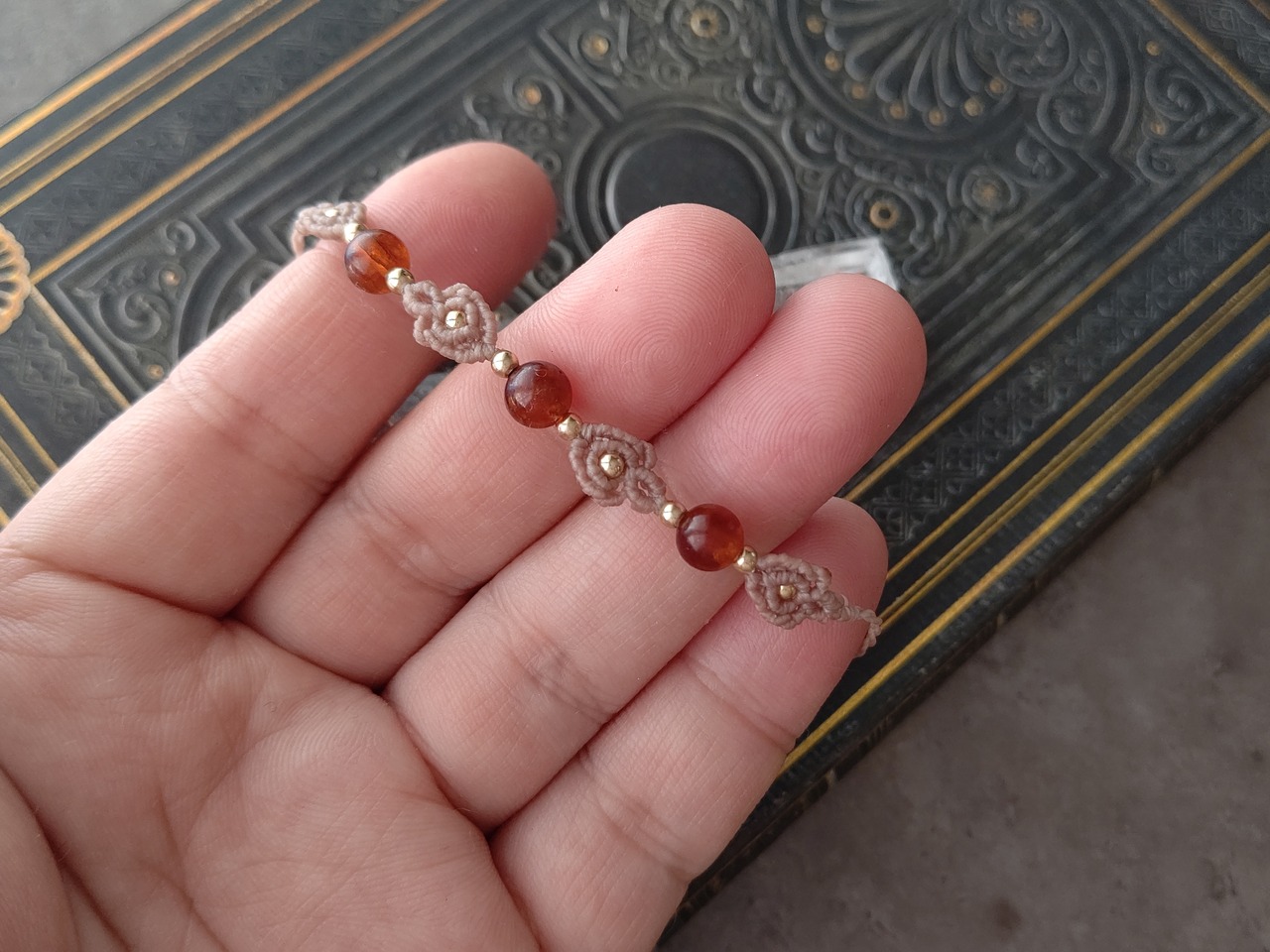ヘソナイトガーネットの天然石ビーズを4粒使い、繋ぎ目にマクラメらしい紋様を編み込んだシンプルなワンポイントブレスレットを製作しました。