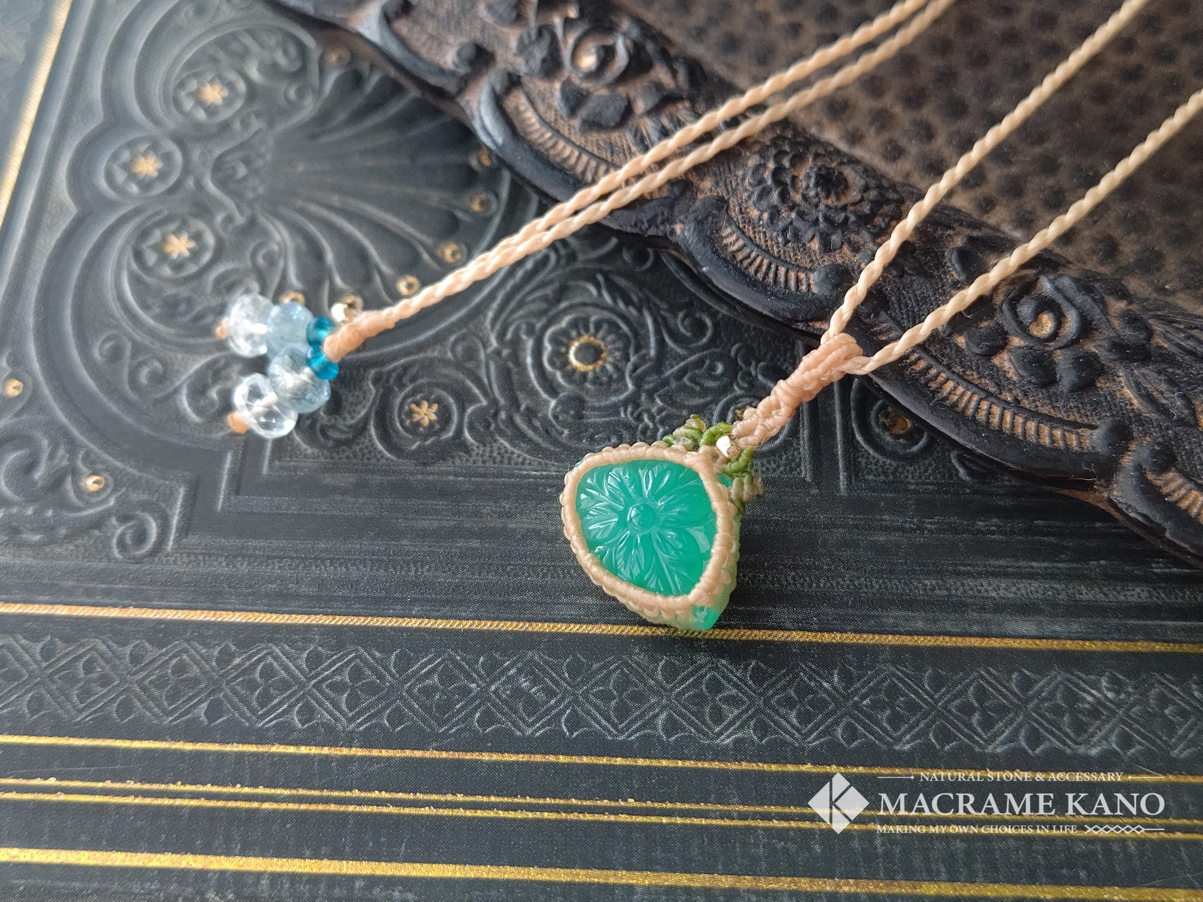 アクセントにグラスグリーンの編み糸を編み込み、14kgfビーズをあしらっています。くっきりとした美しい色合いの天然石のペンダントですので、遠目からでもワンポイントとしてとても印象的です。