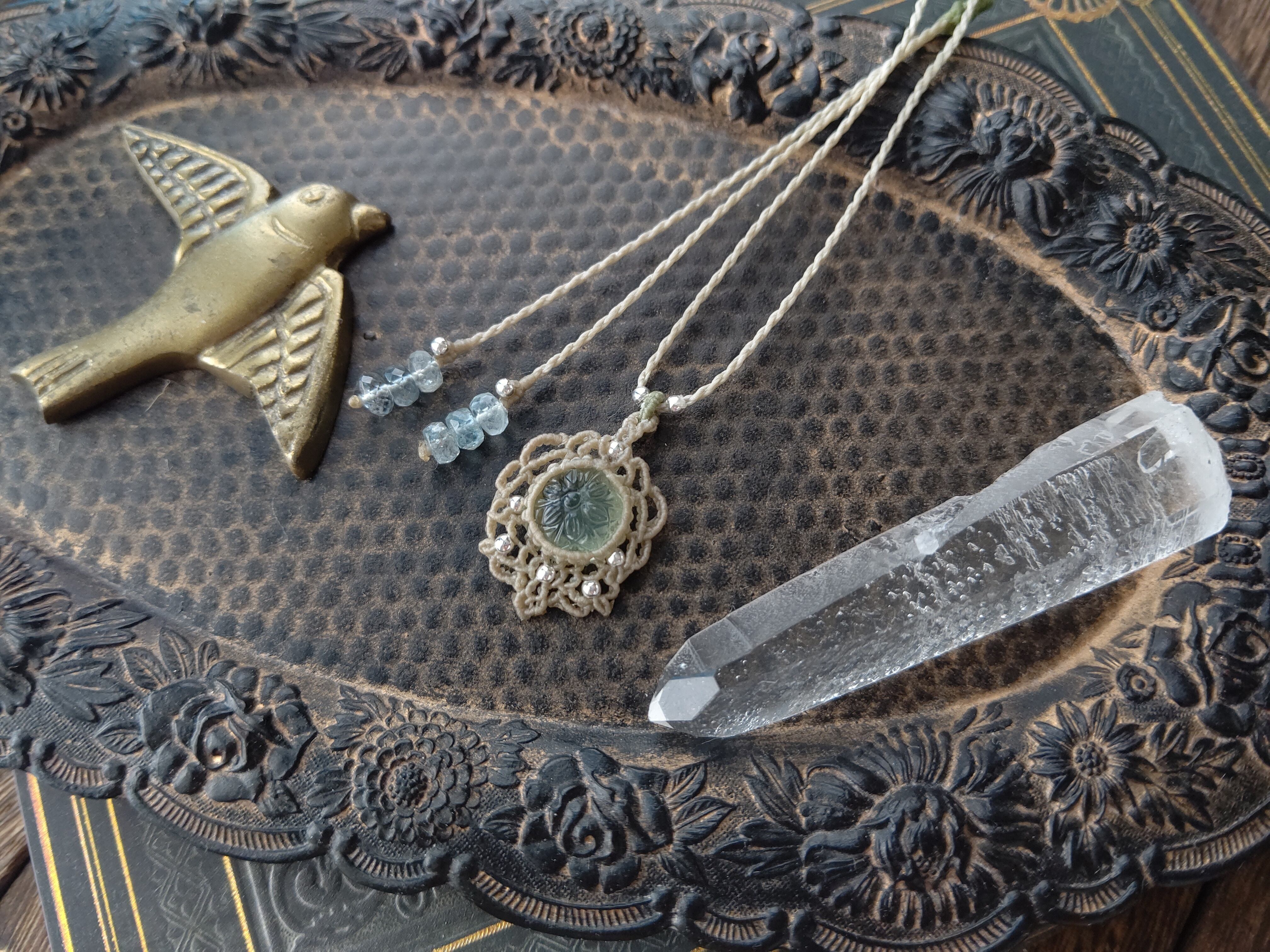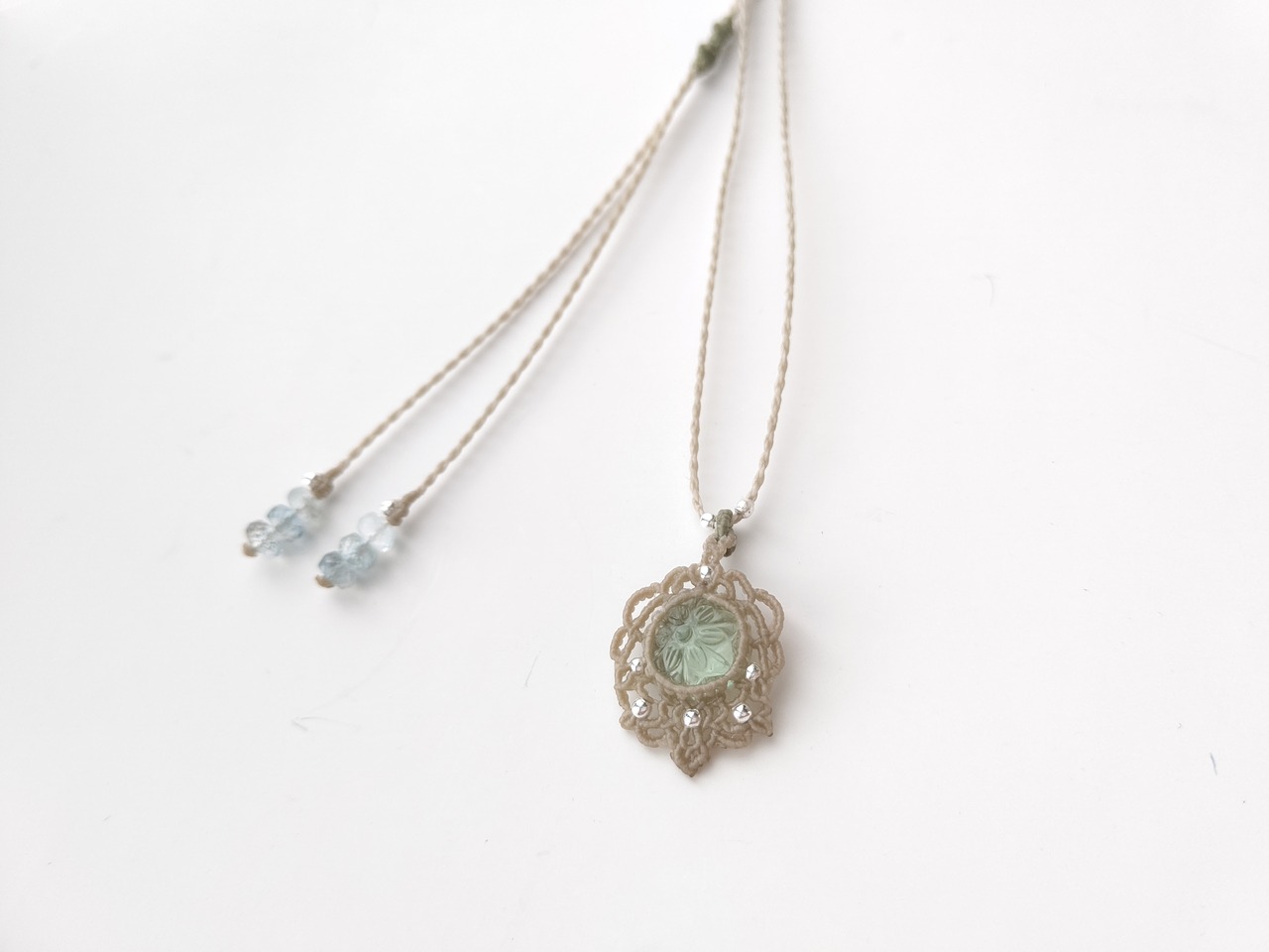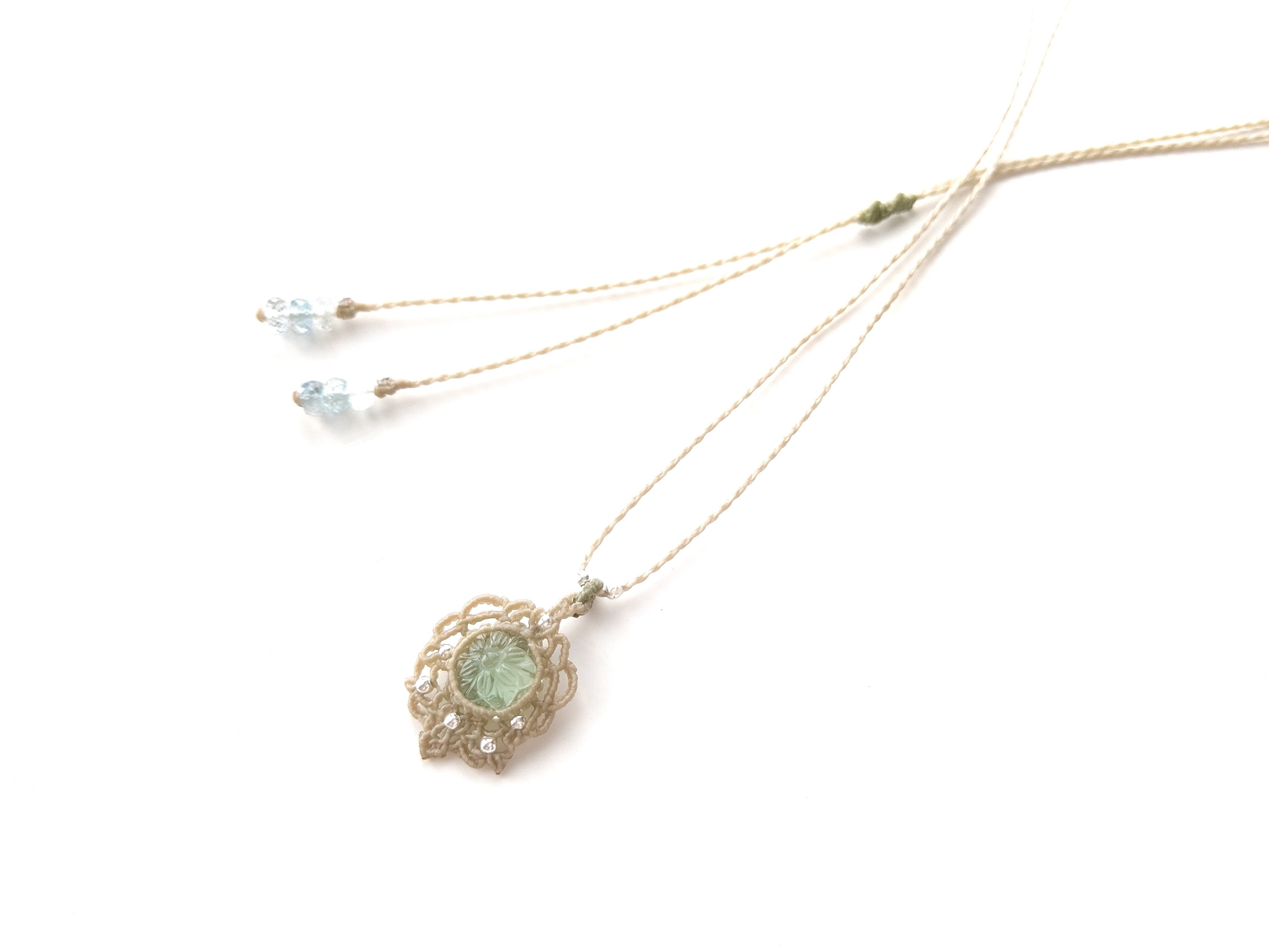 お花の模様が彫り込まれた透明度の高いグリーンフローライトをお花と葉っぱ模様のペンダントにしました。