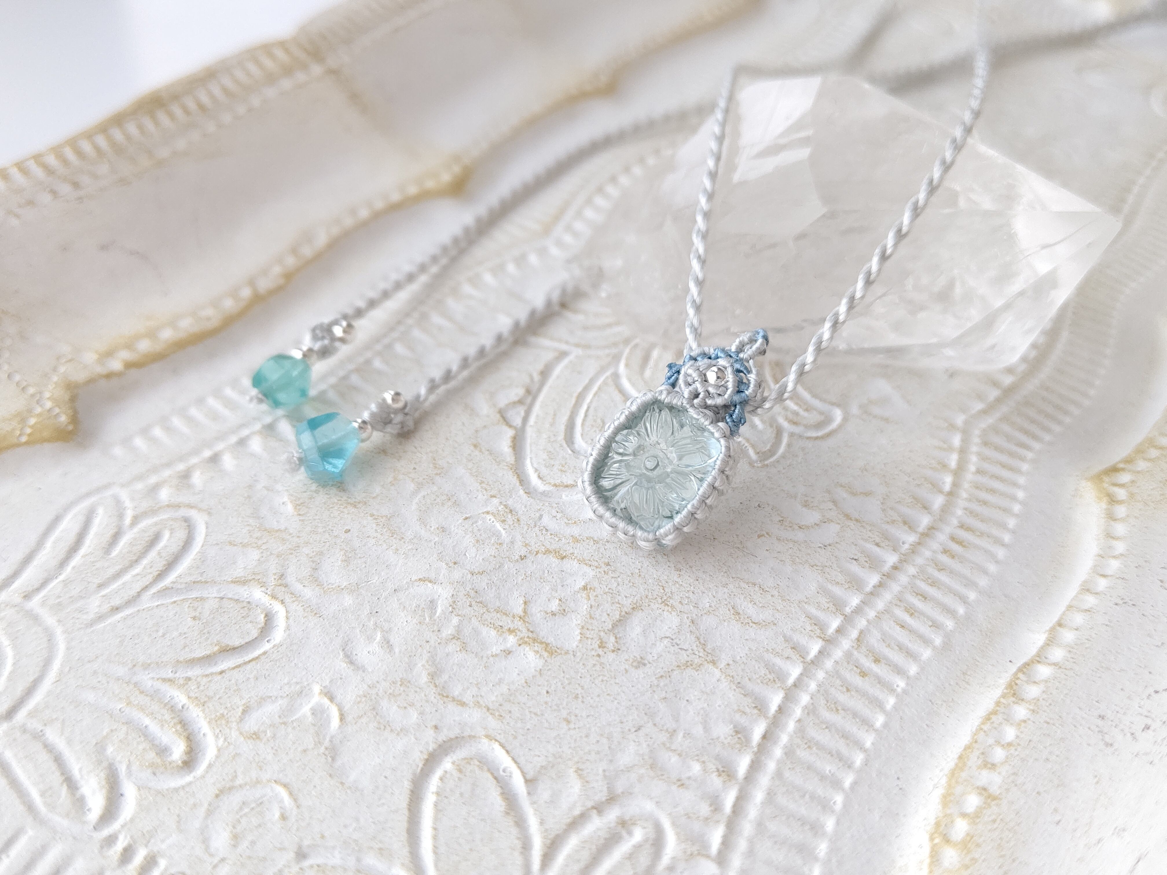 お花模様のカービングが施された透明感のあるアクアマリンをペンダントに仕立てました。編み糸は上質なシルクを使っており、光沢のある上品で軽く、肌触りの良いアクセサリーになっています。