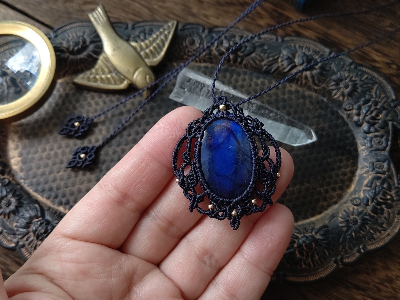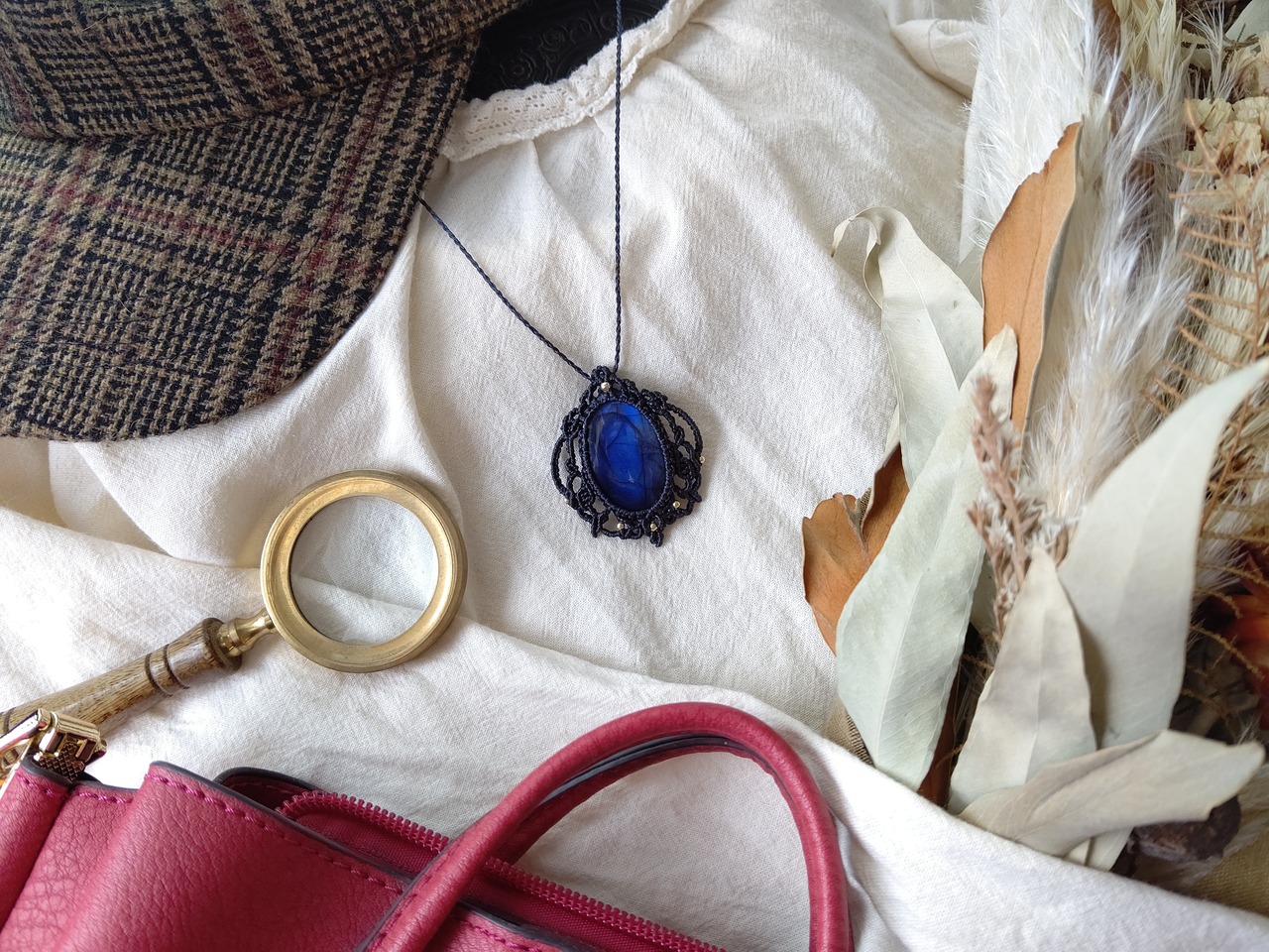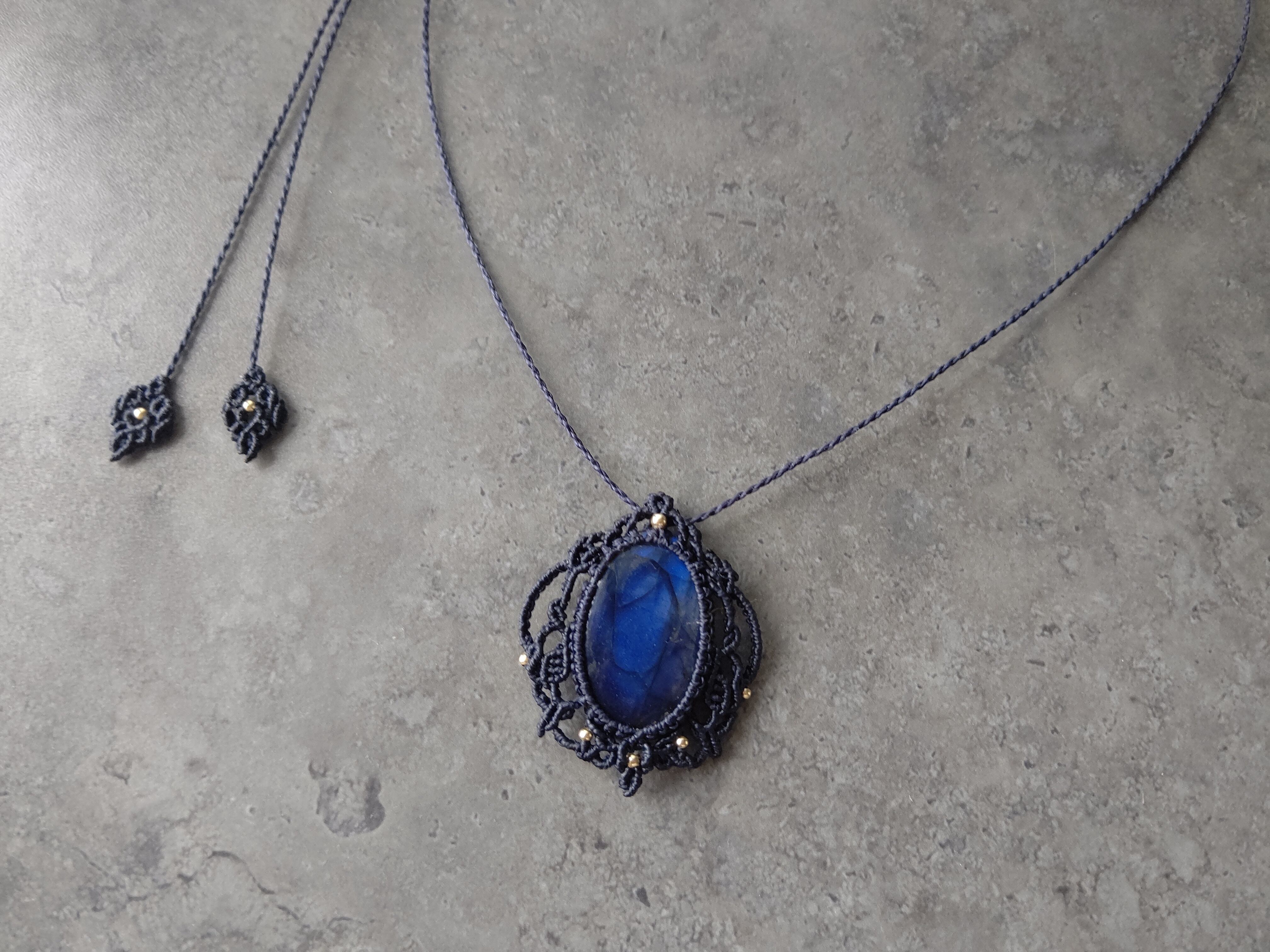 大粒できめ細かなブルーのシラーが浮かび上がるラブラドライトをダークネイビーの糸でシックに編み込み、ペンダントに仕立てました。