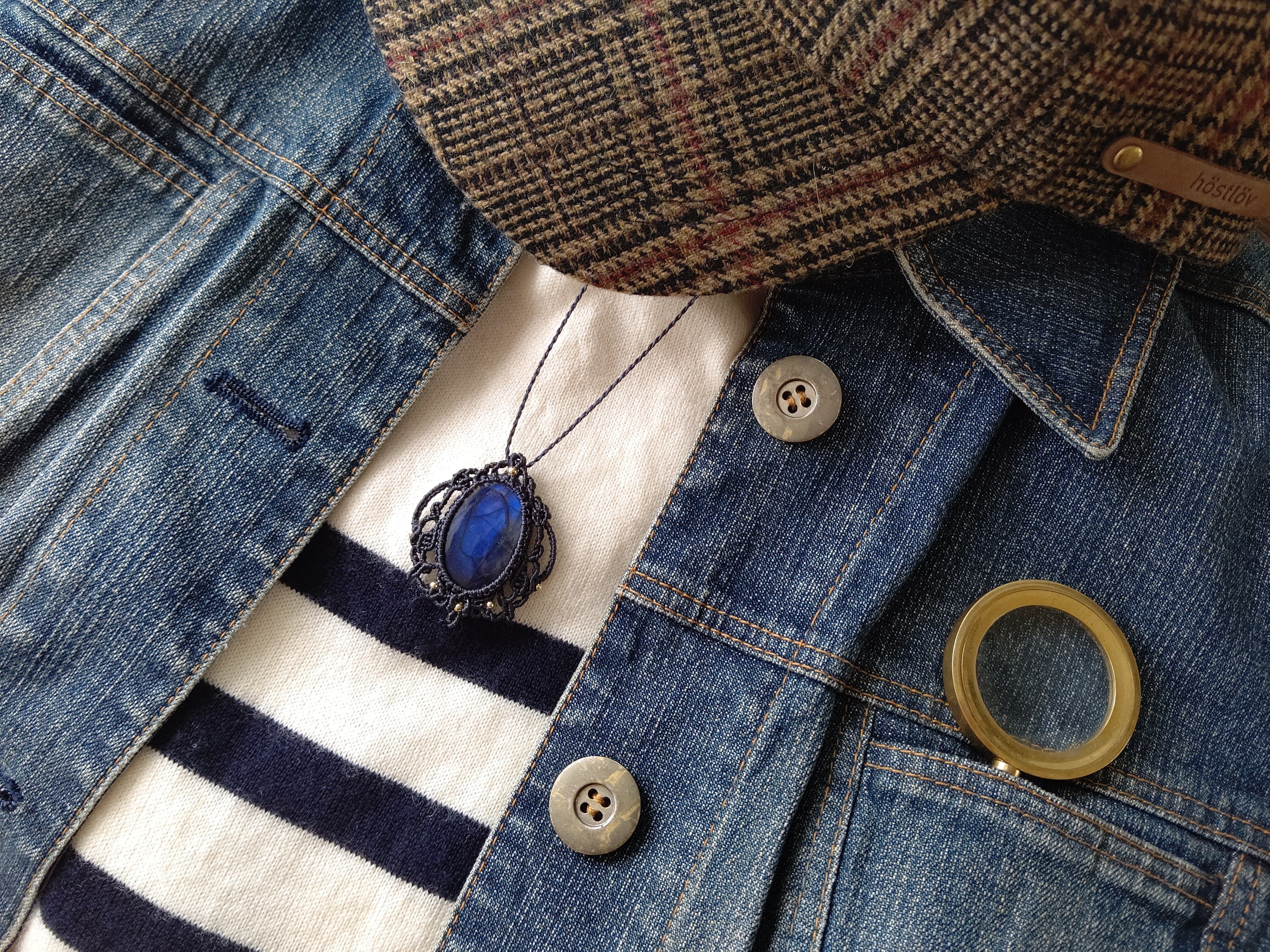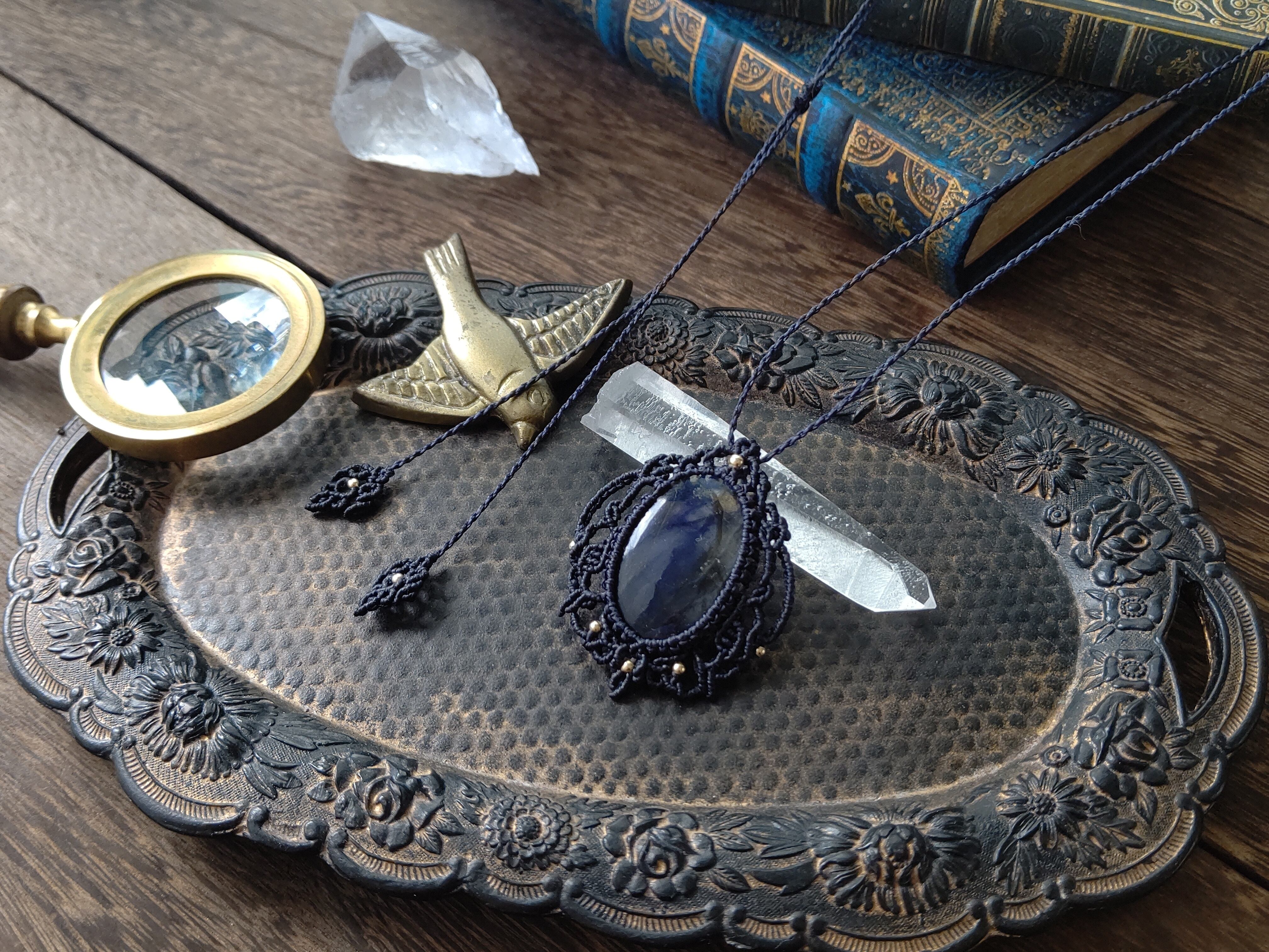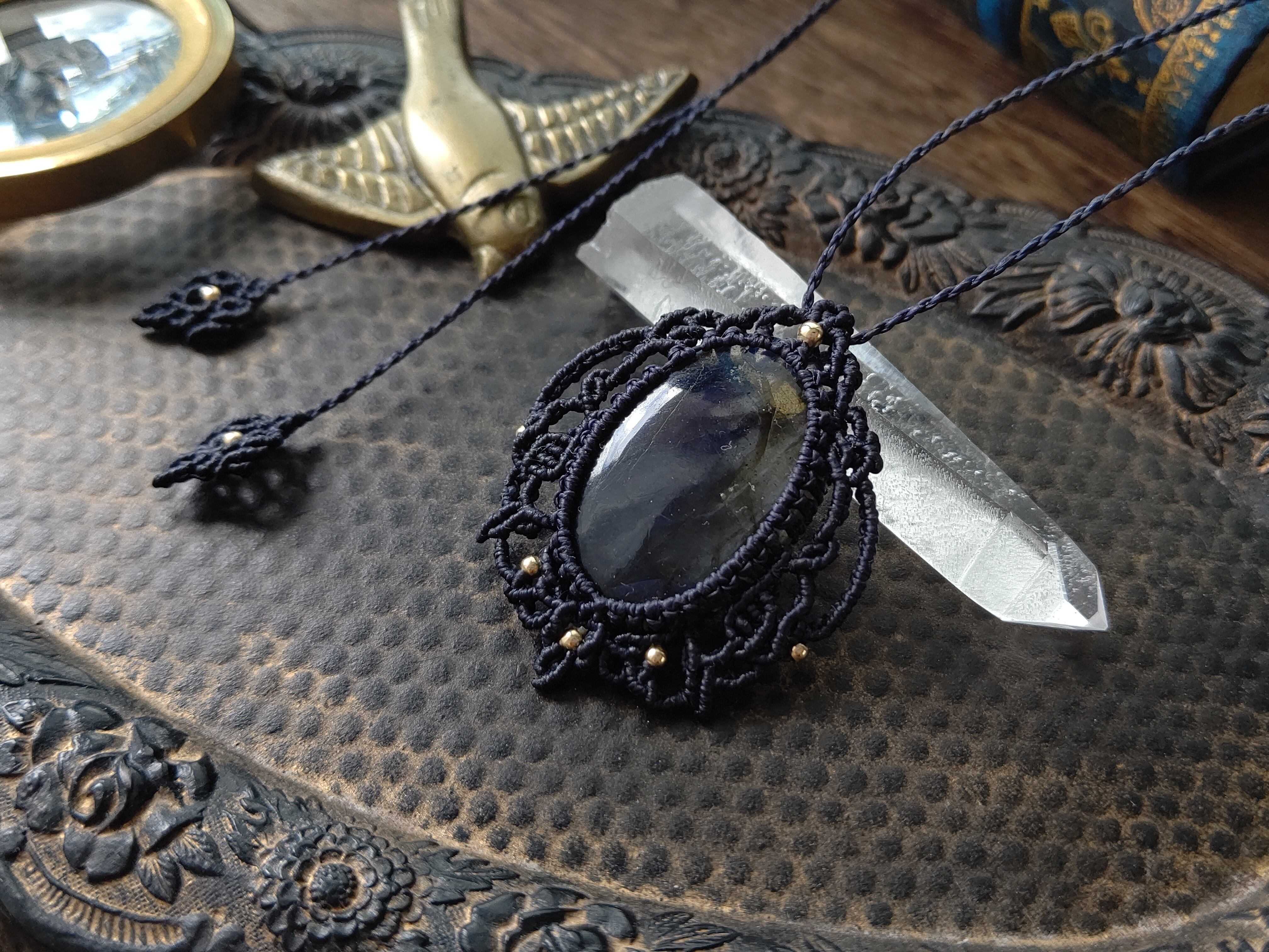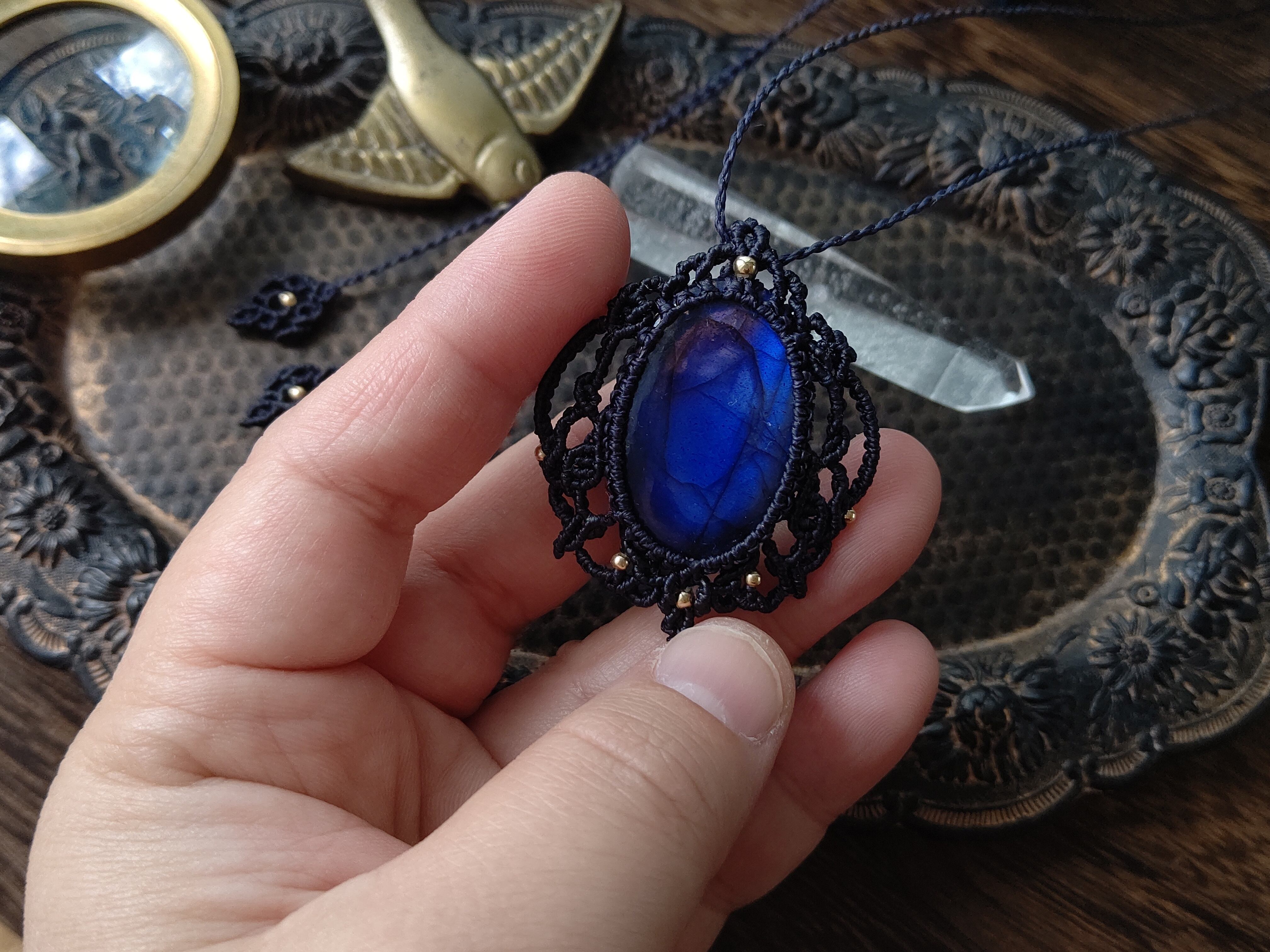 大粒できめ細かなブルーのシラーが浮かび上がるラブラドライトをダークネイビーの糸でシックに編み込み、ペンダントに仕立てました。