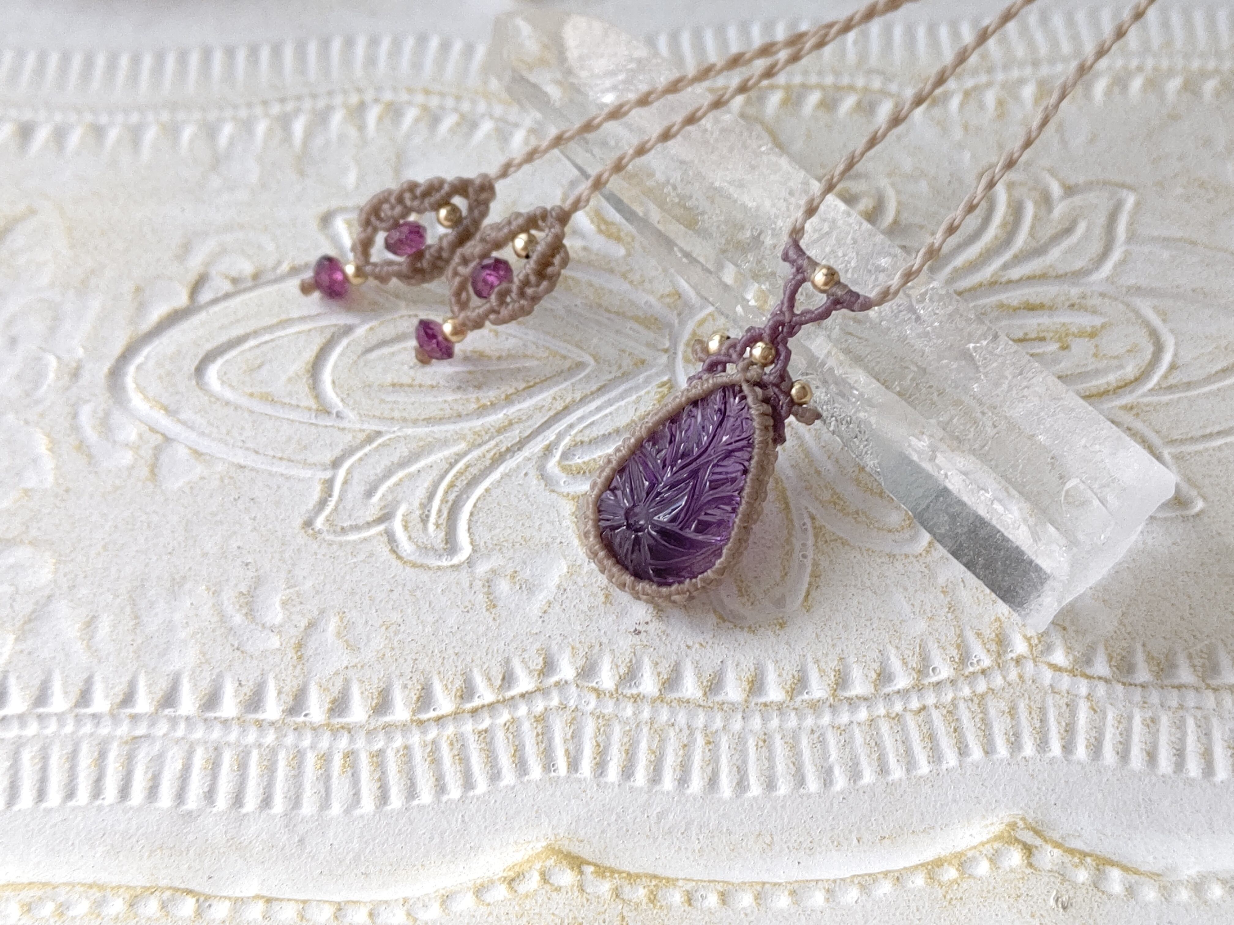ナチュラルリーフとお花模様のアメジストのマクラメペンダント