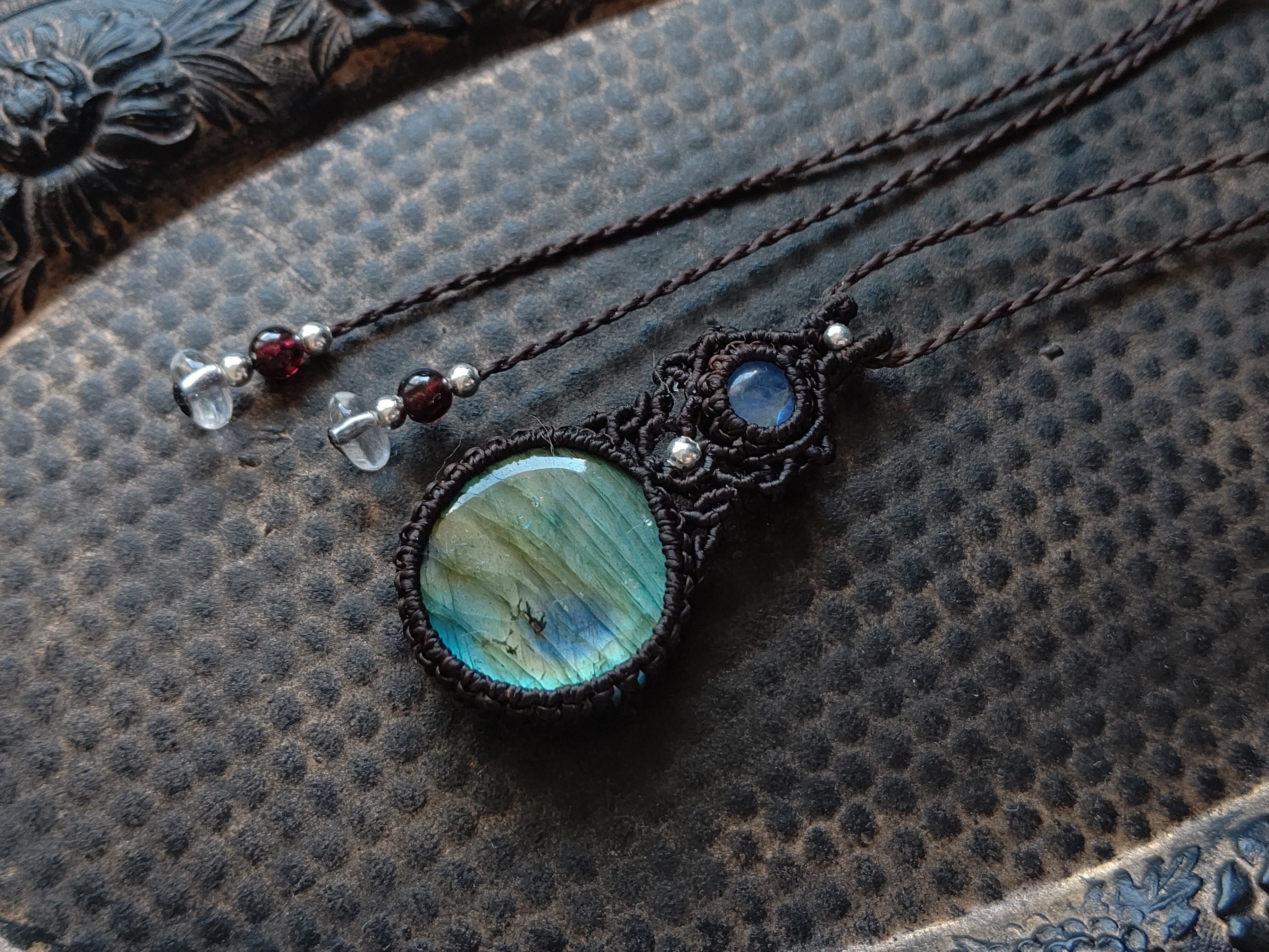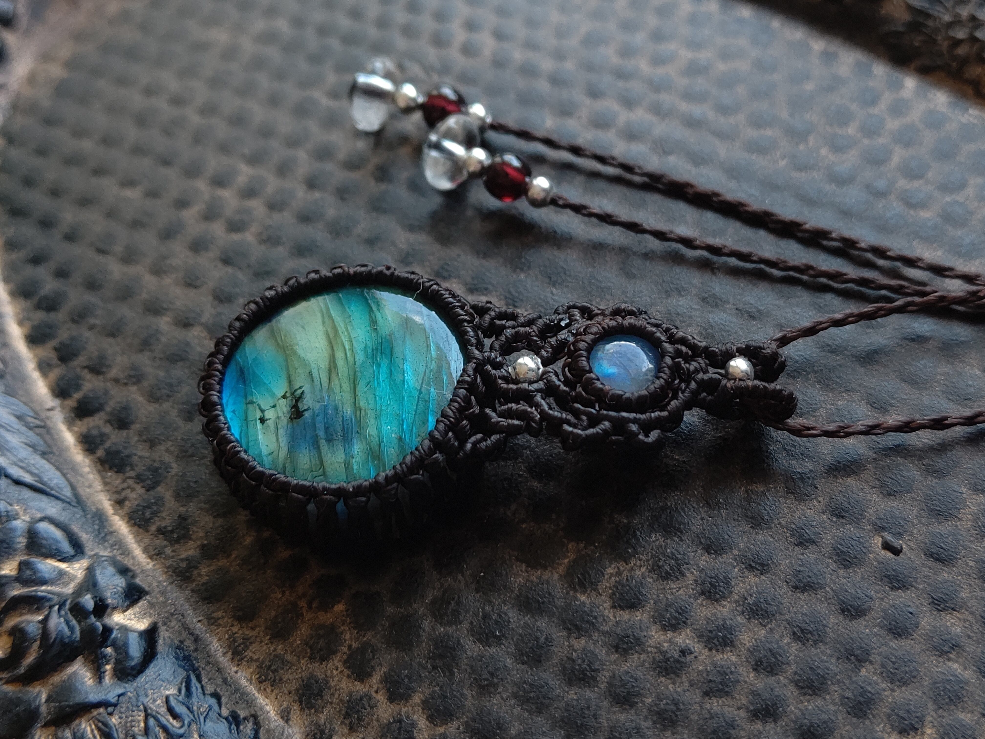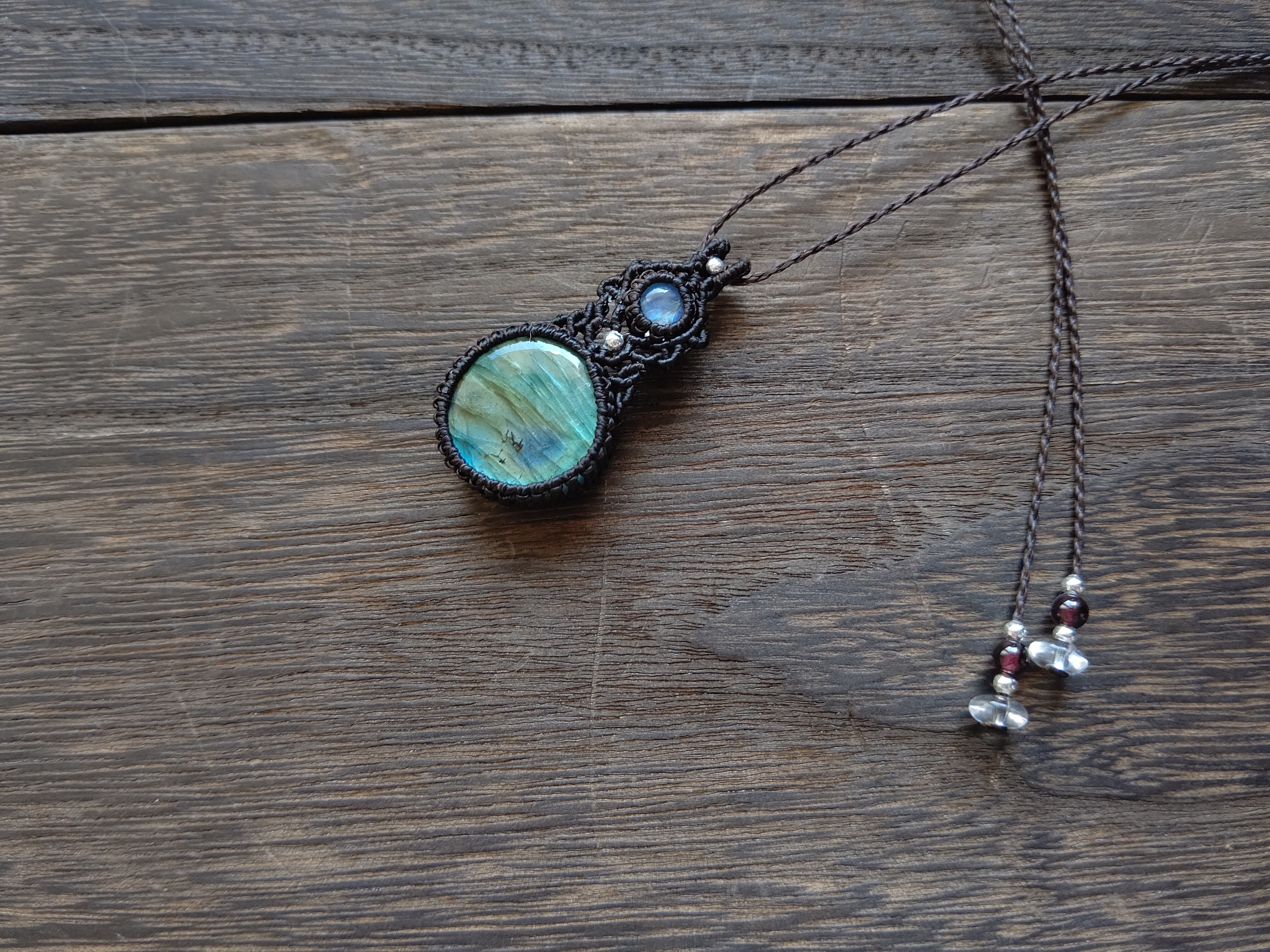 ラブラドライト×ブルームーンストーンのマクラメペンダント