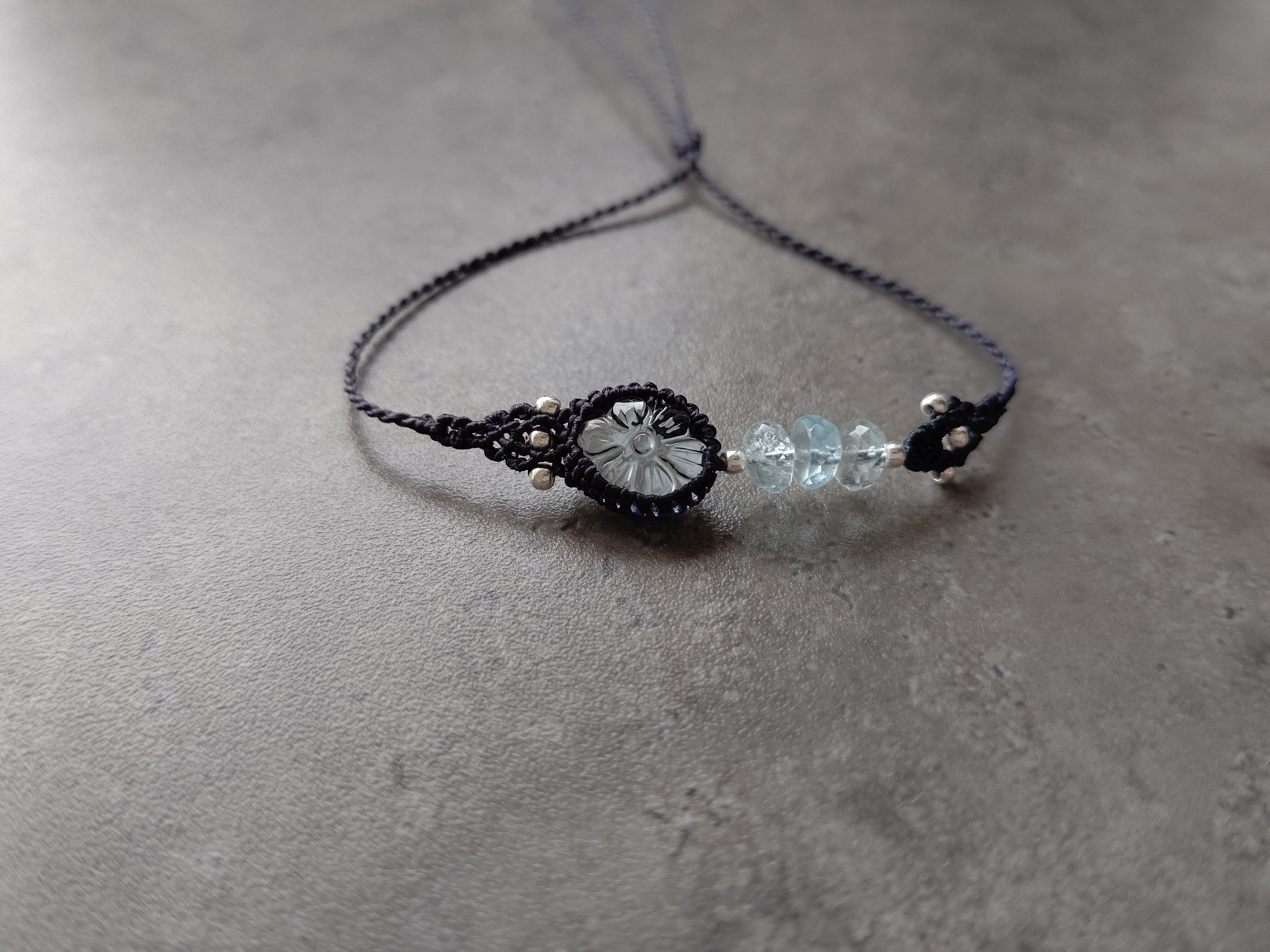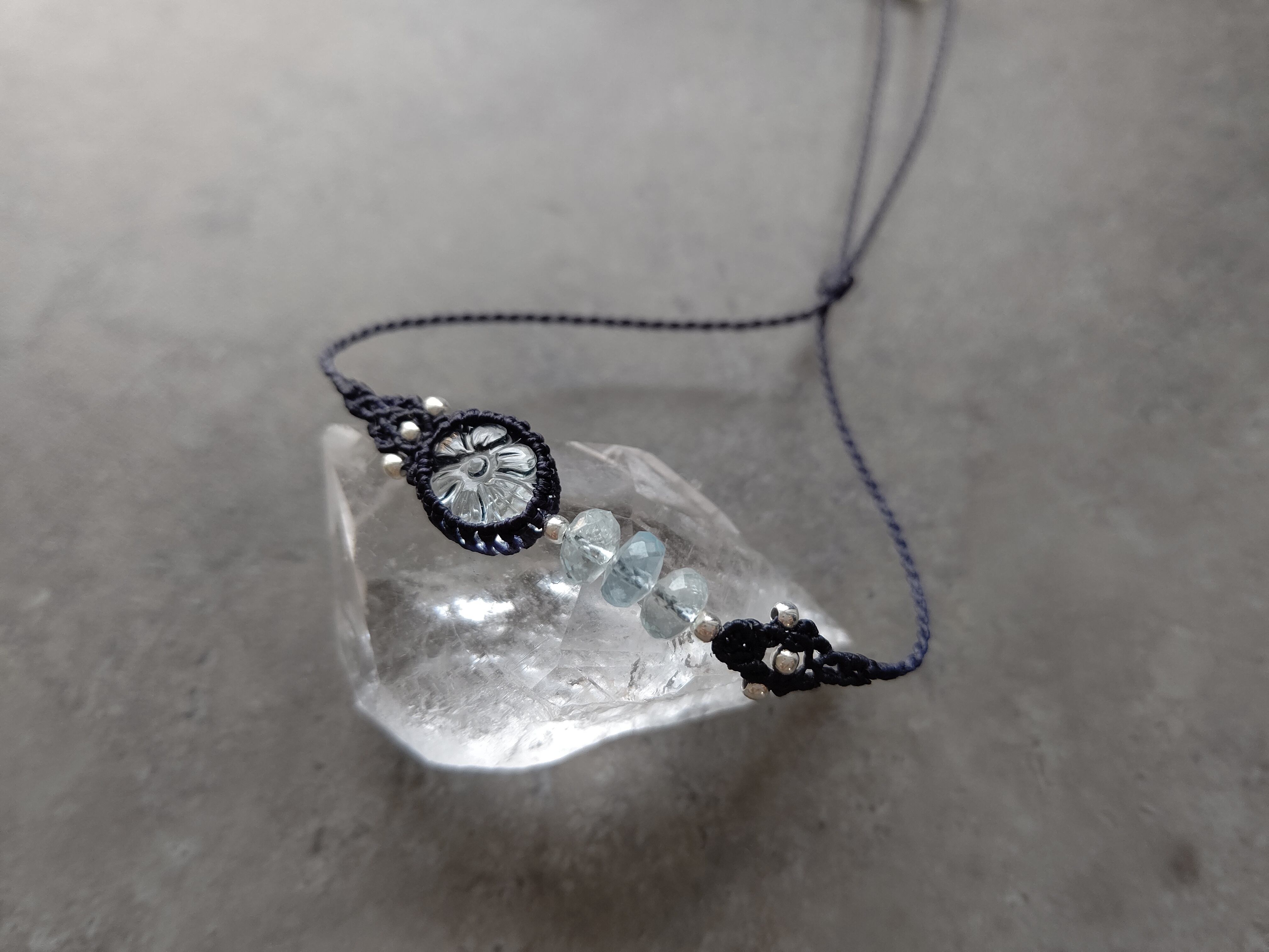 お花模様が丁寧に彫り込まれた水滴のようなアクアマリンをアシンメトリーブレスレットにしました。