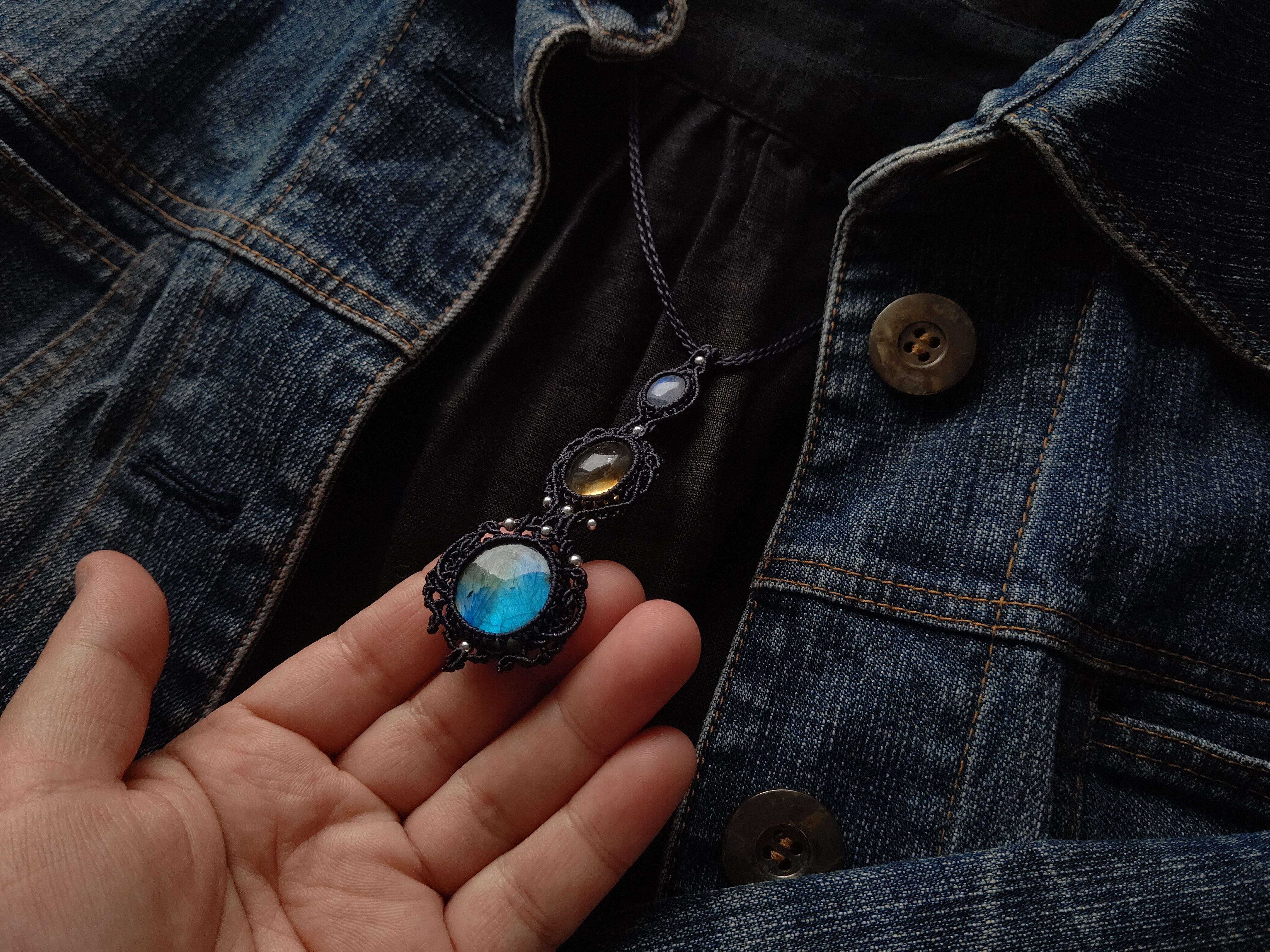シラーのとても美しいマダガスカラル産のラブラドライトとナチュラルシトリン、ホワイトラブラドライトを組み合わせ大ぶりで印象的なマクラメペンダントを製作しました。