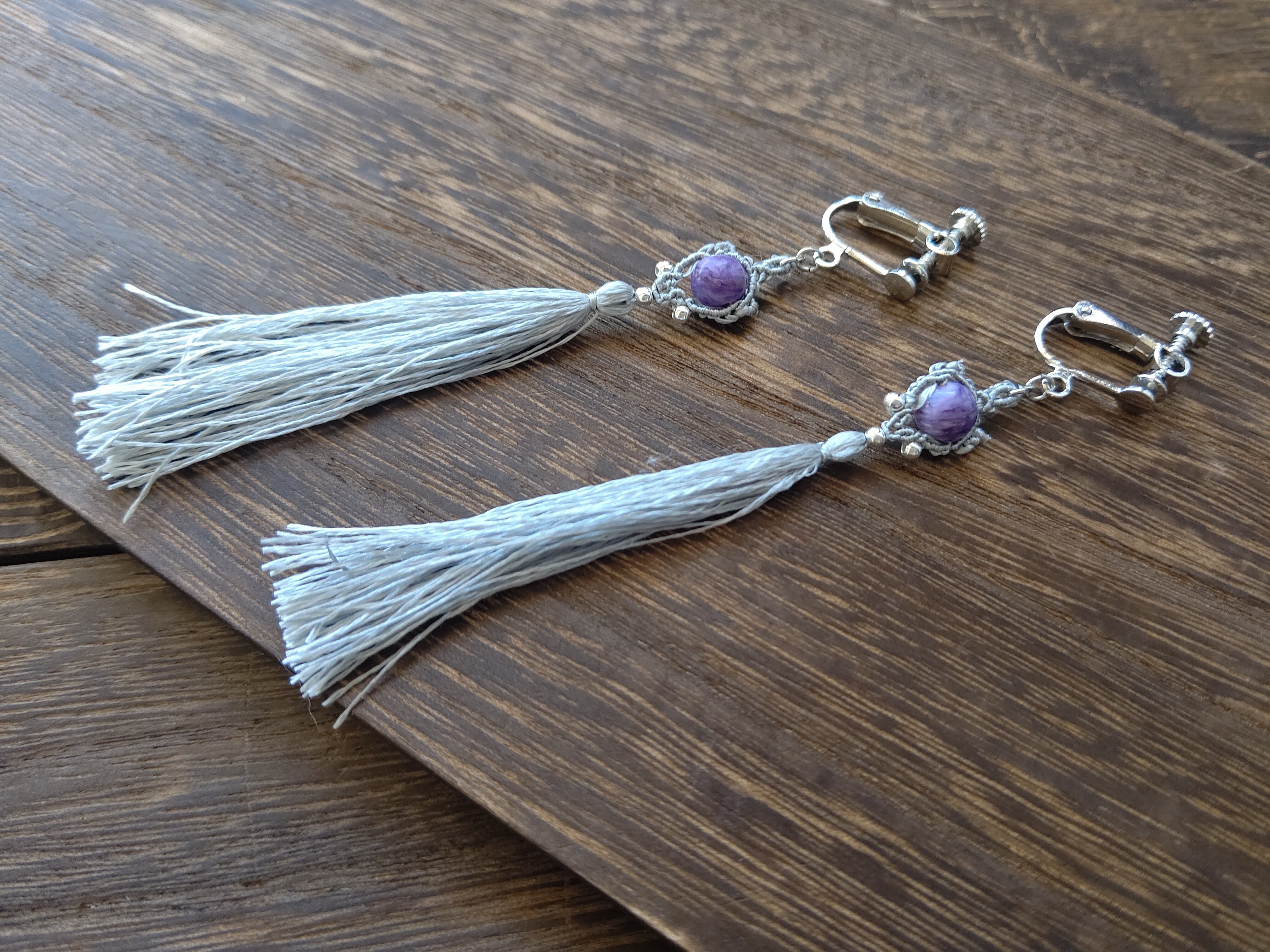 マーブル模様のパープルがとても美しいチャロアイトを絹糸で編み込んで耳飾りにしました。