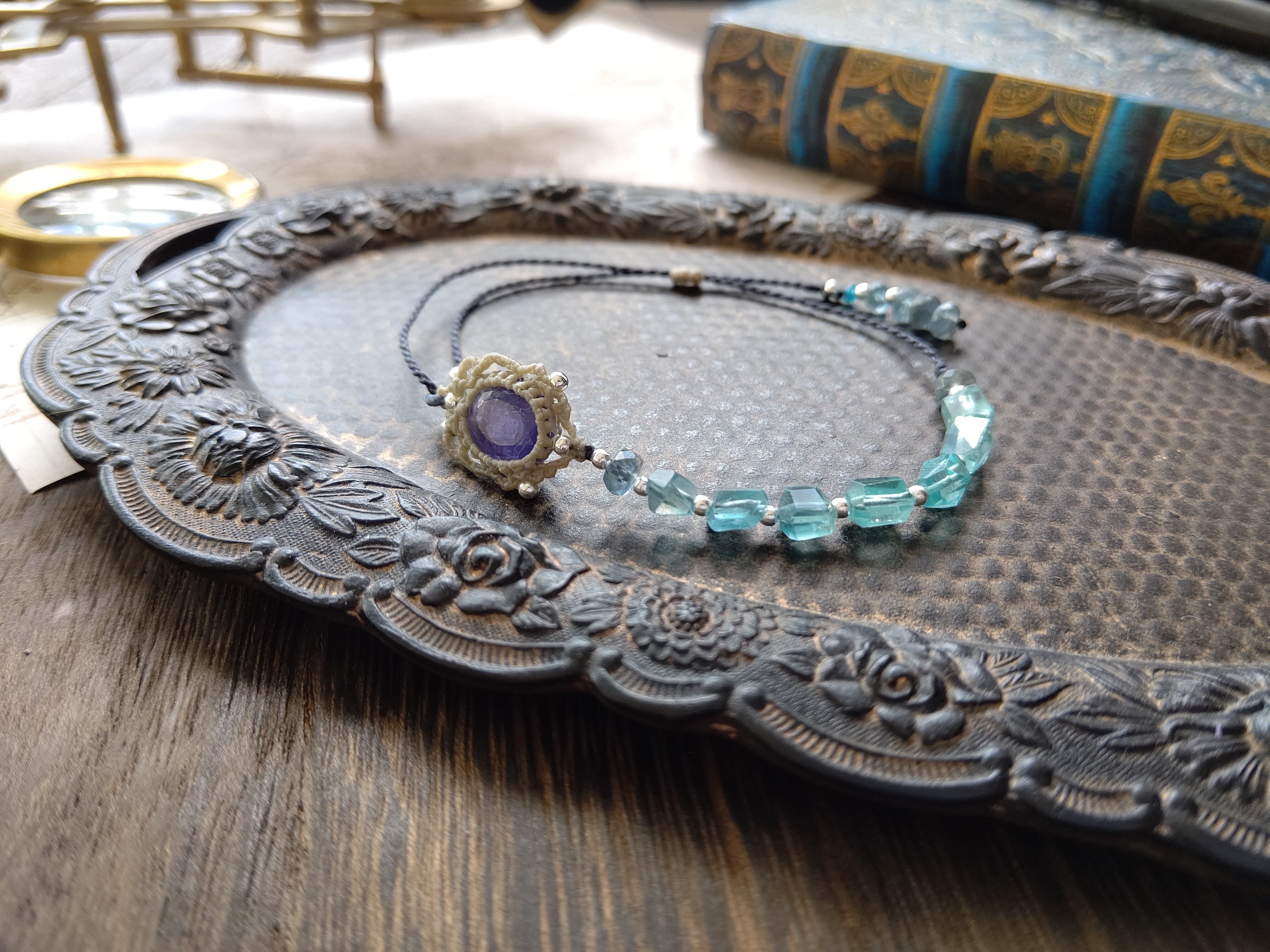 ルースは0.25mmの糸で丁寧に編み込み、縁取りを丁寧に編み込んでいます。ブレスレットのリストの部分には宝石質のアパタイトと宝石質のアクアマリンを通しています。結び石は宝石質のアクアマリンとブルージルコン、アパタイトを編み込んでいます。