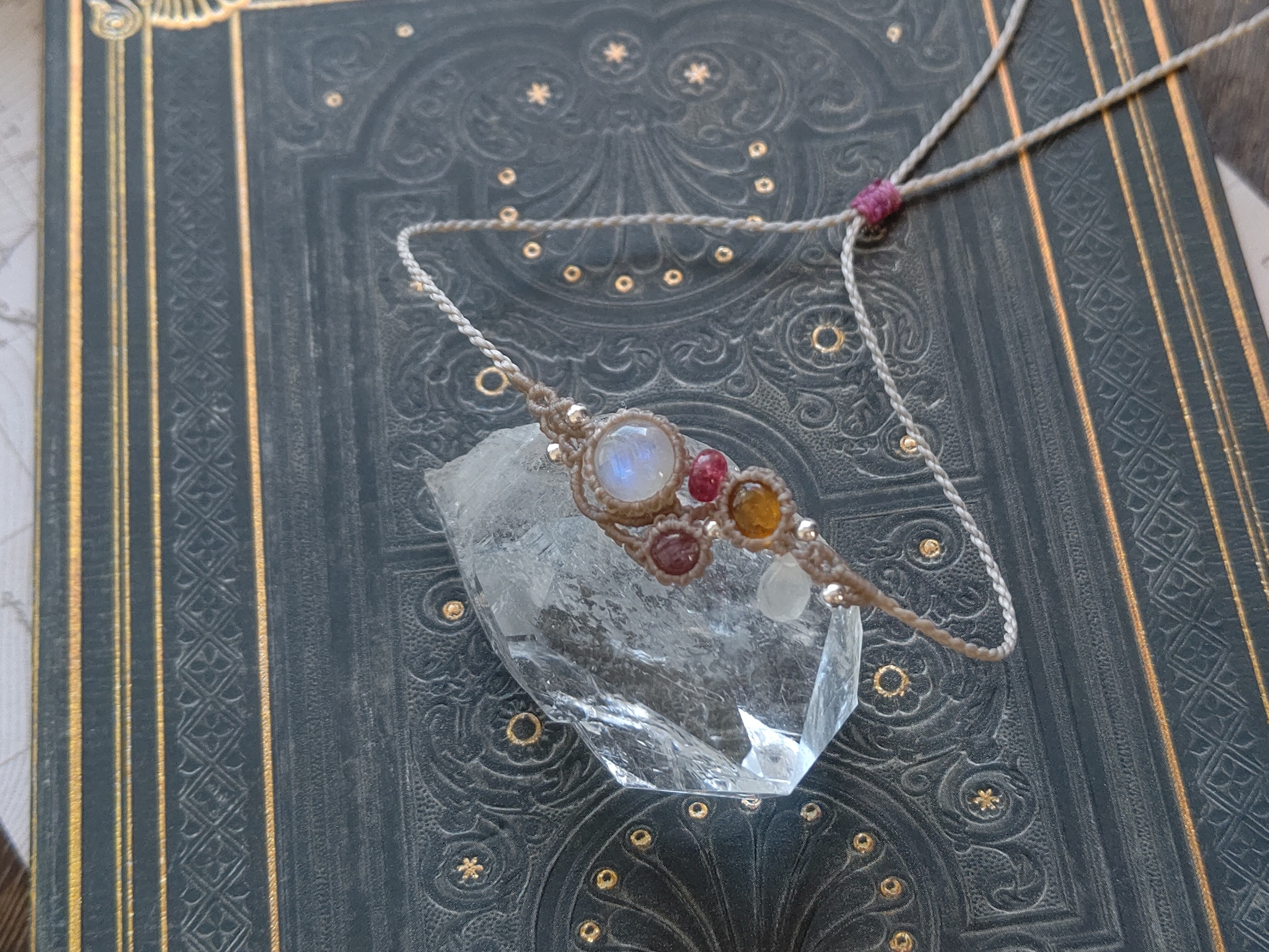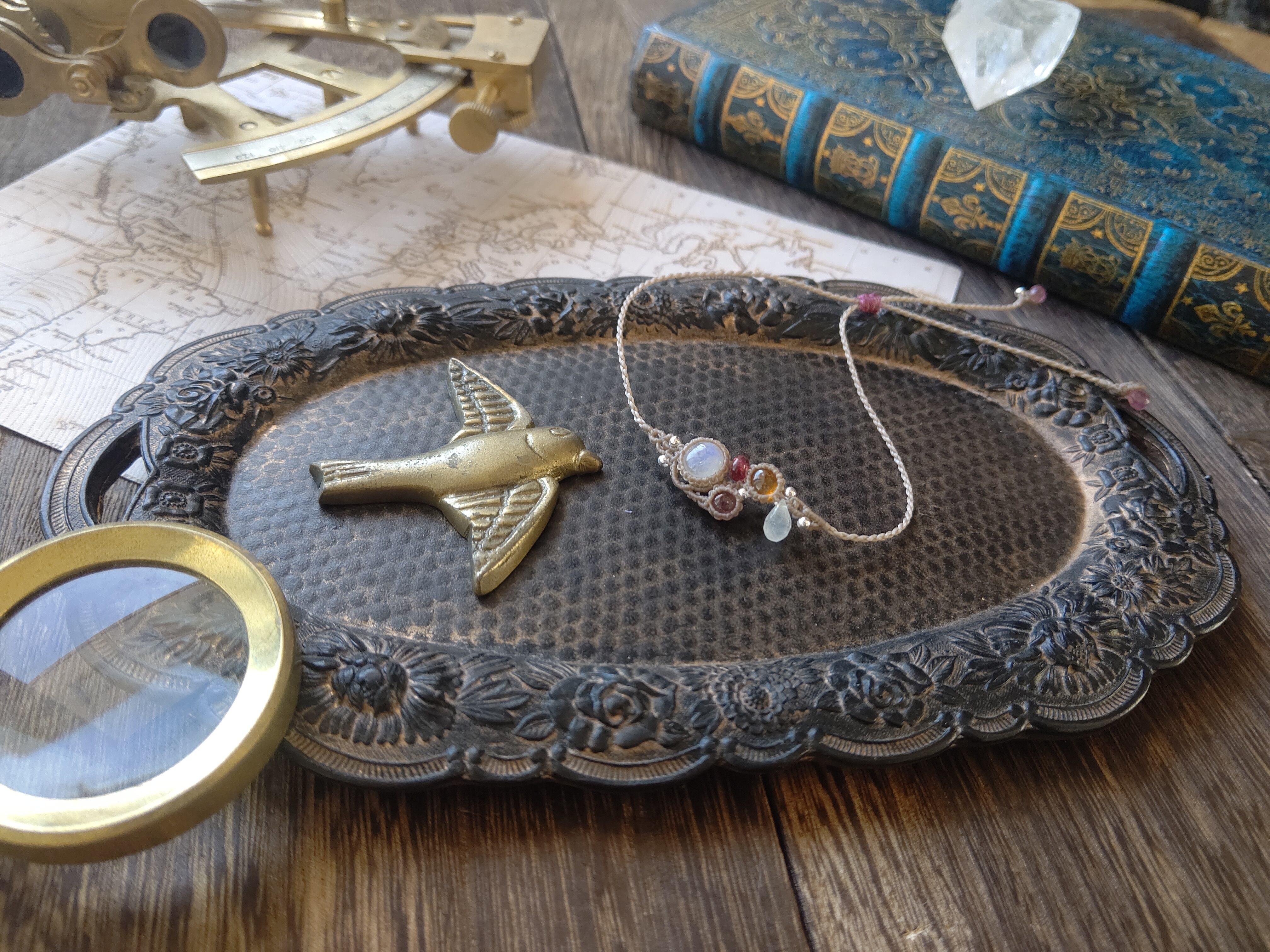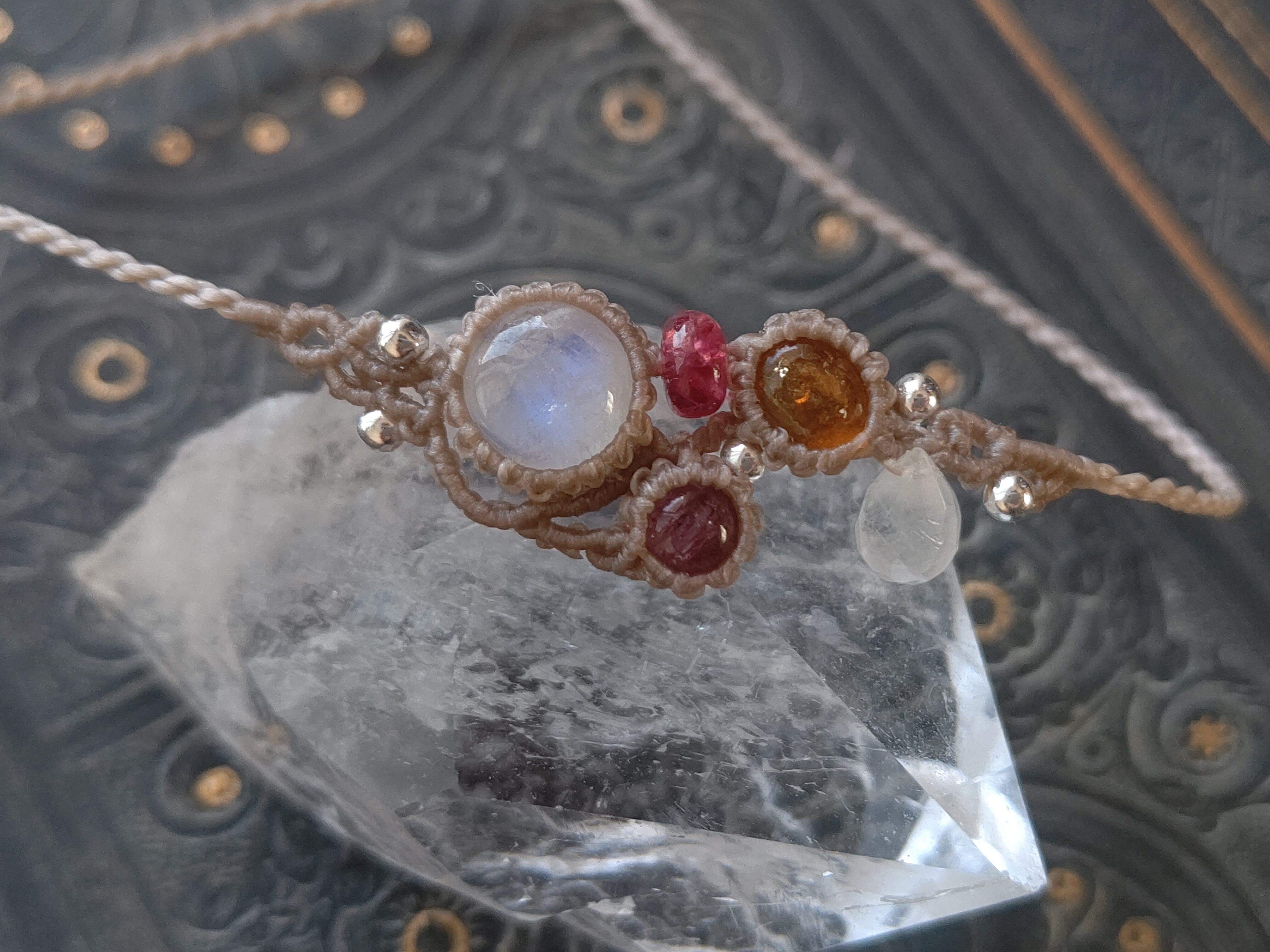 オレンジとピンクのトルマリンとブルーシラーのホワイトラブラドライト、宝石質のレッドスピネル、雫の形のホワイトラブラドライトを組み合わせスッキリとしたデザインの宝石のブレスレットを製作しました。