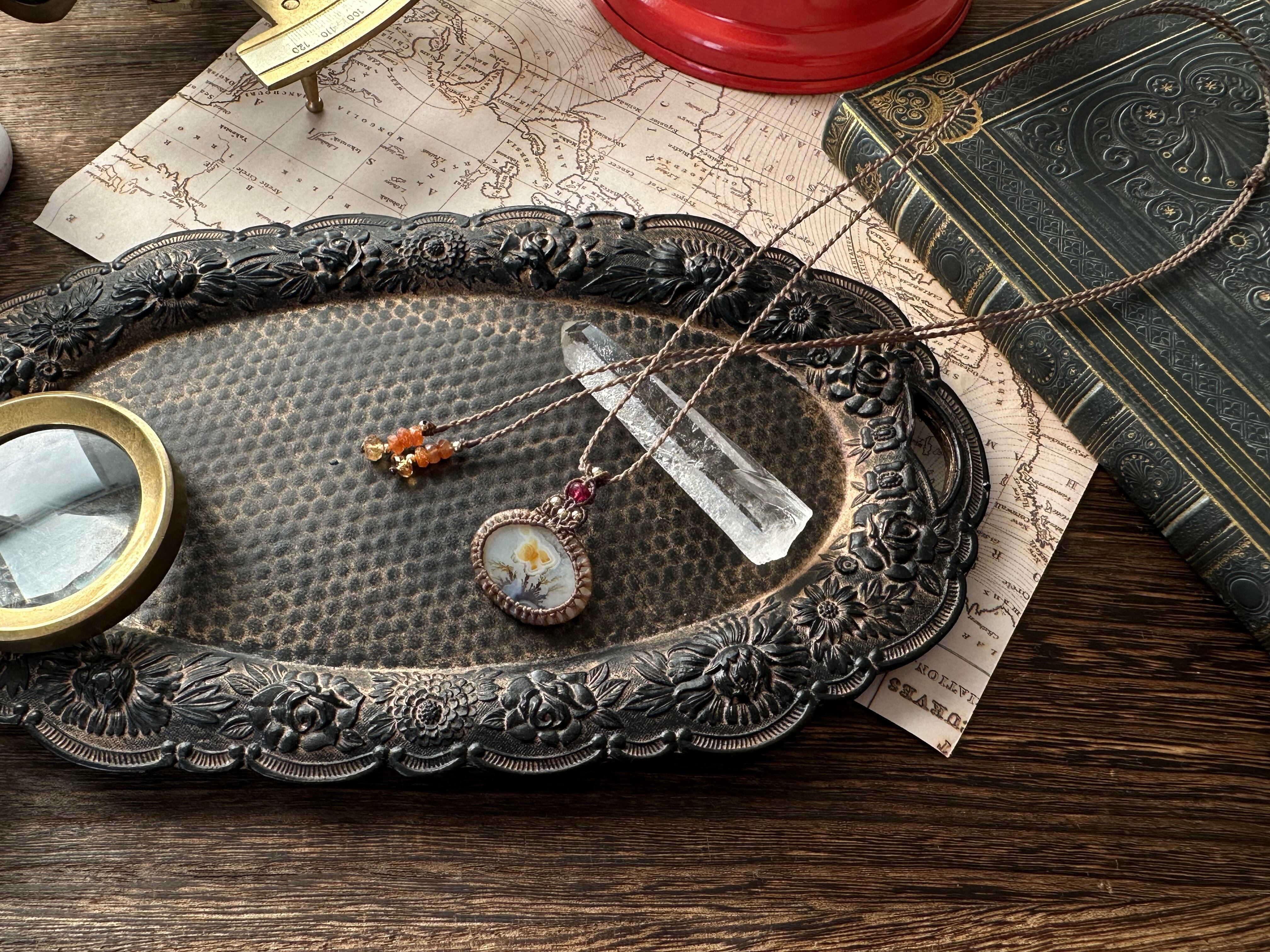 乳白色の少し透明感のある石質に、細筆で丁寧に描いたような樹木のある風景が浮かび上がる魅力的なルースです。見る人によって、感じるもの、見えるものが異なるというのも面白く、たくさんの人を惹きつける人気の天然石でもあります。同じものがこの世に二つとない、自分だけの風景を手に入れられる、という点もコレクター心を刺激する一品ですよね。