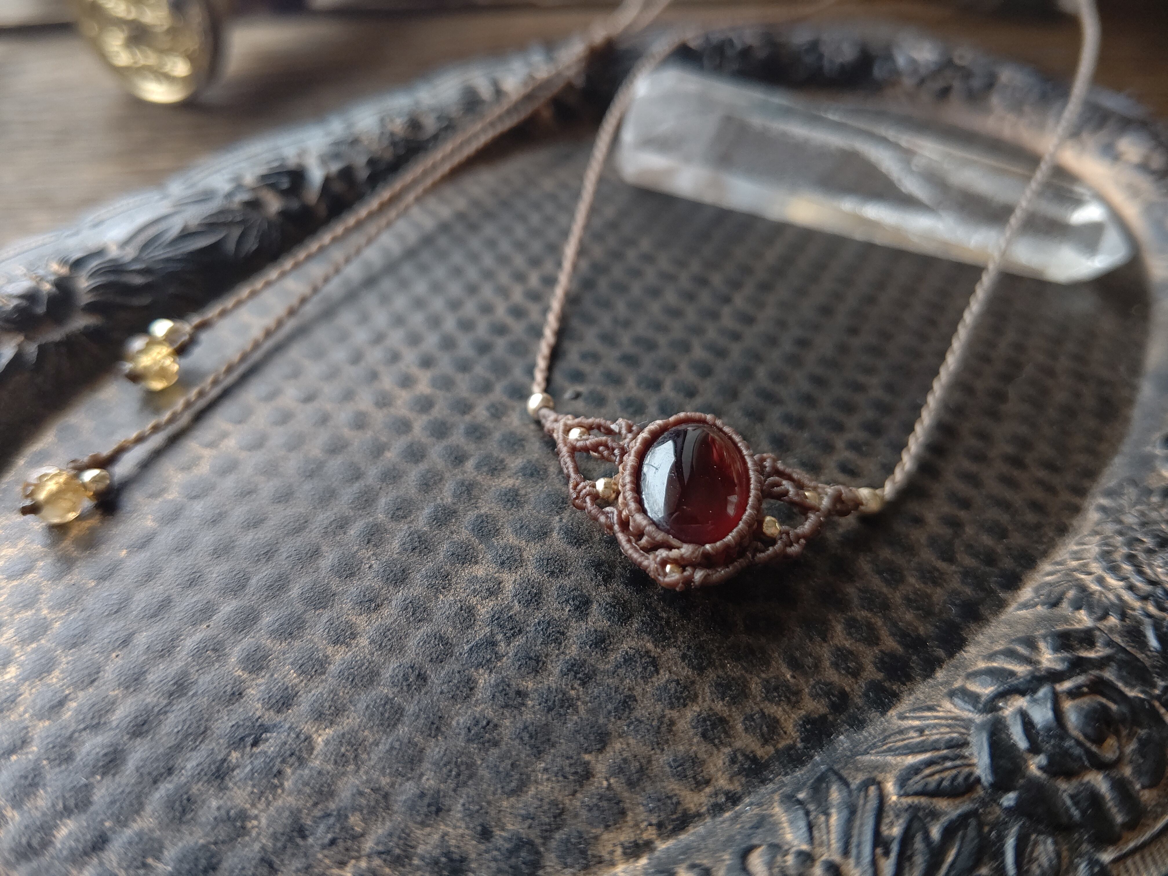 結び石のデザインや石質にもこだわり、見えない部分も宝石感をお楽しみいただけるマクラメアクセサリーならではの仕上がりに致しました。