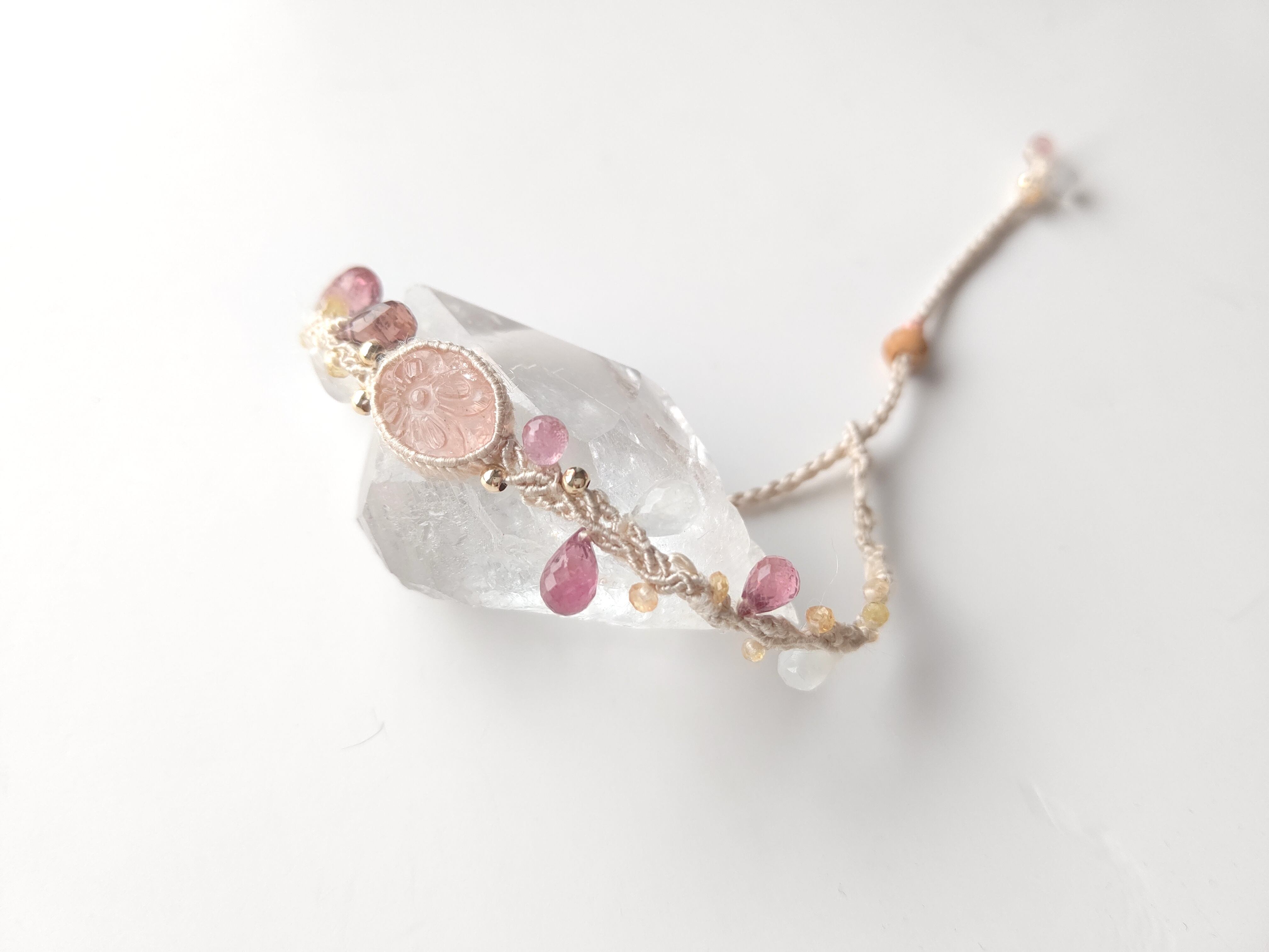 梅の花が恋しい、桜に思いを馳せる冬の只中ではありませんが、ふんわり春を連想させる美しいモルガナイト絹糸で丁寧に編み込みブレスレットに仕立てました。