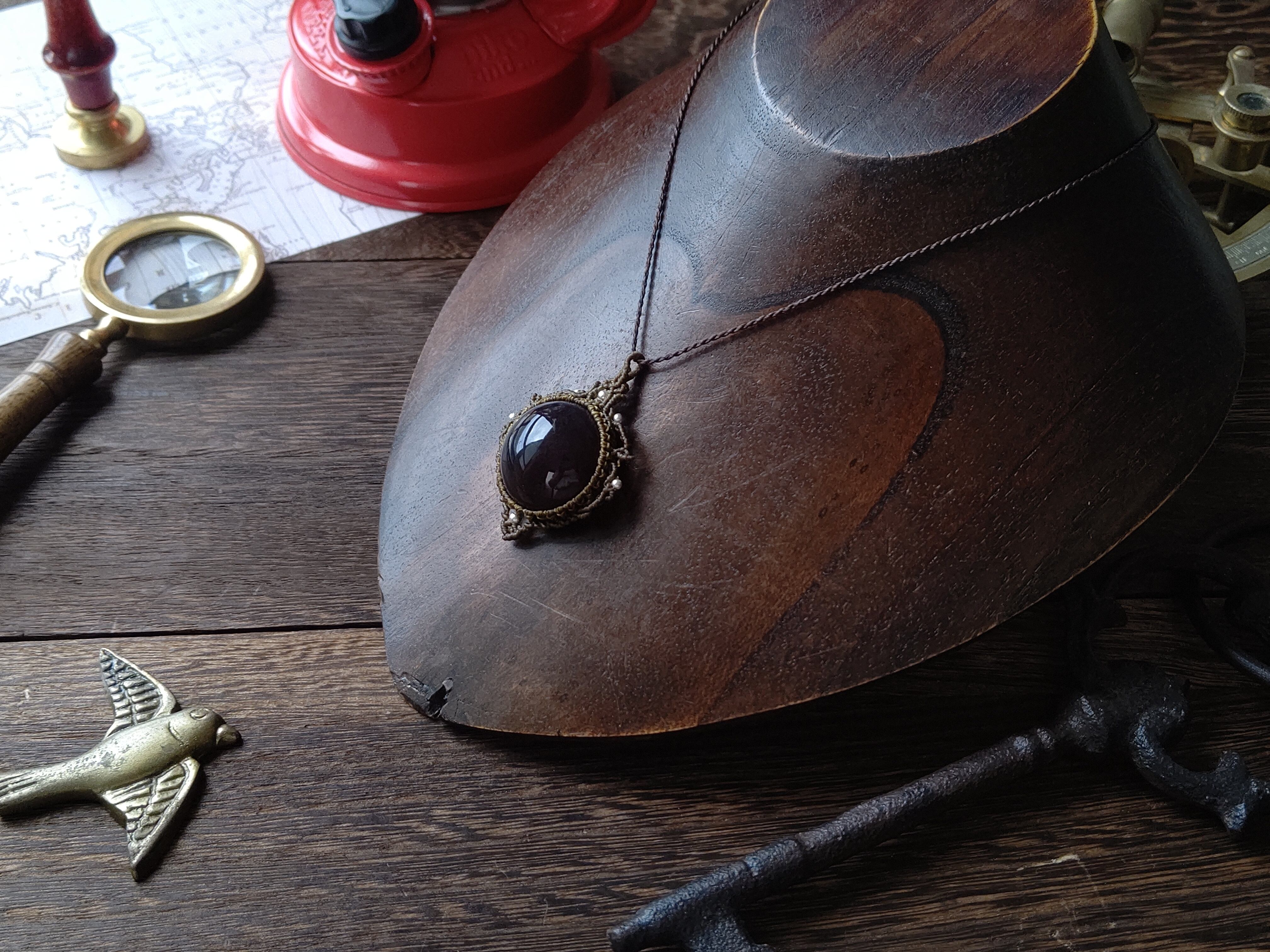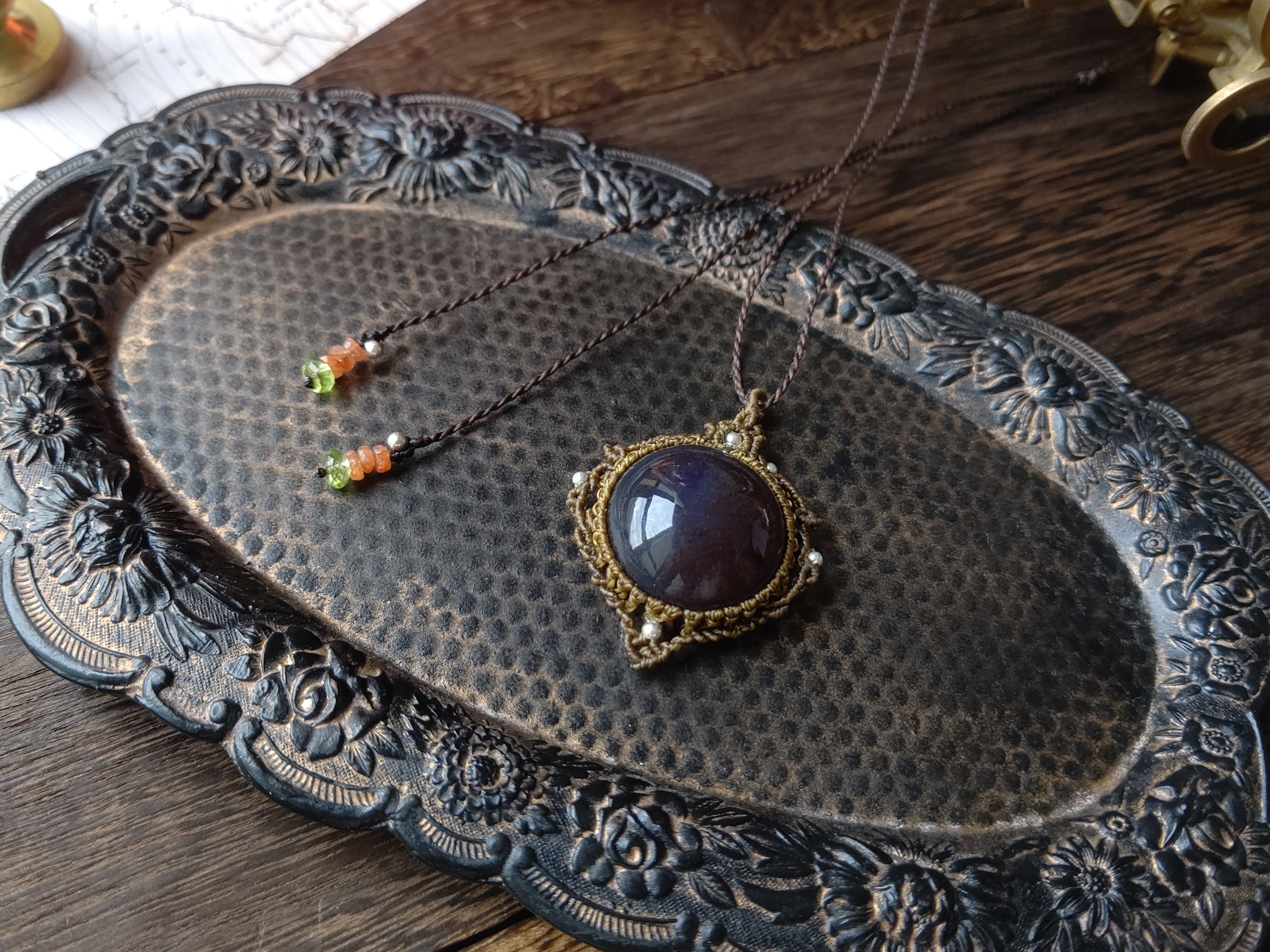 大粒でぽってりとした粒感が美しい、深いコニャック色のブルーアンバーをエレガントなデザインのマクラメペンダントにしました。