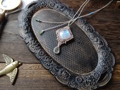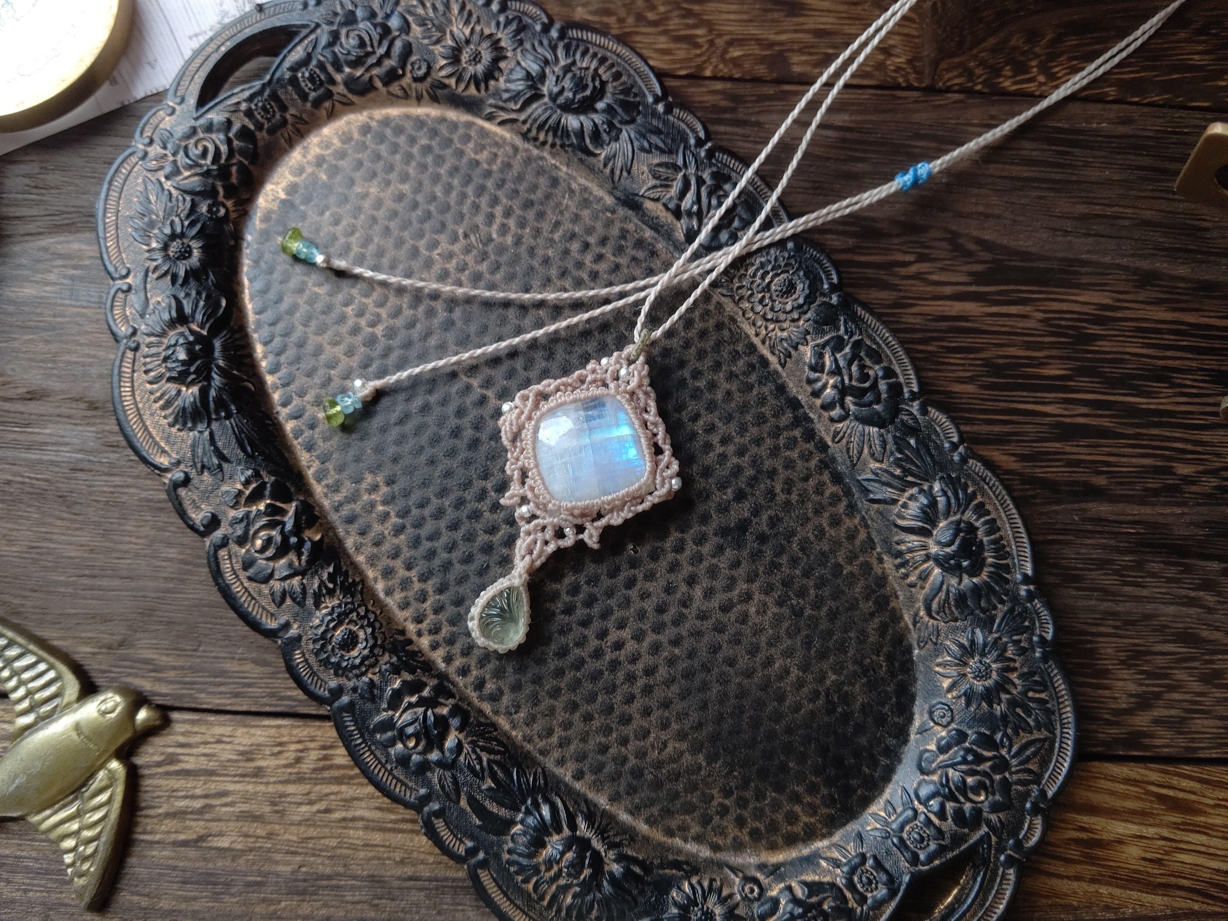 レインボームーンストーンと羽模様のグリーンベリルのペンダント